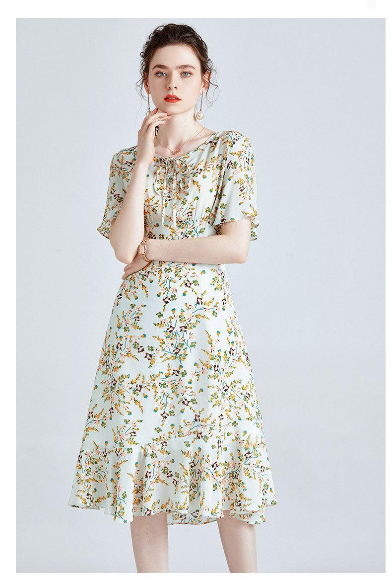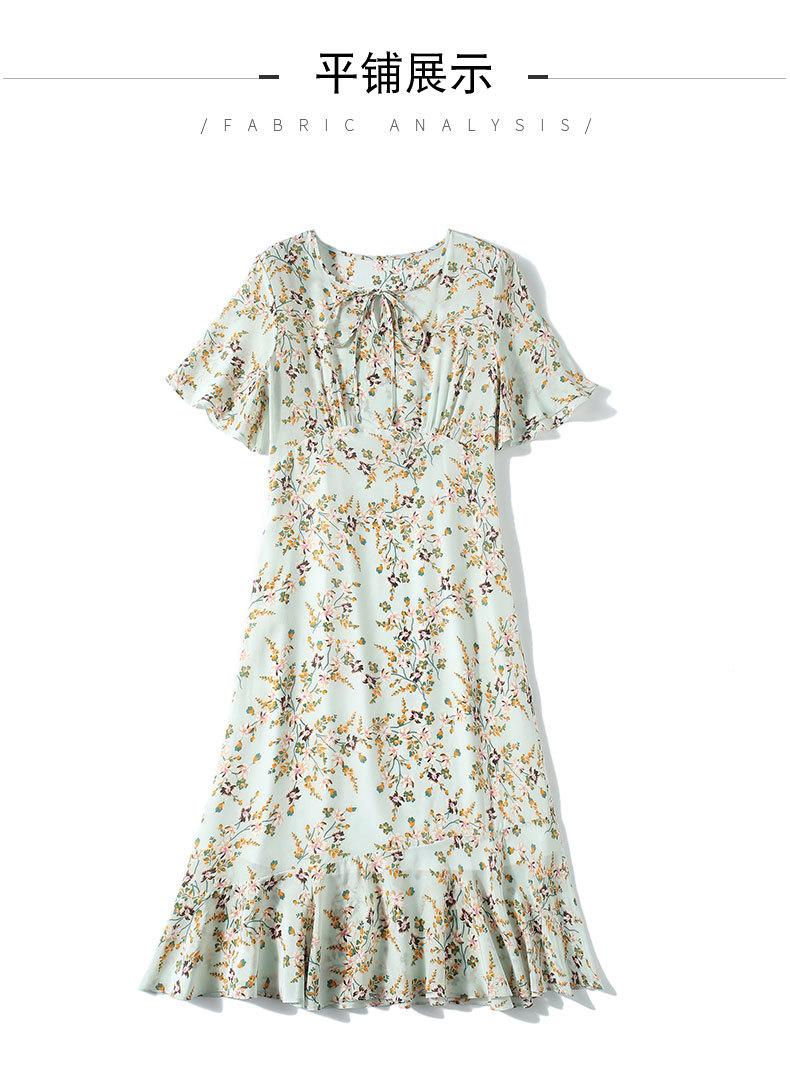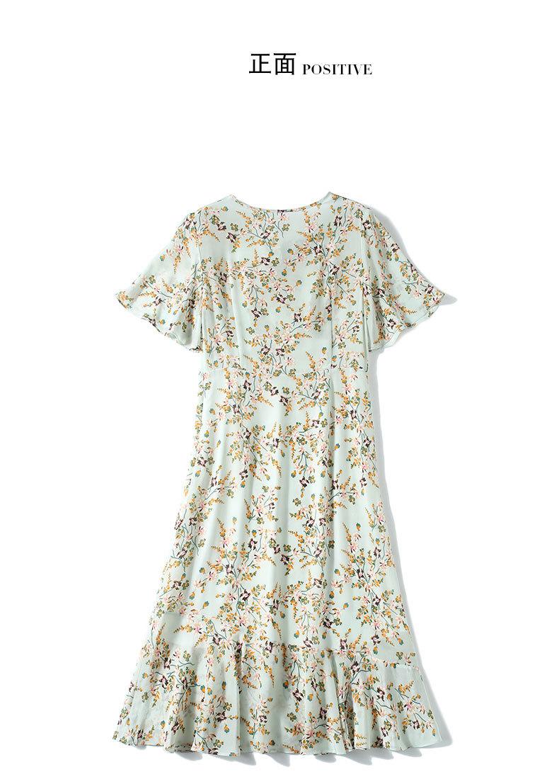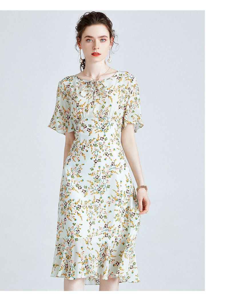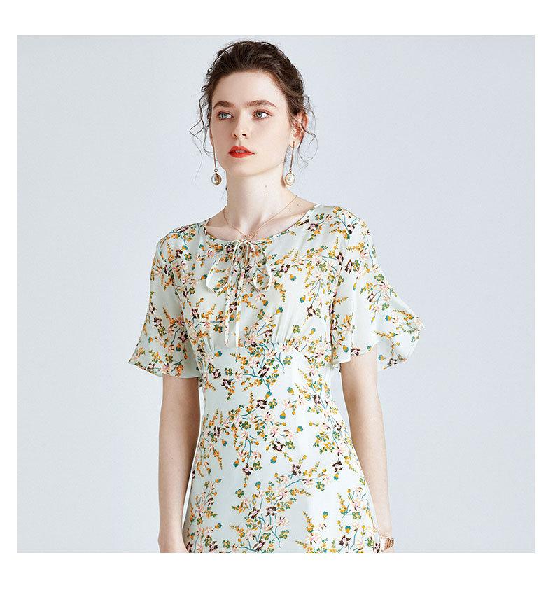Vestido de Seda Seda de Morera Elegante Estampado Manga Corta Vestido Francés de Verano de Aspecto Juvenil como de Hada Cintura Adelgazante Falda Midi