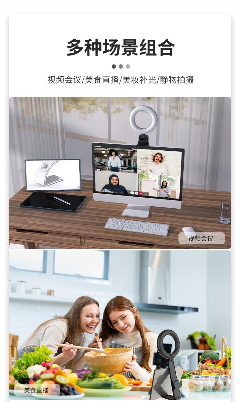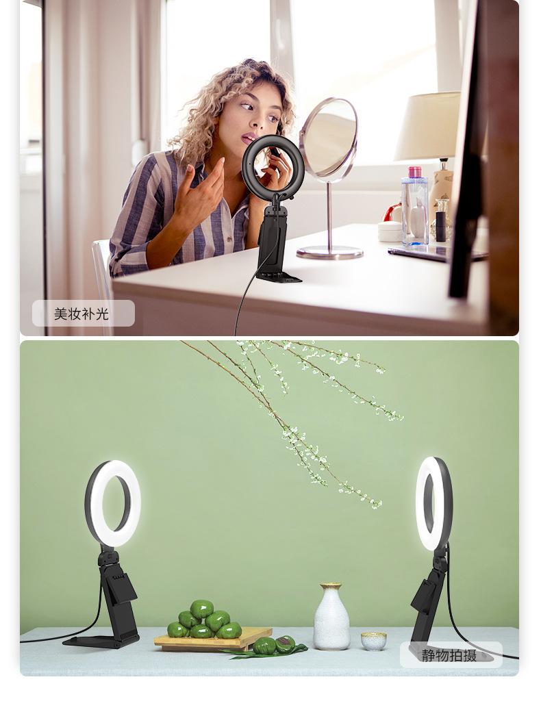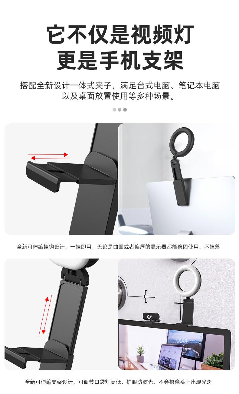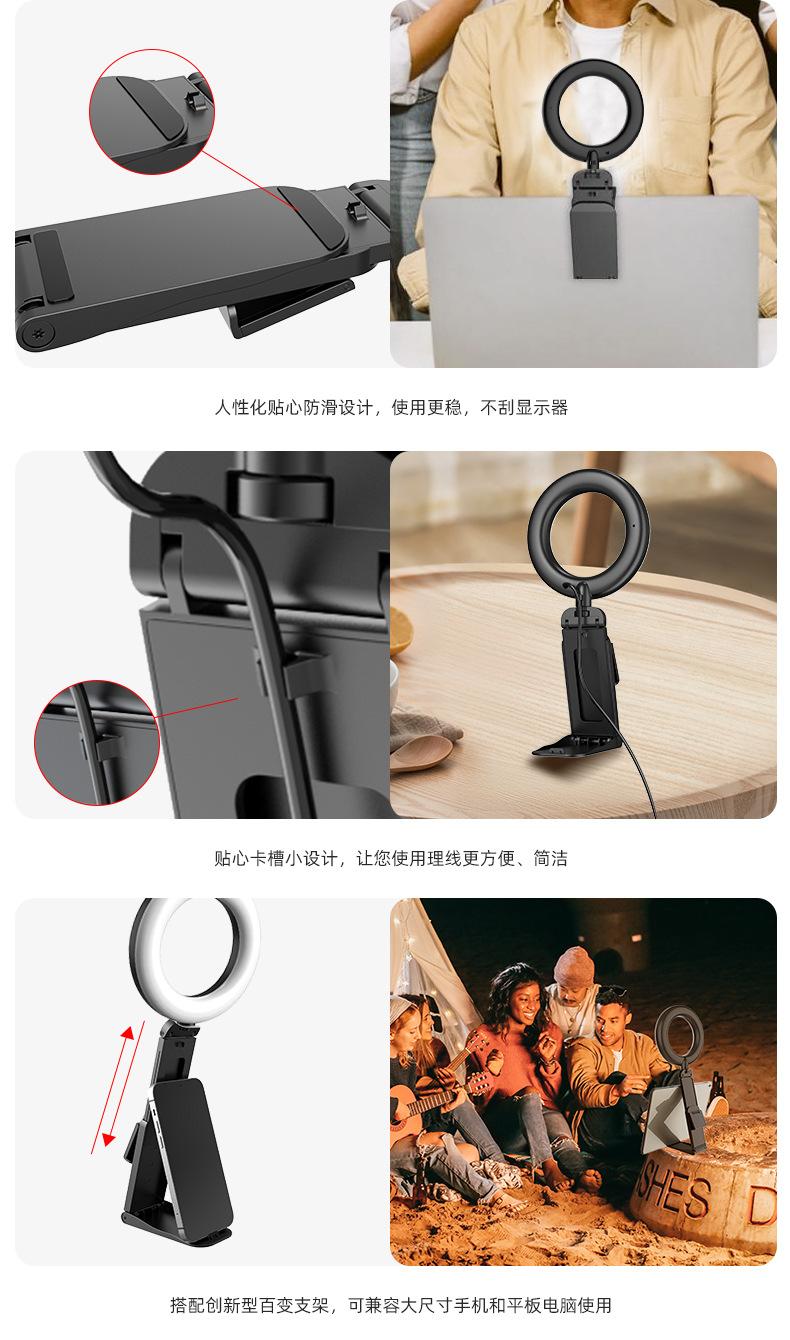 Adecuado para usar en computadoras de escritorio, laptops, computadoras de escritorio y otros dispositivos, ya sea para luz de relleno para transmisión en vivo, luz de relleno para videollamadas o iluminación para fotografía. Con un clip plegable, también se puede usar como soporte para teléfono, logrando verdaderamente múltiples usos en uno.