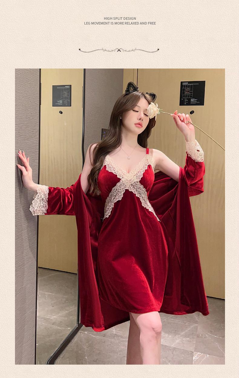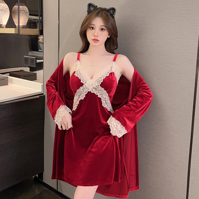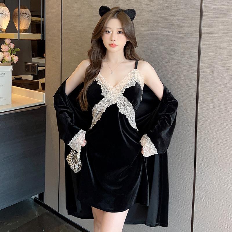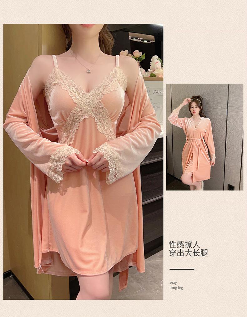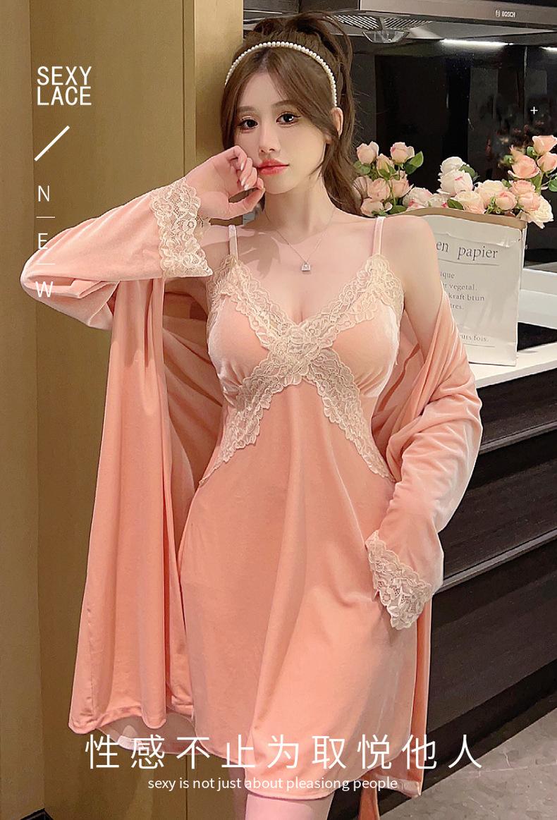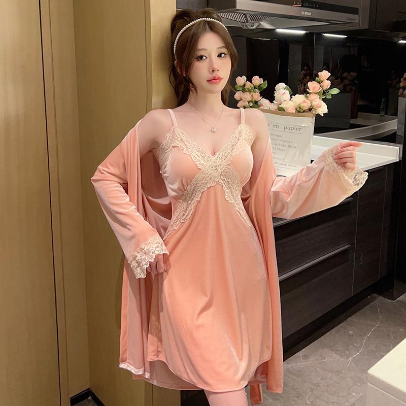 Pijama de terciopelo dorado para mujer, nuevo otoño e invierno, con almohadilla para el pecho, camisón sexy de dos piezas con encaje, estilo Pure Desire, ropa para el hogar