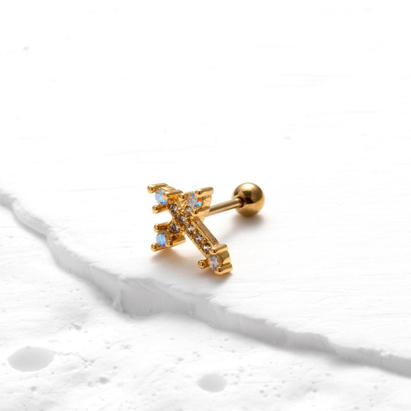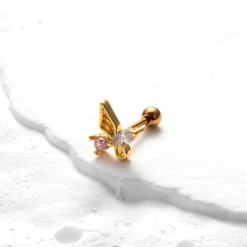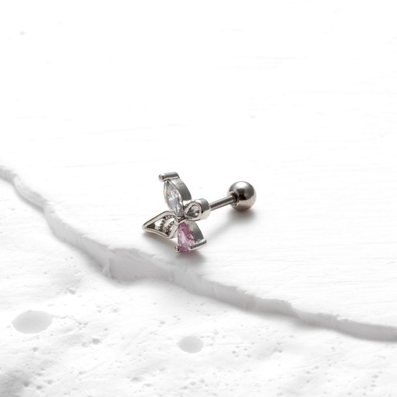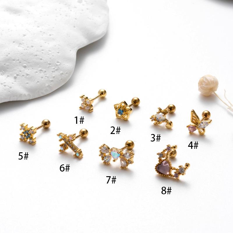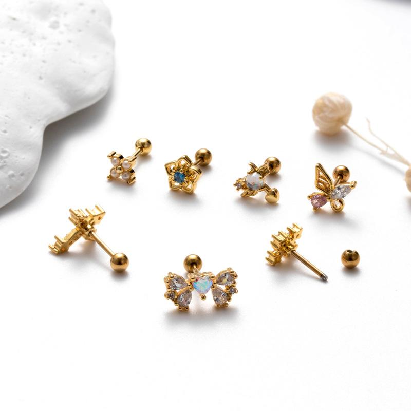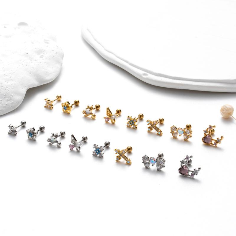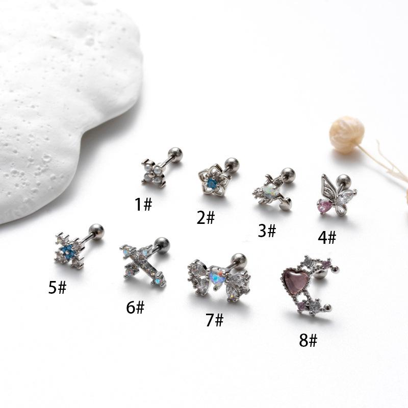 nombre del producto | Nuevos aretes de tornillo de doble cabeza de acero inoxidable, aretes de varilla delgada con cruz, mariposa, circonita, moda, versátiles, clavo para cartílago de oreja, individual |