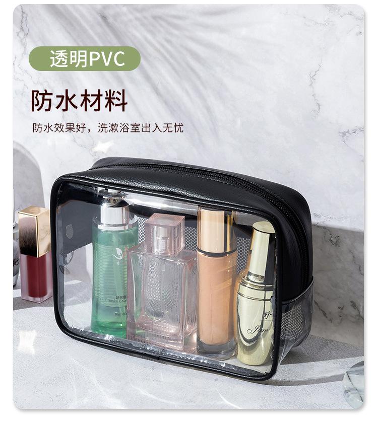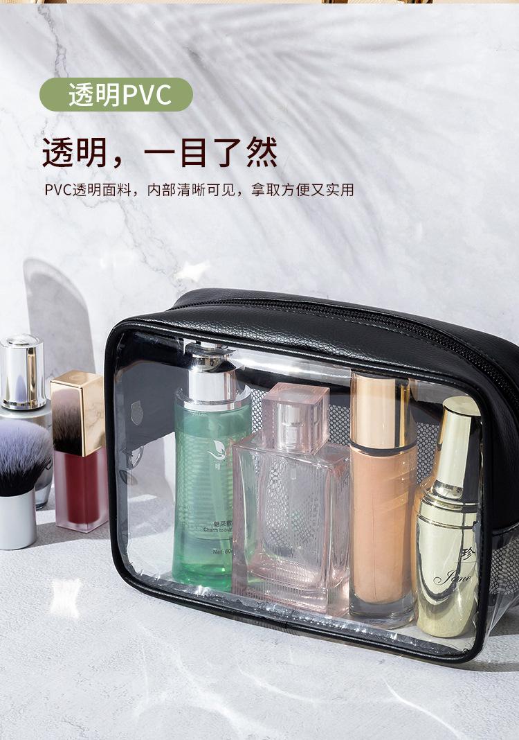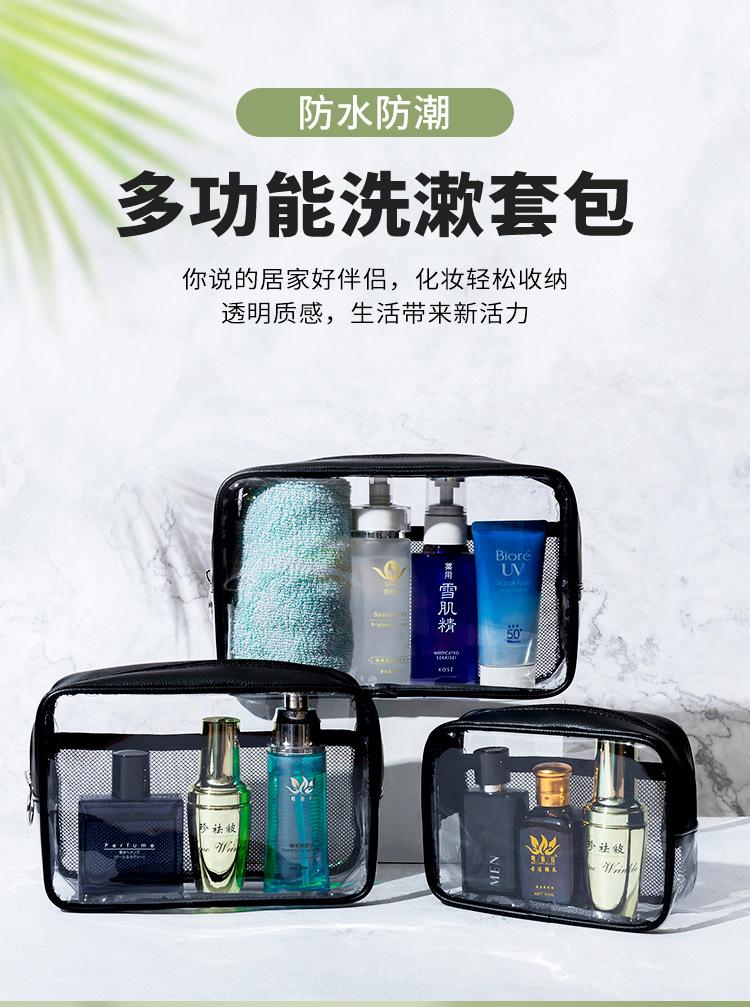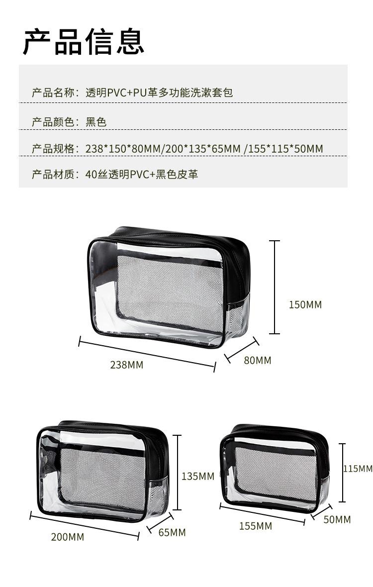 Compra Neceser transparente de PU de tres piezas para cosméticos, gran capacidad, de PVC, portátil, impermeable, para viaje, color negro al por mayor en Joom.pro