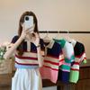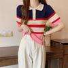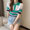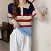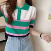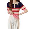 Camisa polo de seda helada a rayas de color con solapa y cuello pequeño para mujer, estilo nuevo de verano 2023, camiseta fina de punto a la moda