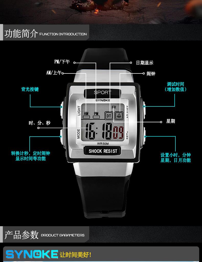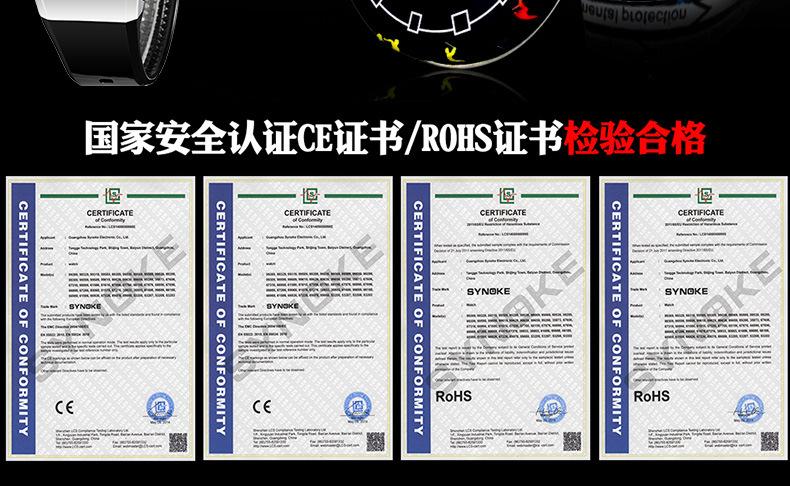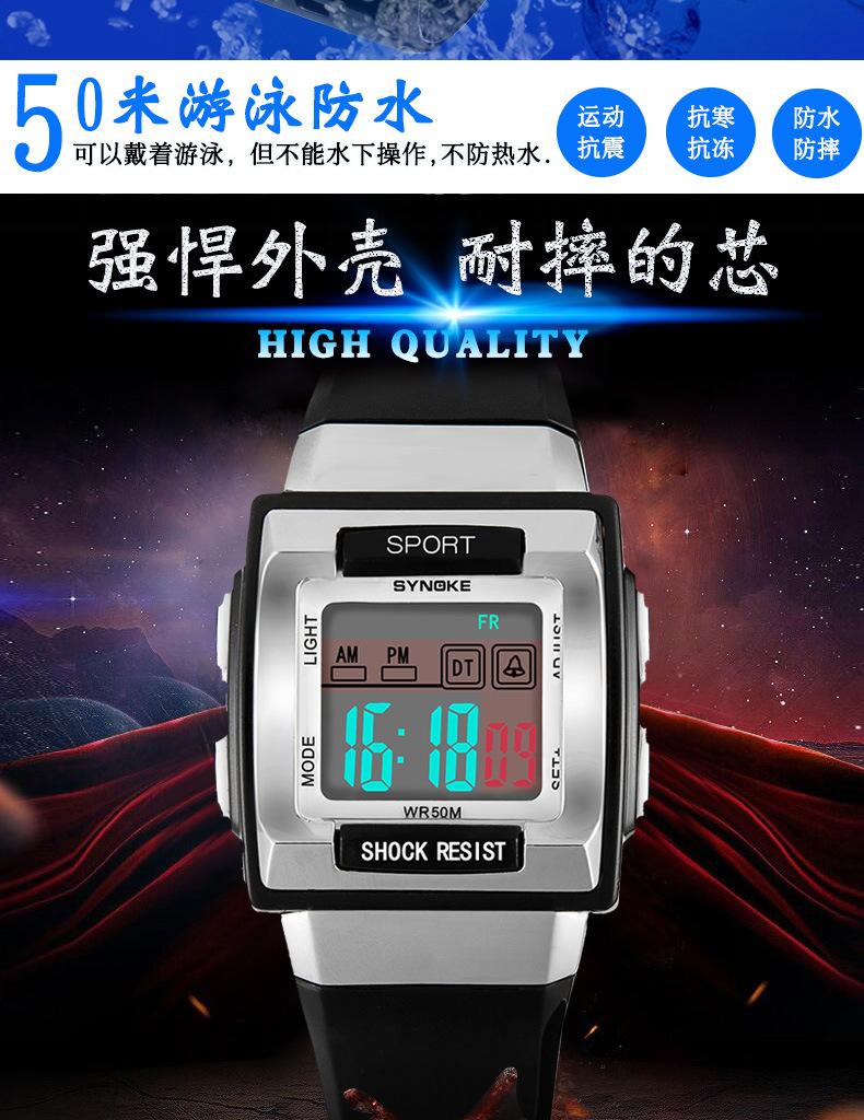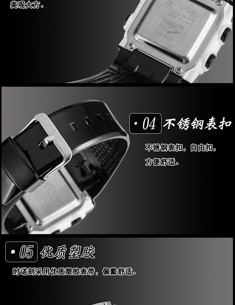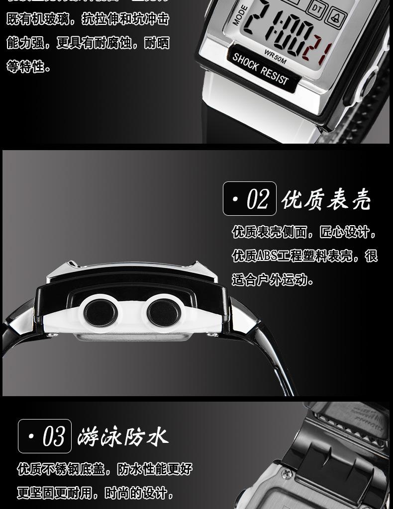 | Material | Caja de reloj de plástico ABS de alta calidad, correa de plástico PU de alta calidad, espejo de resina acrílica engrosada y endurecida, cubierta inferior de acero inoxidable, hebilla de acero inoxidable. |