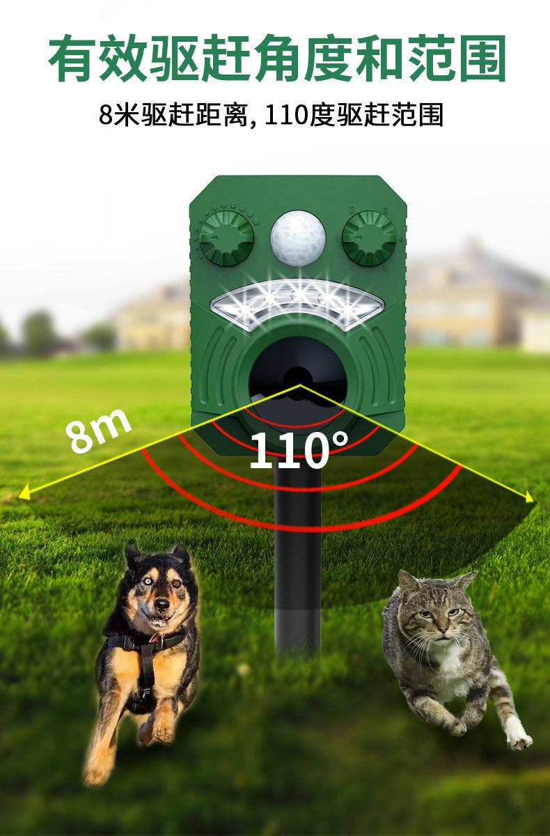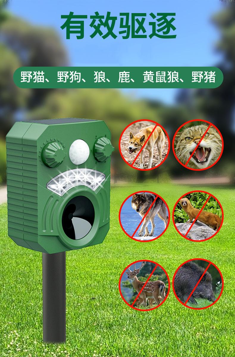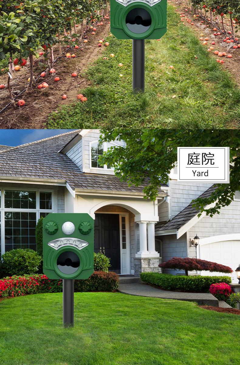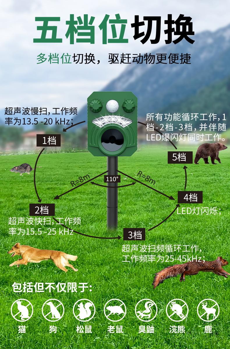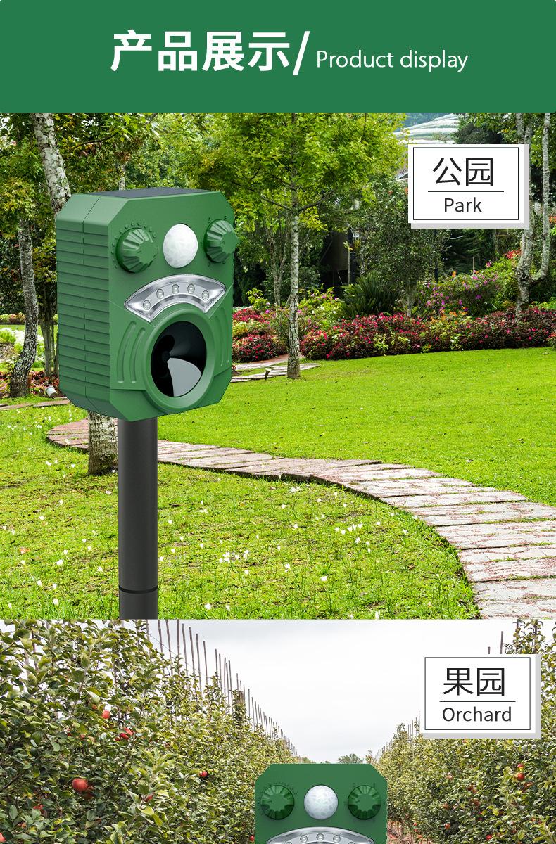 cuando entran los animalesSensor PIRrango,ultrasonidose activará. Señal ultrasónica fuertePuede actuar sobre el sistema auditivo y el sistema nervioso de los animales,causando incomodidad y desagrado,y huyó de la escena。