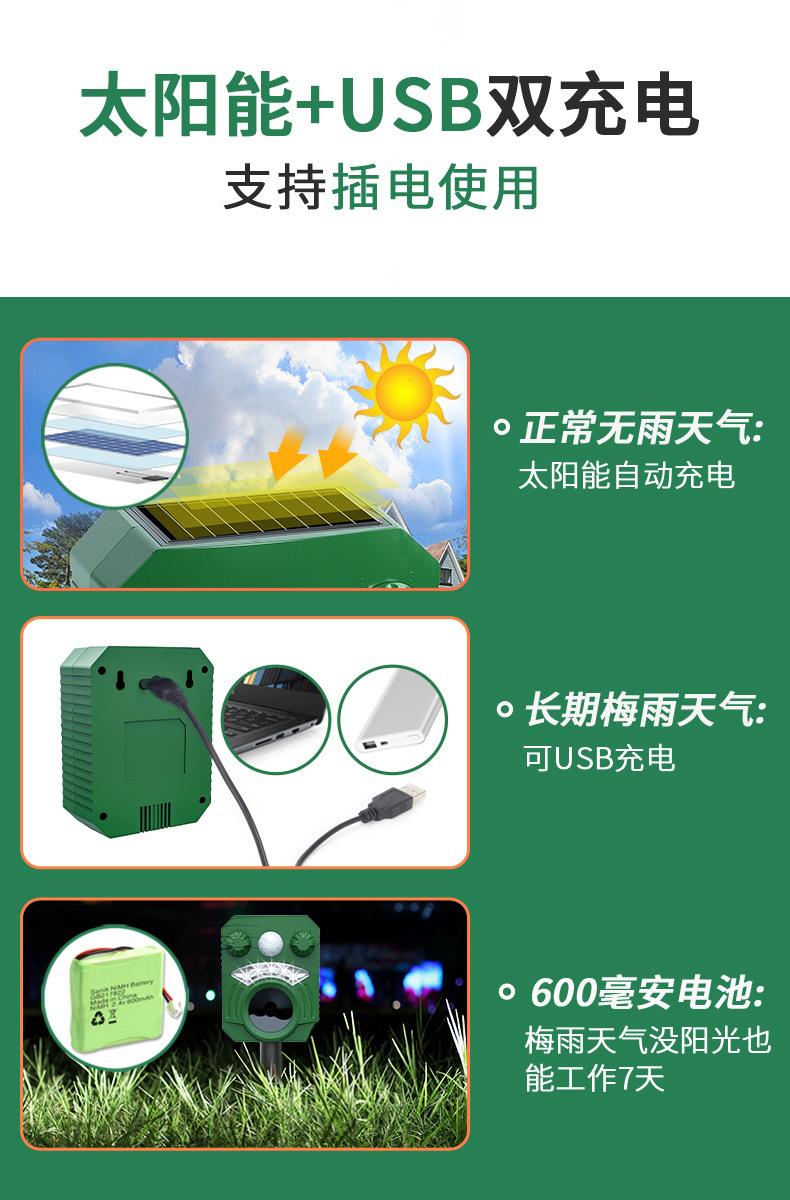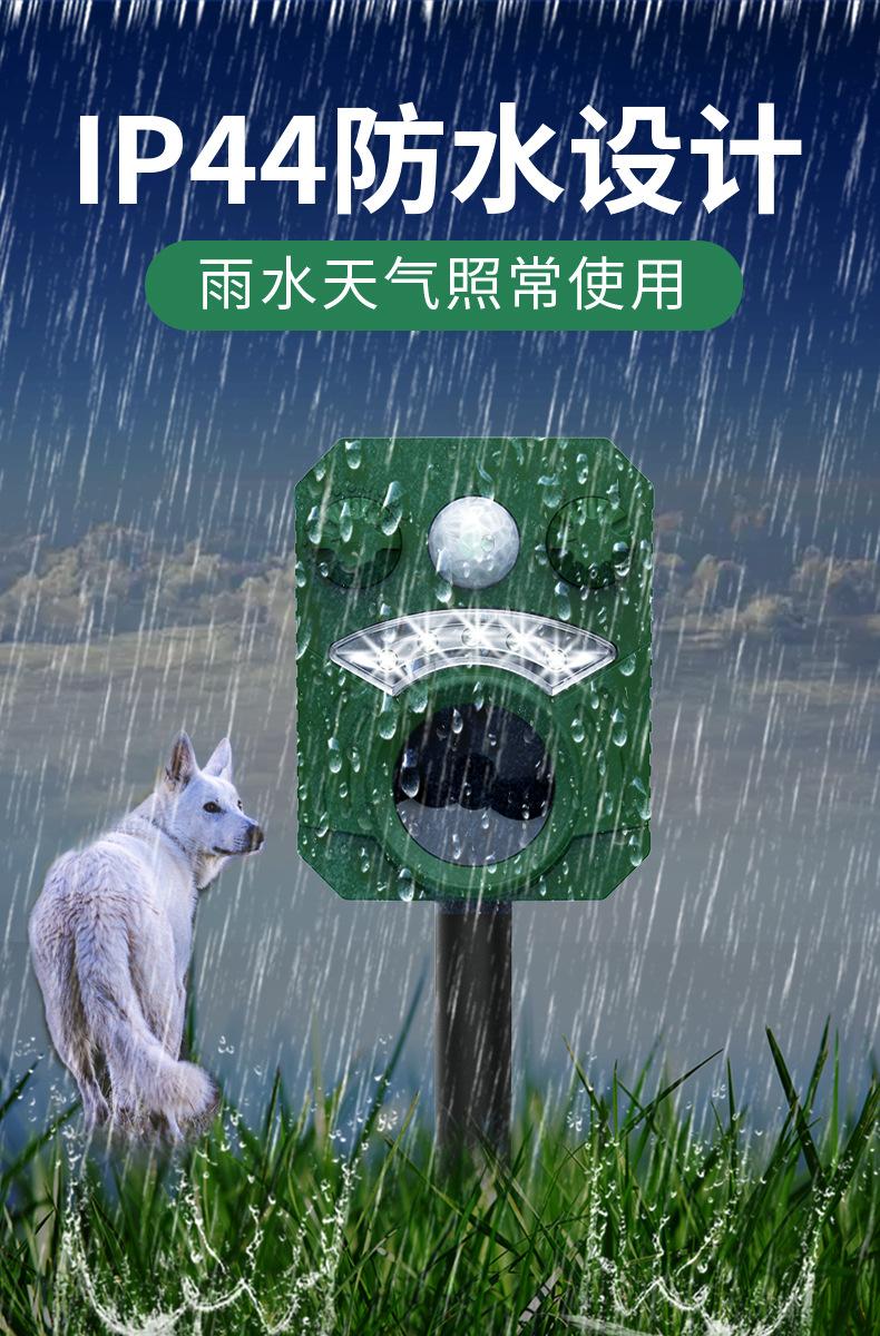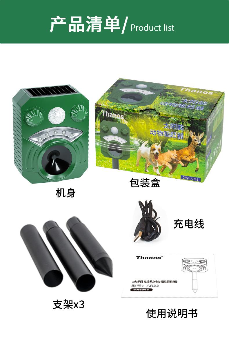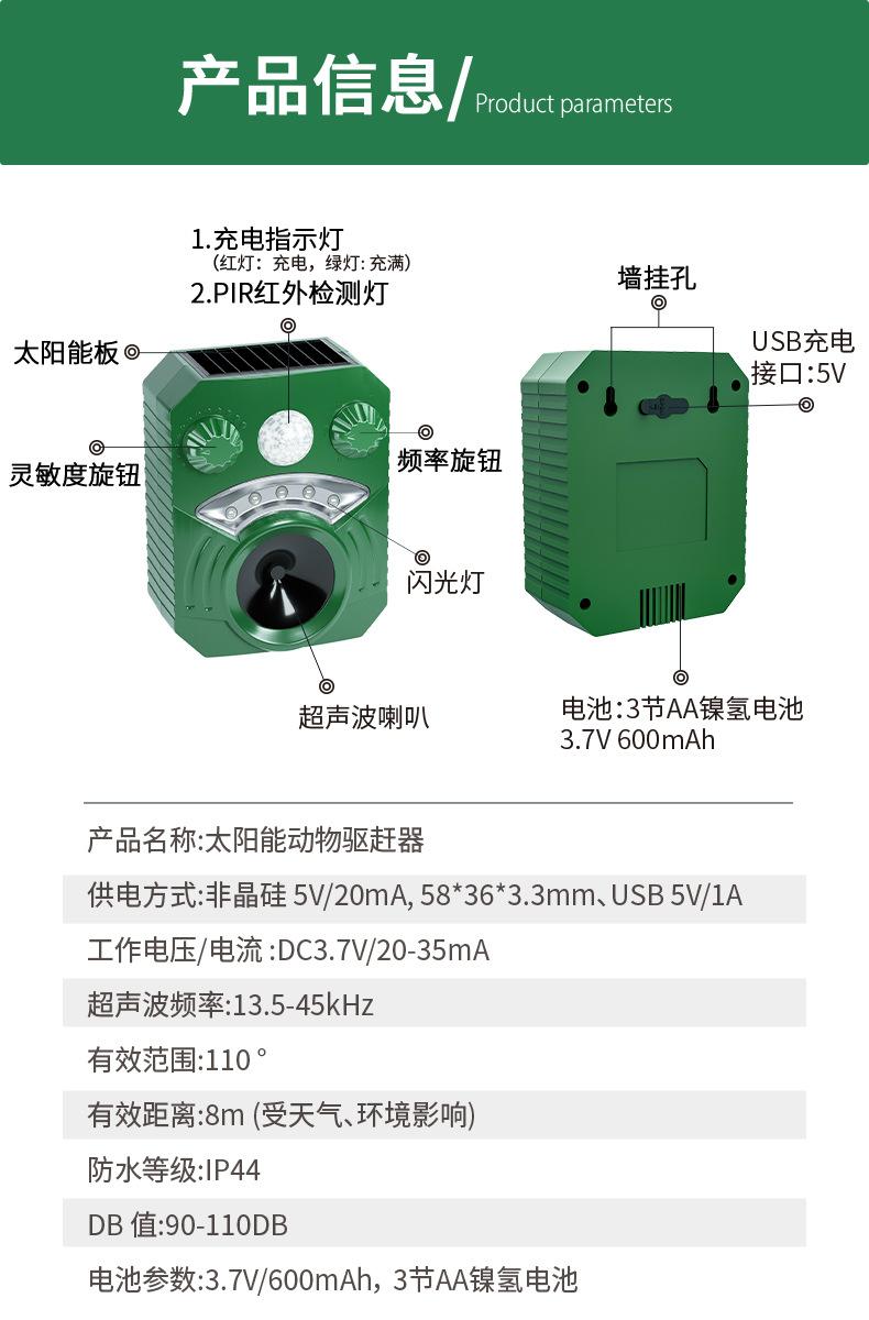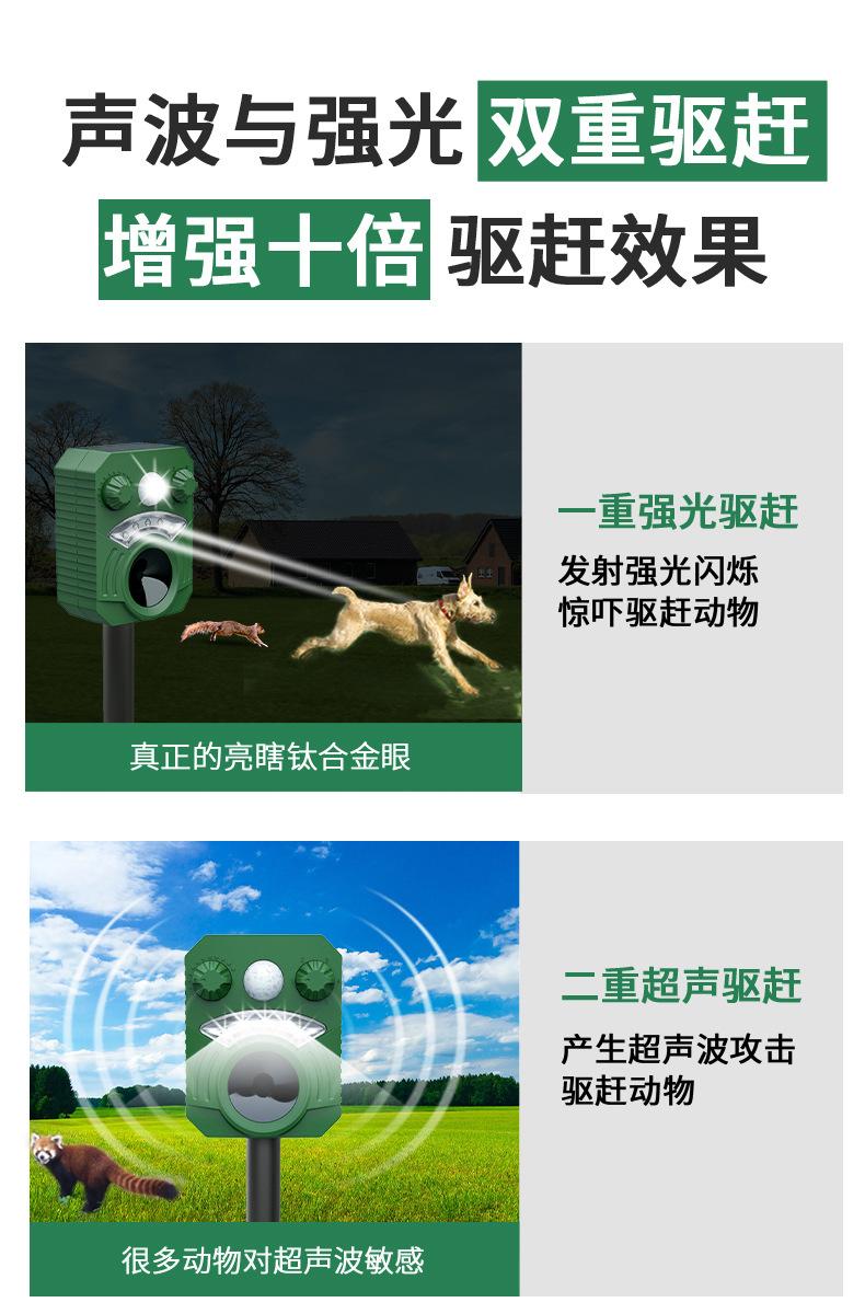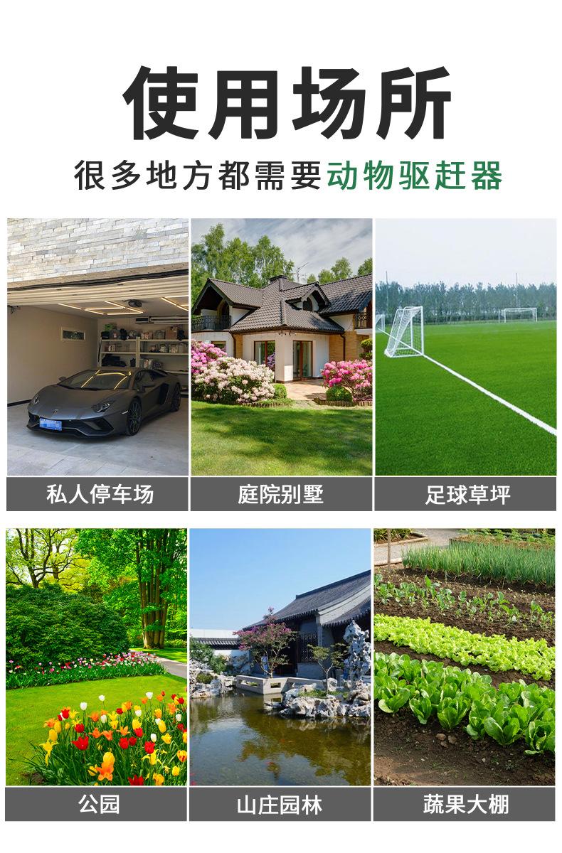 cuando entran los animalesSensor PIRrango,ultrasonidose activará. Señal ultrasónica fuertePuede actuar sobre el sistema auditivo y el sistema nervioso de los animales,causando incomodidad y desagrado,y huyó de la escena。