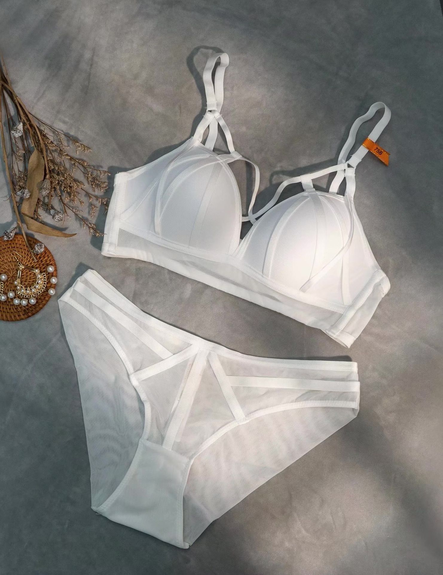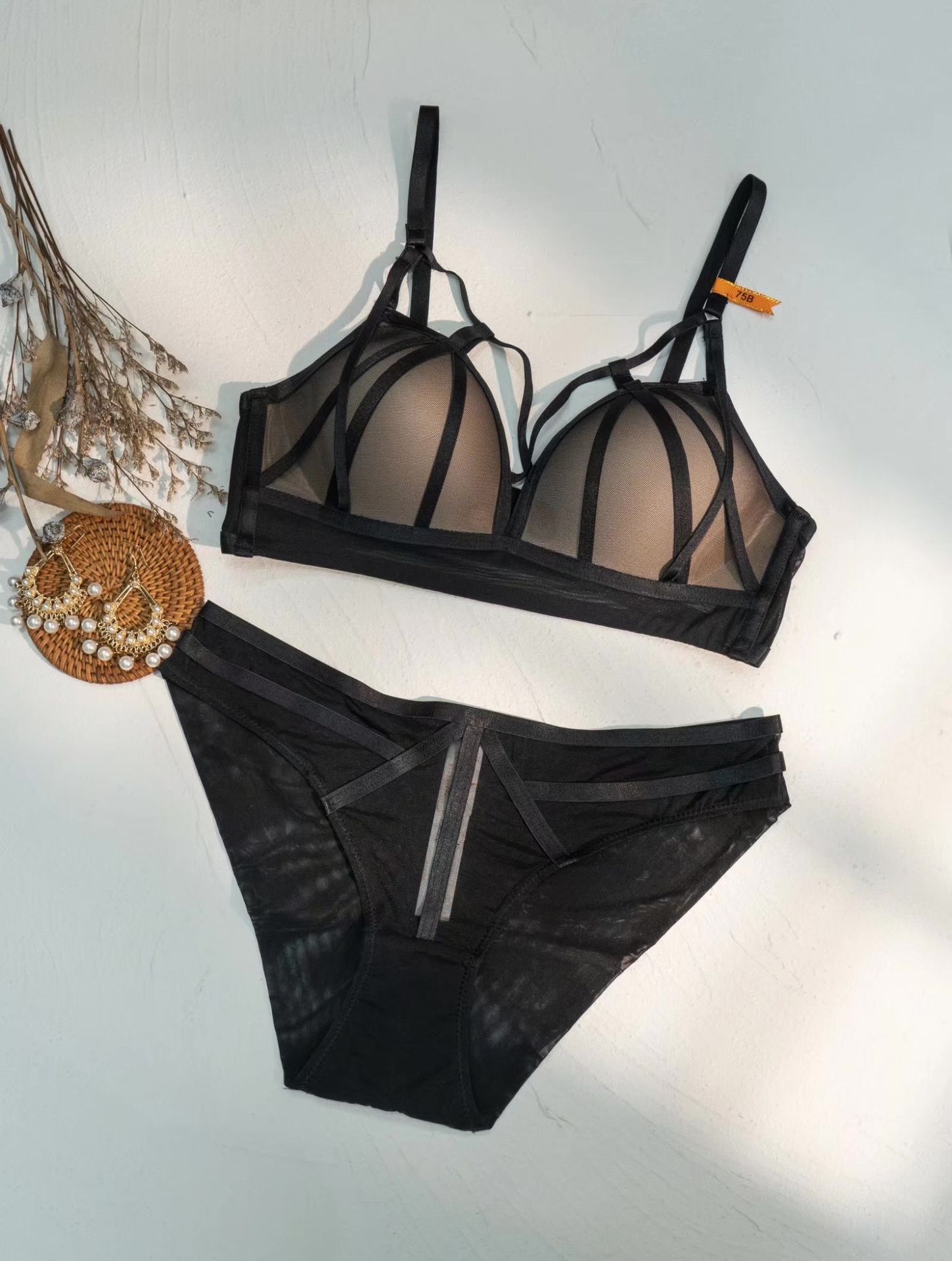 Conjunto de sujetador de media copa, sexy, de encaje, ultrafino, transparente, sin relleno