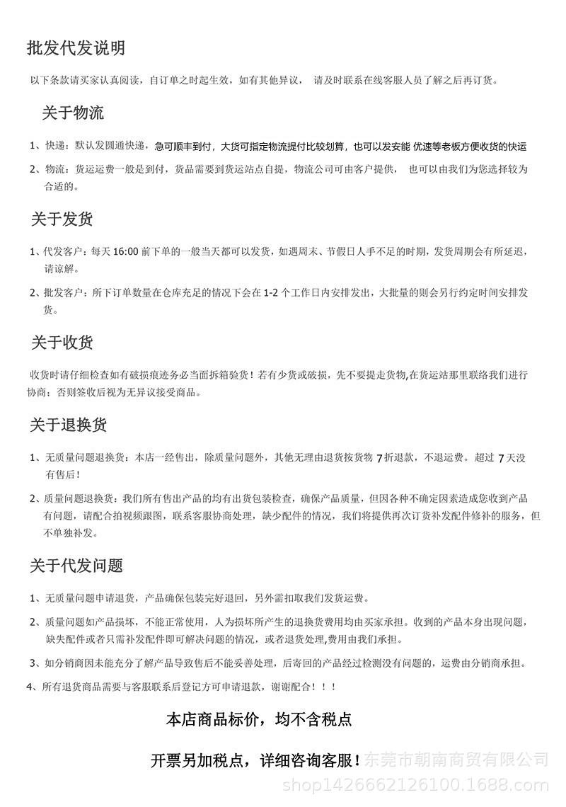 Algunos de los productos de la tienda están empaquetados en inglés, una pequeña cantidad de cajas blancas, bolsas, con los certificados de exportación pertinentes, adecuados para plataformas de comercio electrónico transfronterizo. Para ventas de exportación de comercio exterior tradicional, comercio electrónico nacional y tiendas físicas, proporcione instrucciones de embalaje en chino. Nuestra empresa no asume ninguna responsabilidad. , ¡tenga en cuenta! Si realiza un pedido directamente, aceptará este contrato. Si tiene alguna objeción, póngase en contacto con el servicio de atención al cliente.