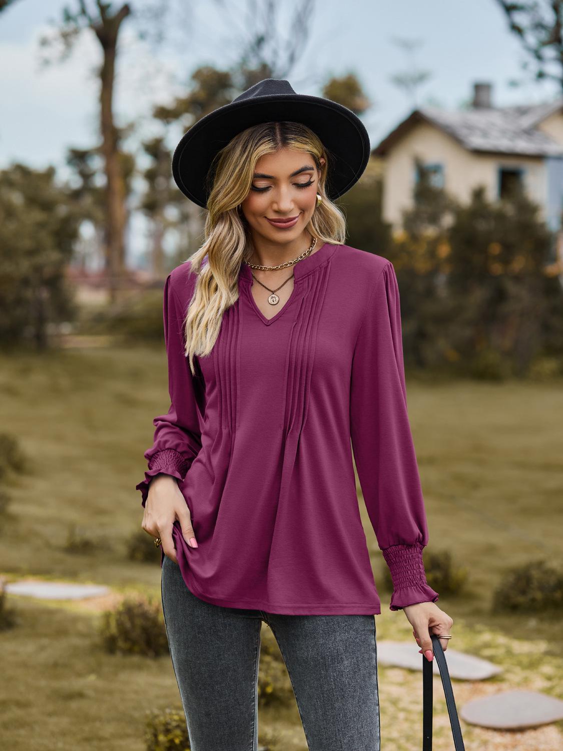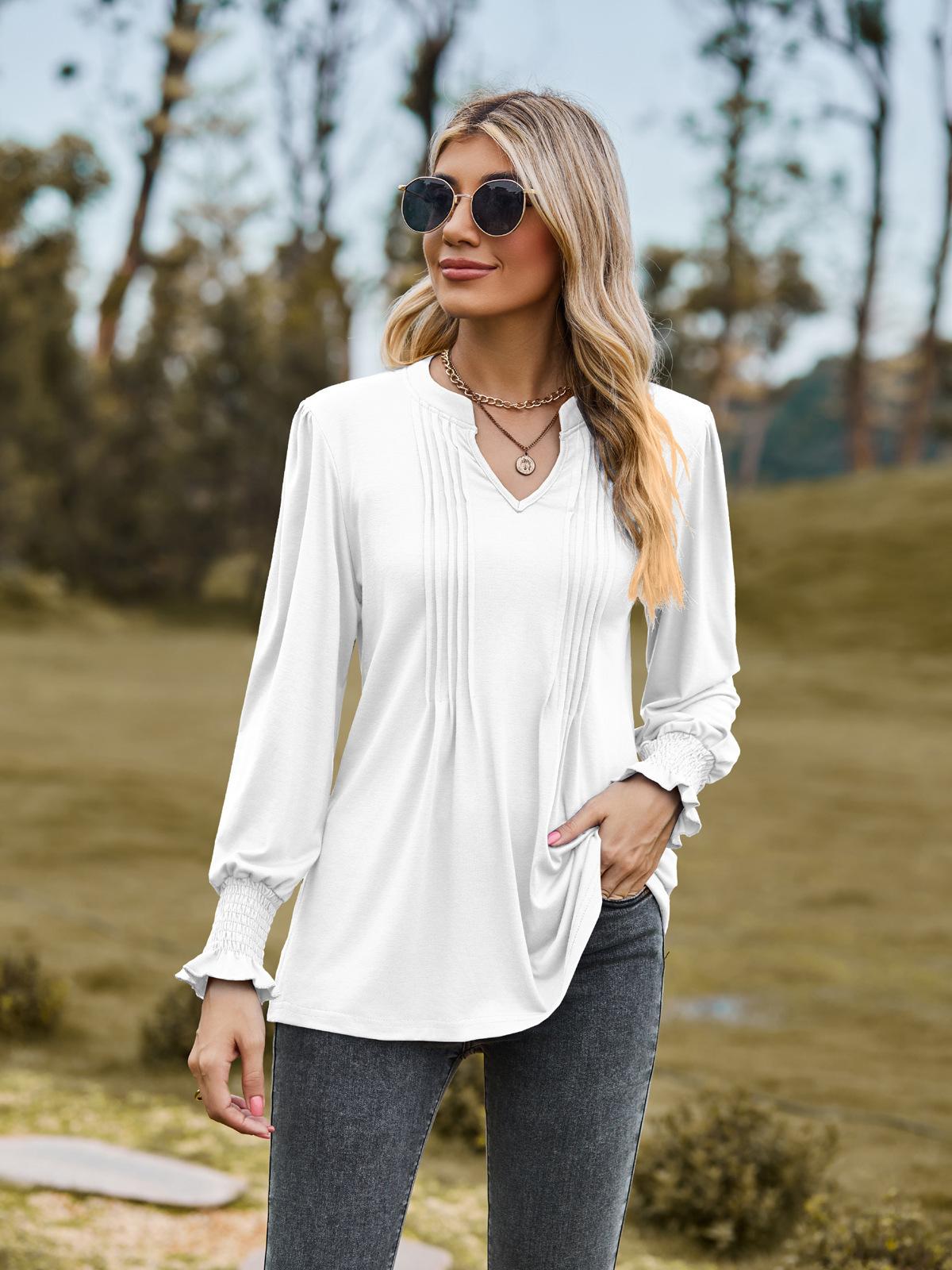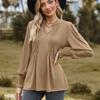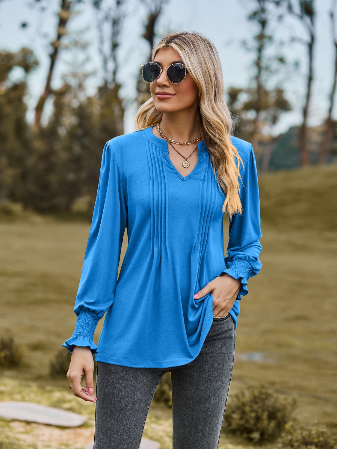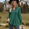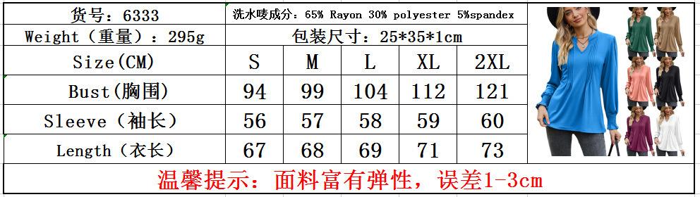 2023 Amazon Otoño Nueva Camiseta Transfronteriza para Mujer Color Sólido Rayada Manga Abullonada Cuello en V Manga Larga Top