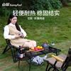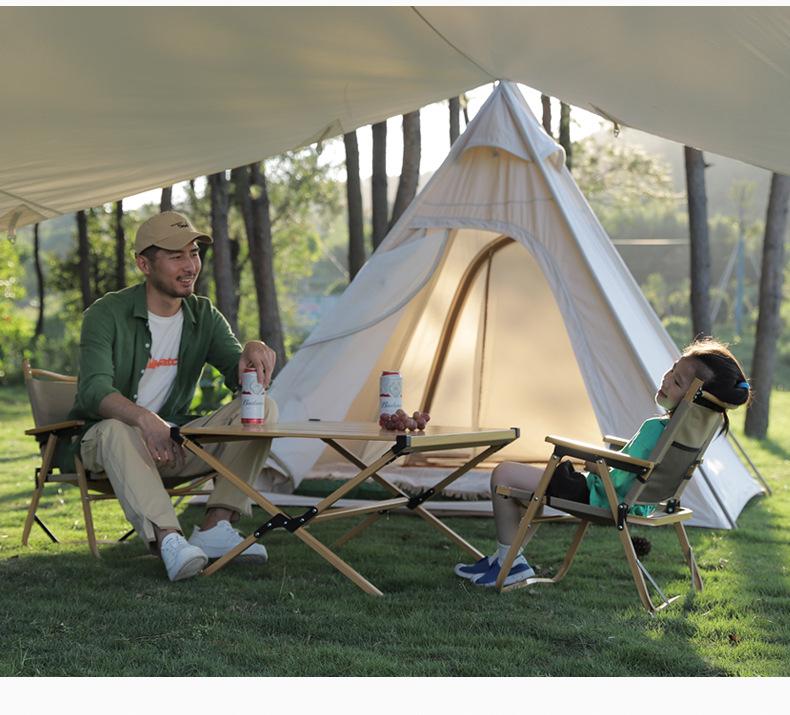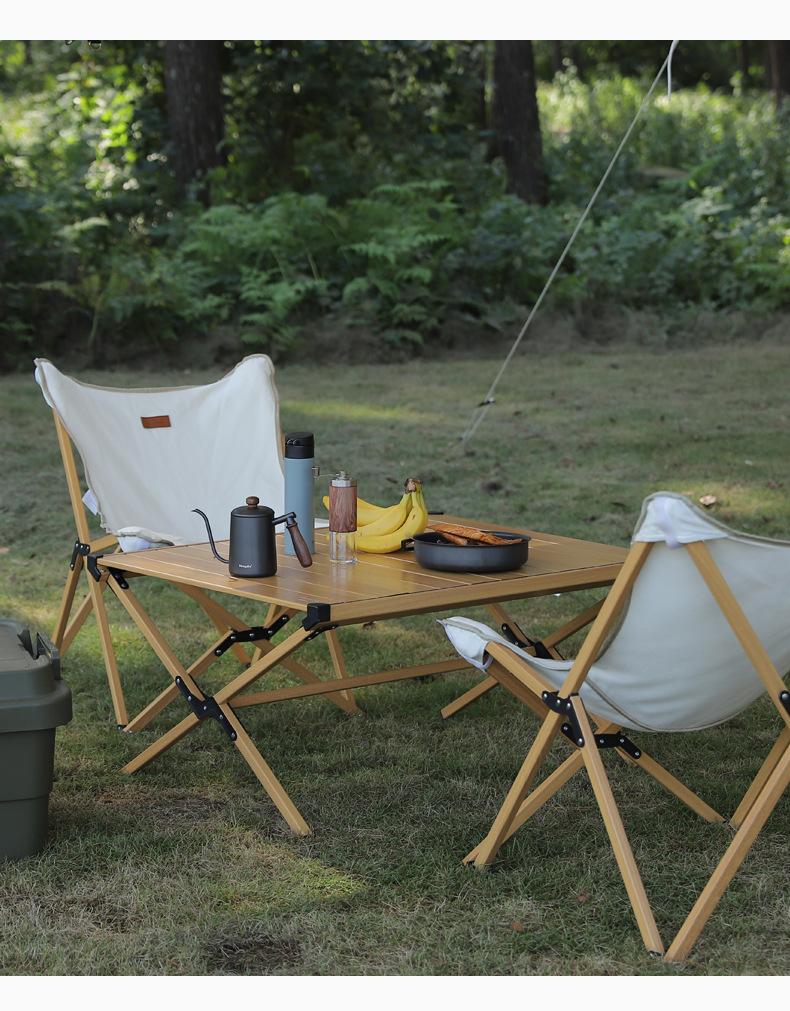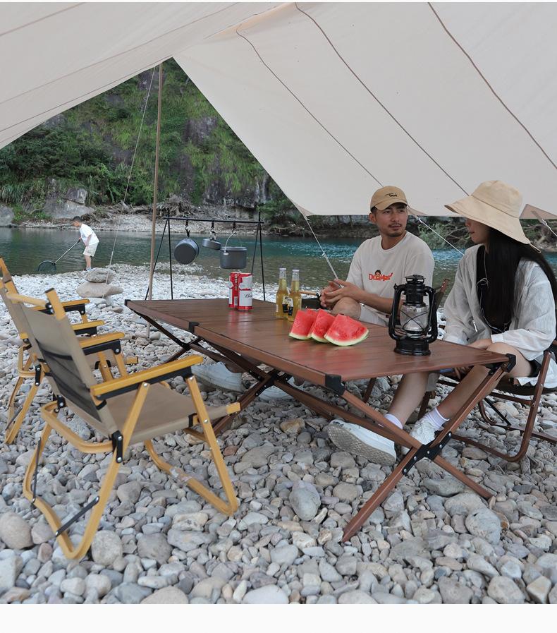 Mesa plegable de madera para acampar al aire libre con diseño de hojas de montaña SunnyFeel, mesa y sillas al por mayor, mesa enrollable de aleación de aluminio para acampar.