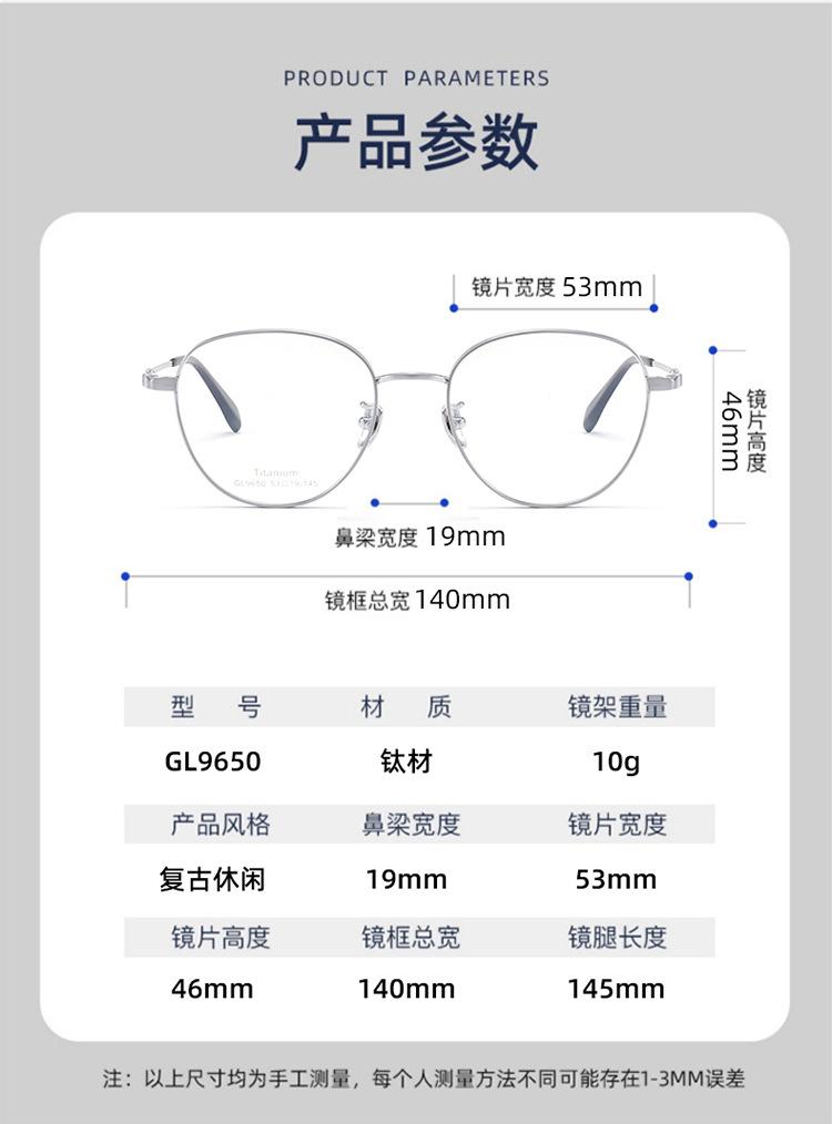 2023 nuevas gafas de titanio puro con borde ancho, gafas de arte retro, se pueden equipar con marco óptico con número de altura, venta al por mayor GL9650