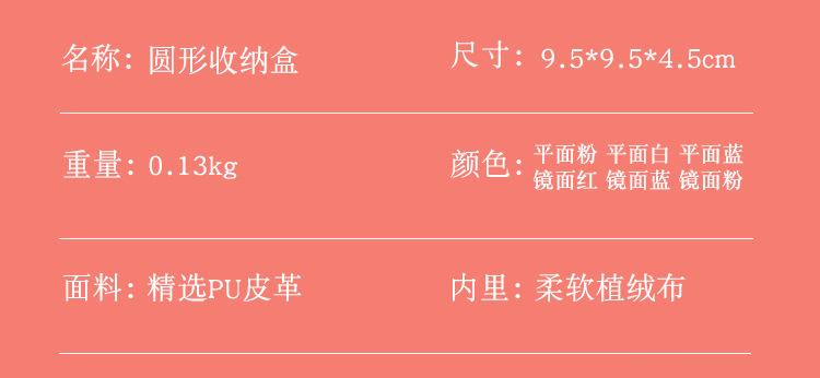 | Nombre del producto | Caja redonda de joyería de piel PU | Respecto al peso y tamaño [puede haber ligeros errores en diferentes lotes debido a la medición manual] |
