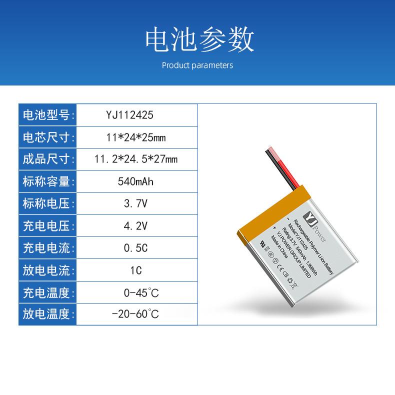 Batería recargable de polímero de litio YJ 112425 de 3,7 V y 500 mAh para instrumento de belleza con luz LED.