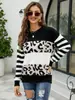 Suéter de Moda para Mujer de Comercio Exterior Transfronterizo Europeo y Americano, Cuello Redondo, Suelto, Tejido de Punto, Jacquard de Leopardo, Combinación de Colores, Top de Punto para Mujer