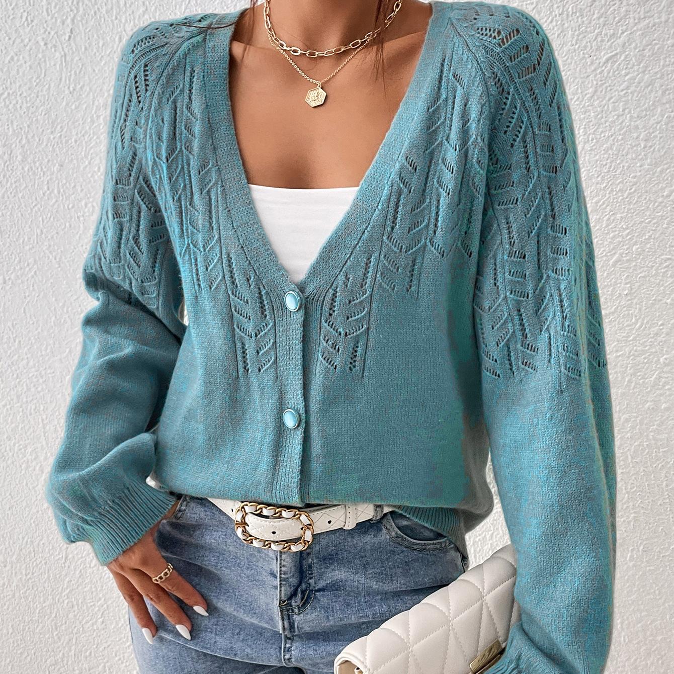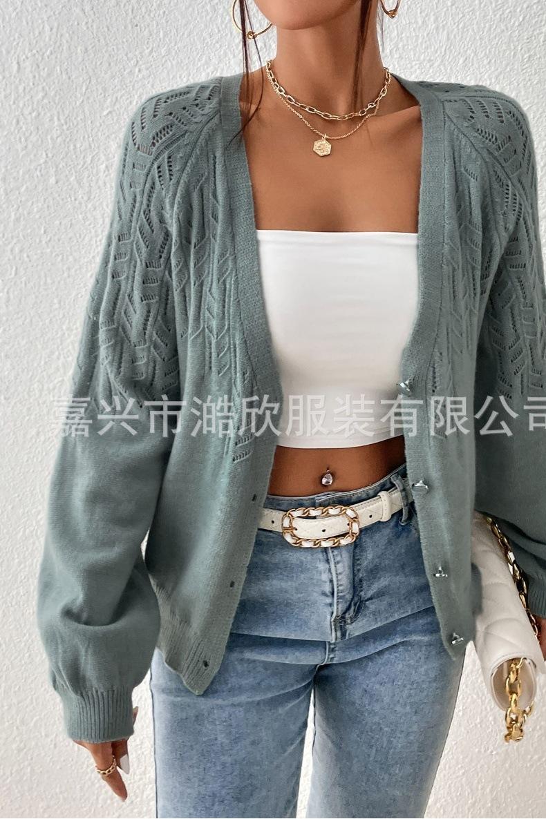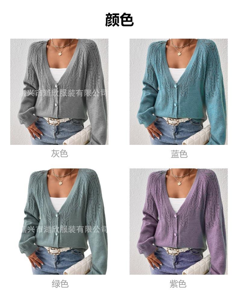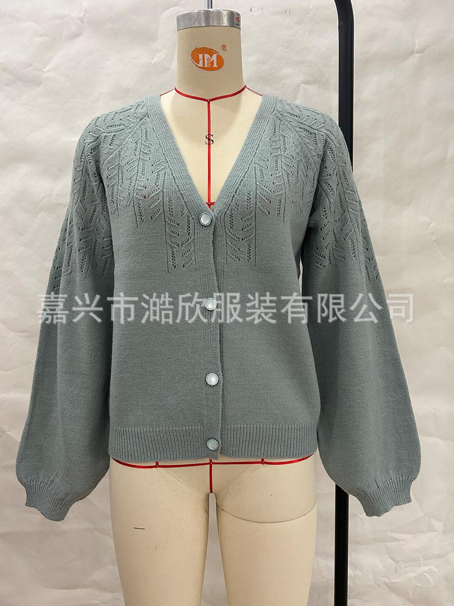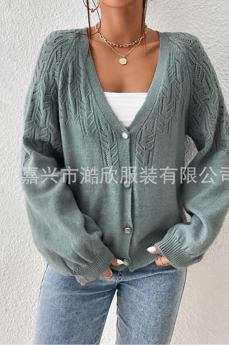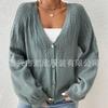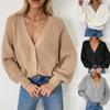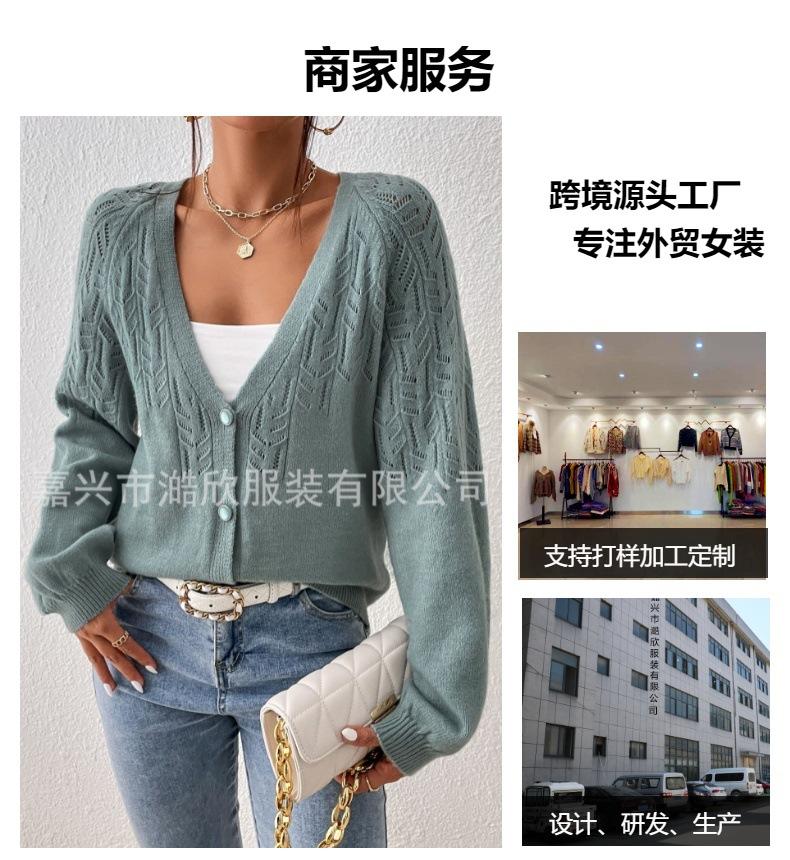 Tops de Punto para Mujer de Exportación Transfronteriza Europea y Americana Elegante Cuello en V Monocolor con Jacquard Geométrico Chaqueta Suéter para Mujer