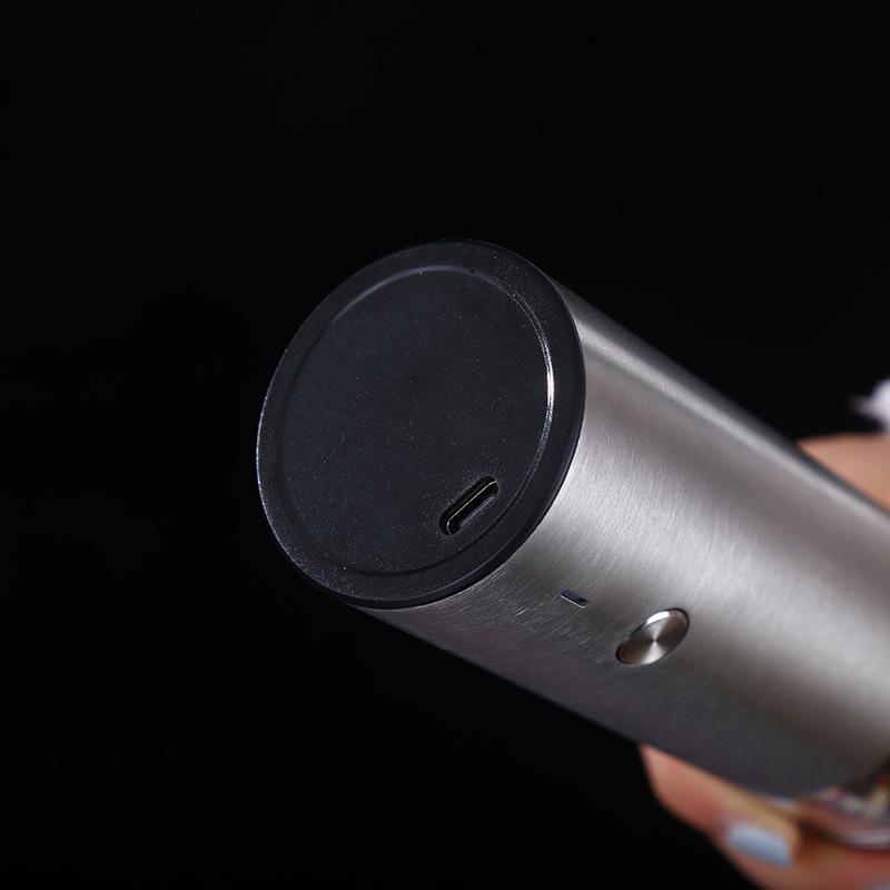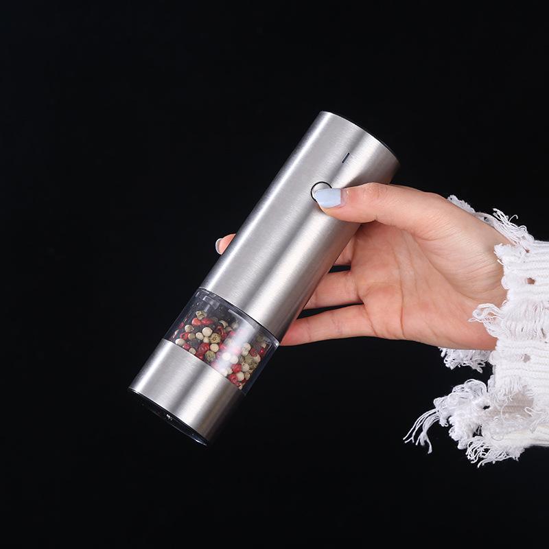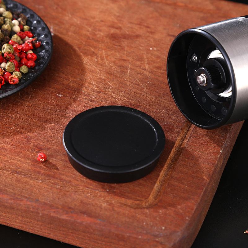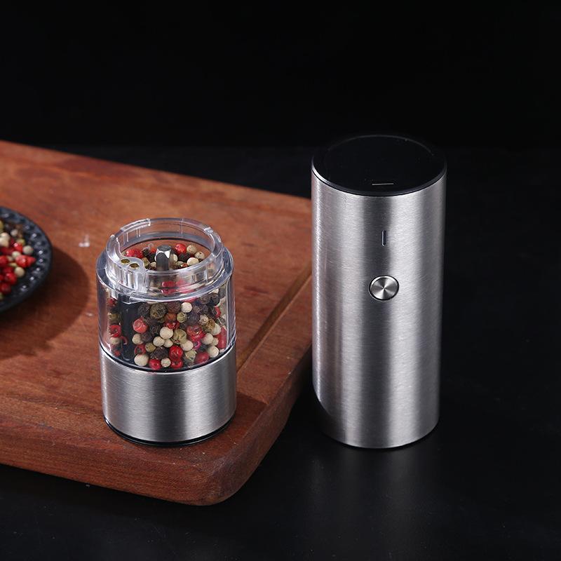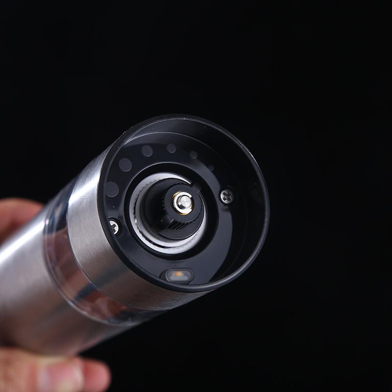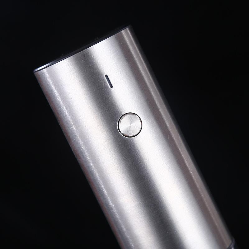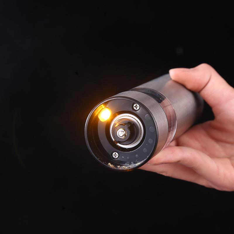 Superficie pulida de acero inoxidable Botón de patrón de CD redondo, presione levemente para iniciar Ajuste manual, sin control de espesor Cámara de especias transparente de gran capacidad de 70 ml y luz LED Carga del cuerpo de la batería de litio, puerto de carga tipo C Al cargar, la luz indicadora frontal está encendida y la luz indicadora está apagada.