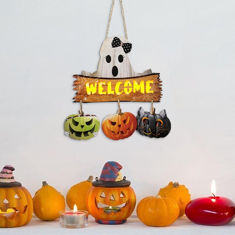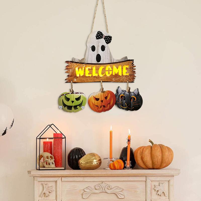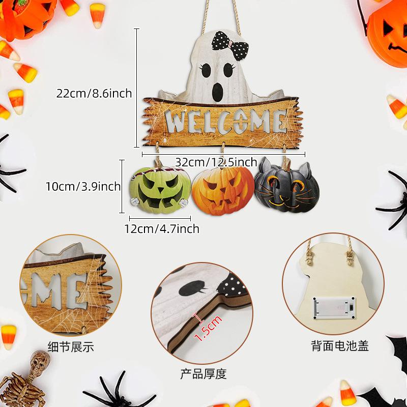 Nuevo colgante de pared de Halloween con luces LED de Amazon, con atmósfera de calabaza fantasma, placa de bienvenida para puerta, decoración de pared