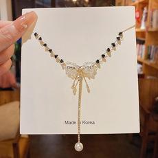 Collar de lujo ligero de alta gama con lazo de cristal negro y borla larga de celebridad de Internet, cadena de clavícula personalizada.