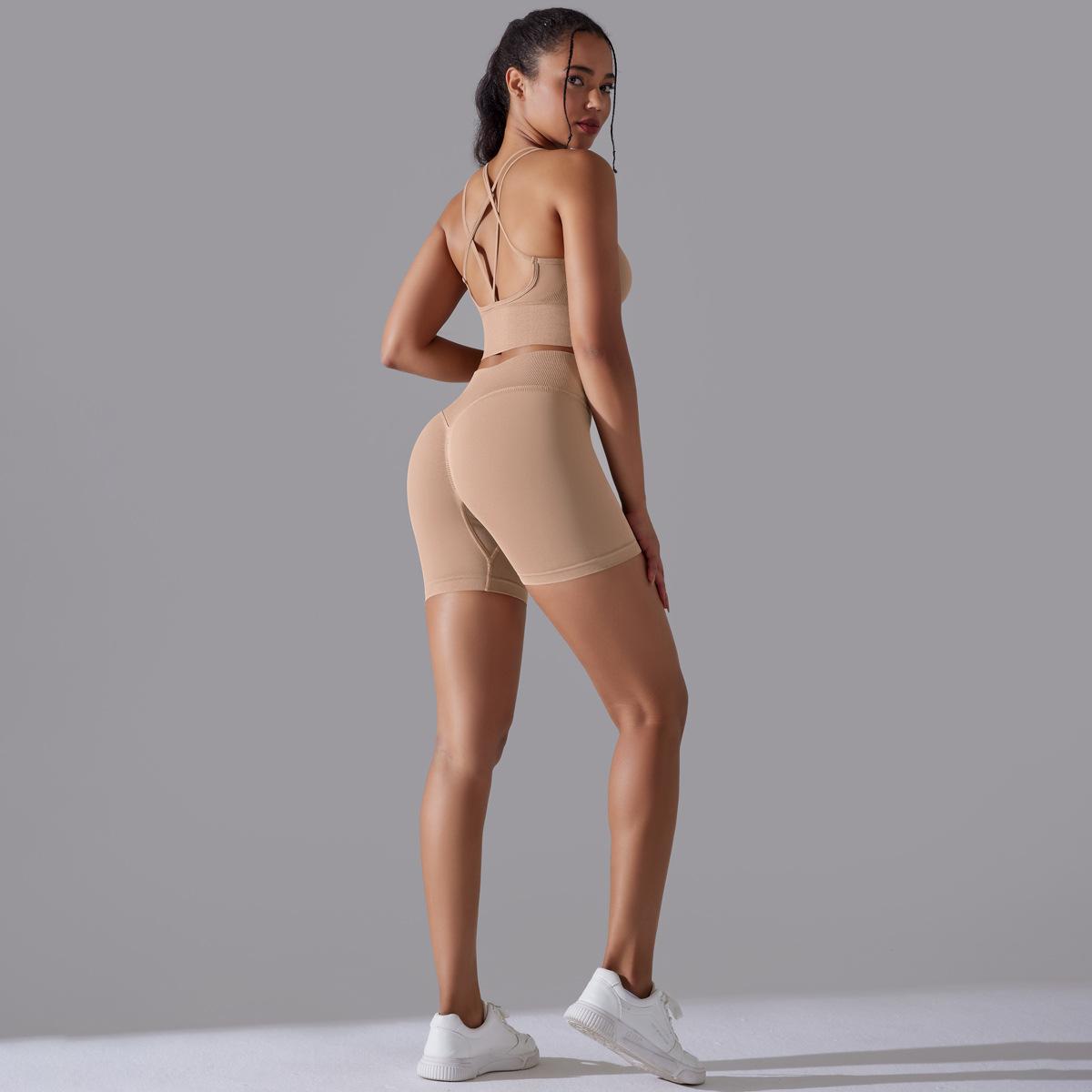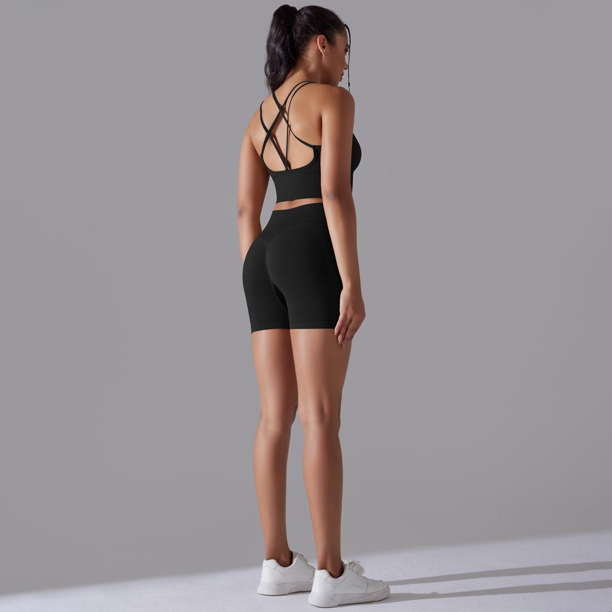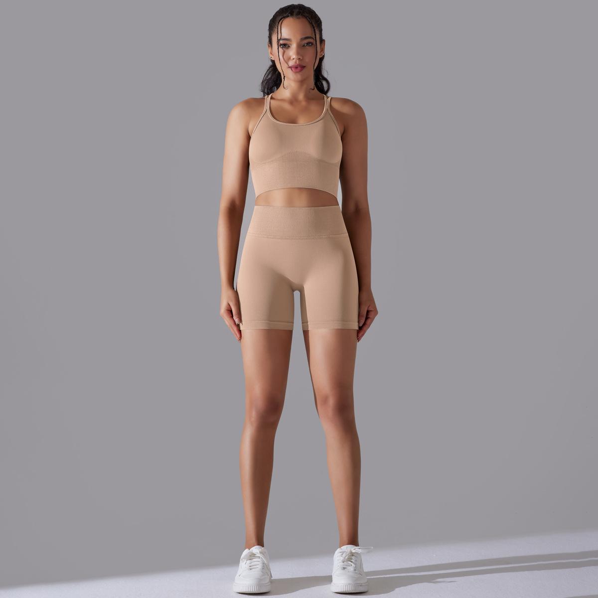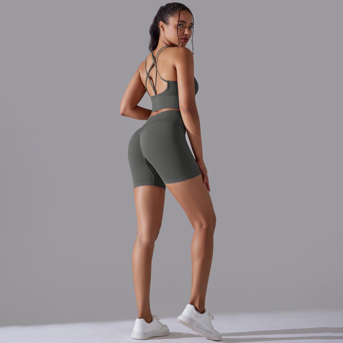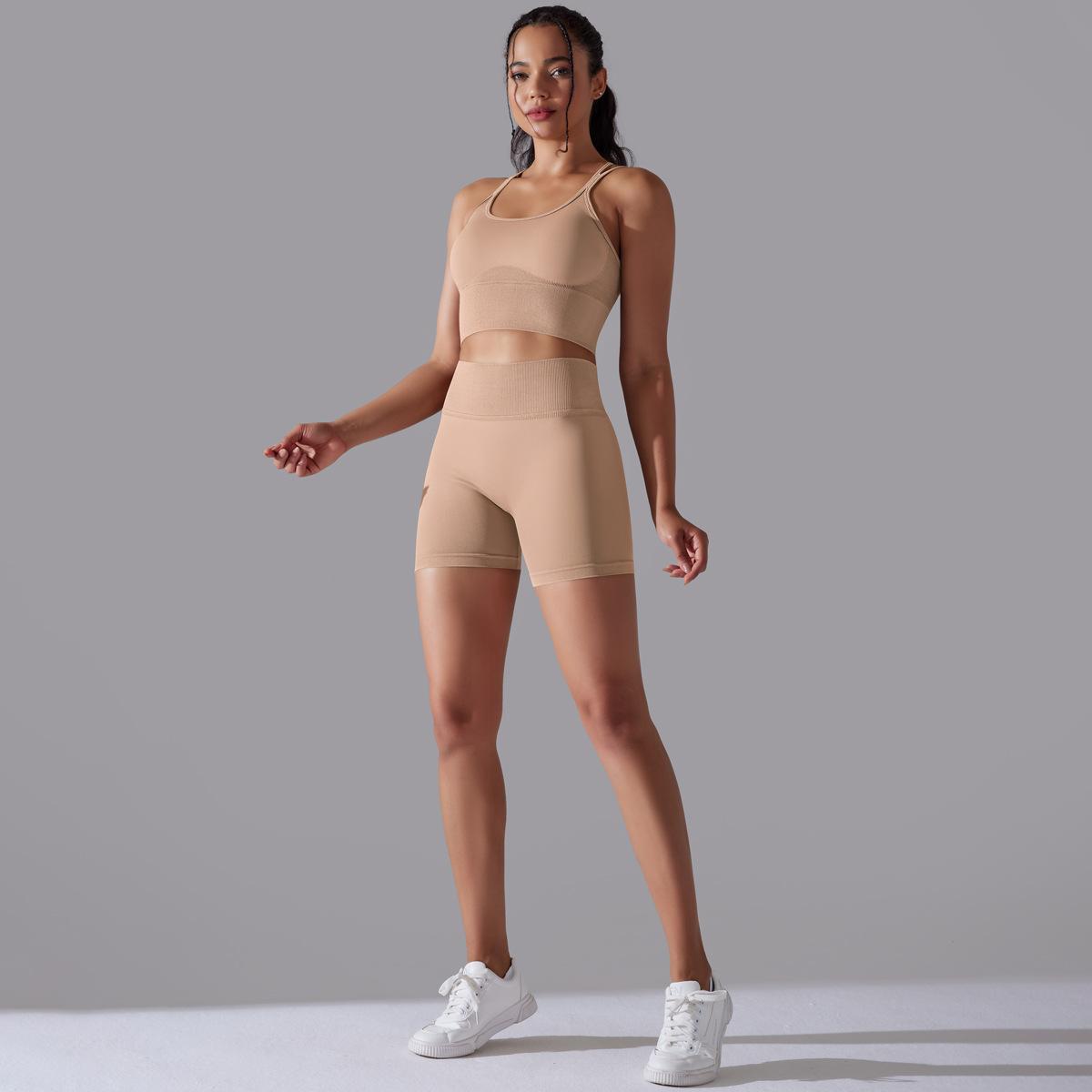 Traje de yoga ajustado deportivo de alta elasticidad con espalda descubierta de color sólido tejido sin costuras transfronterizo europeo y americano, traje de dos piezas para correr y fitness