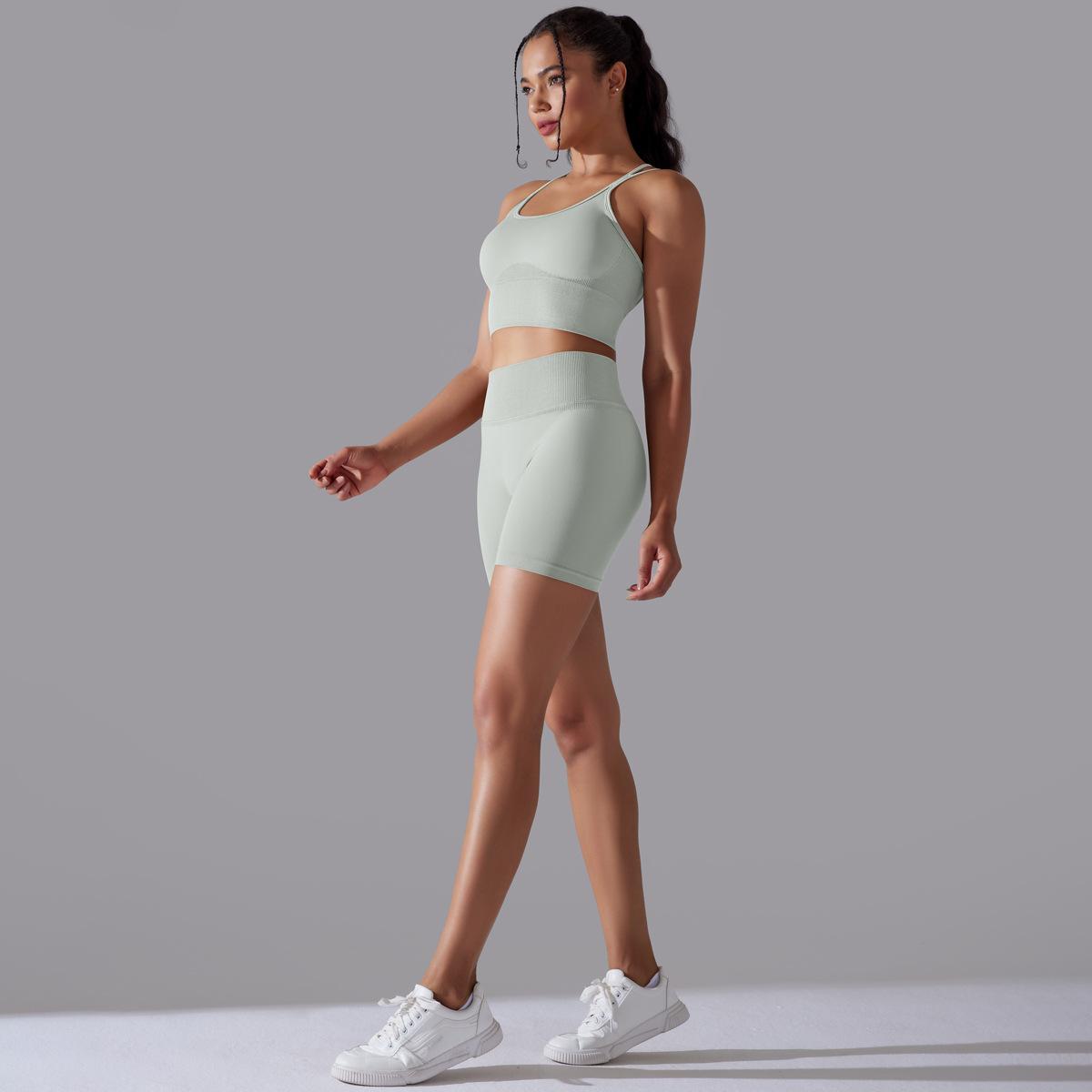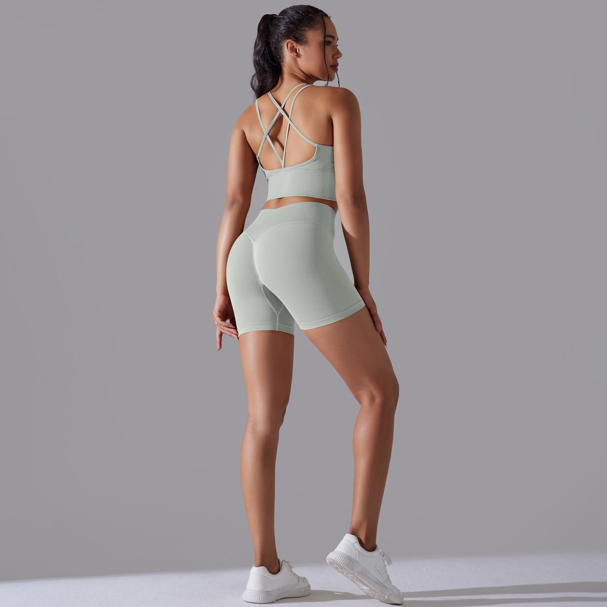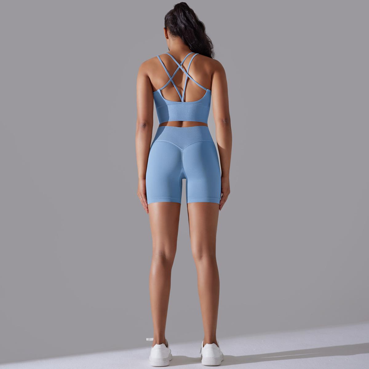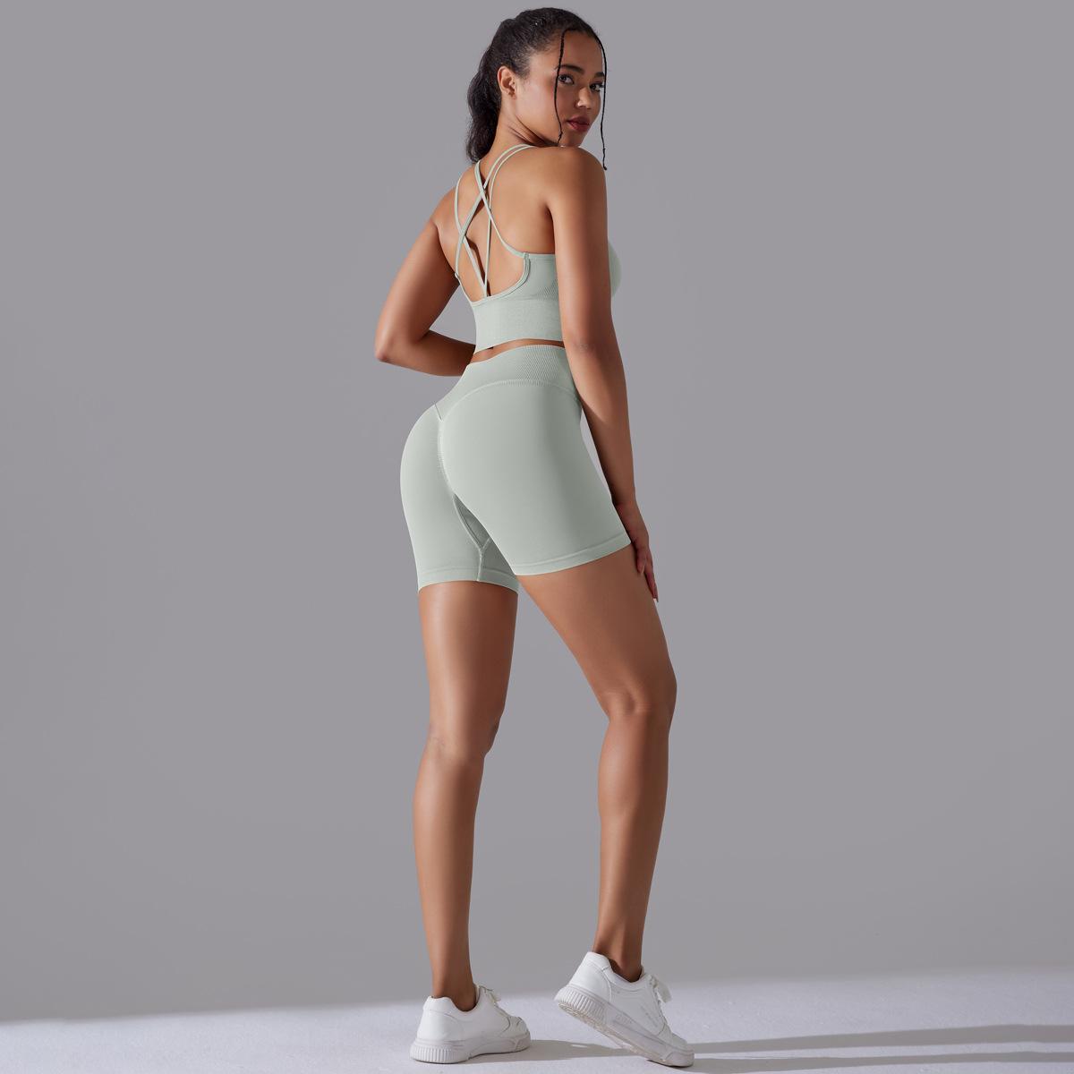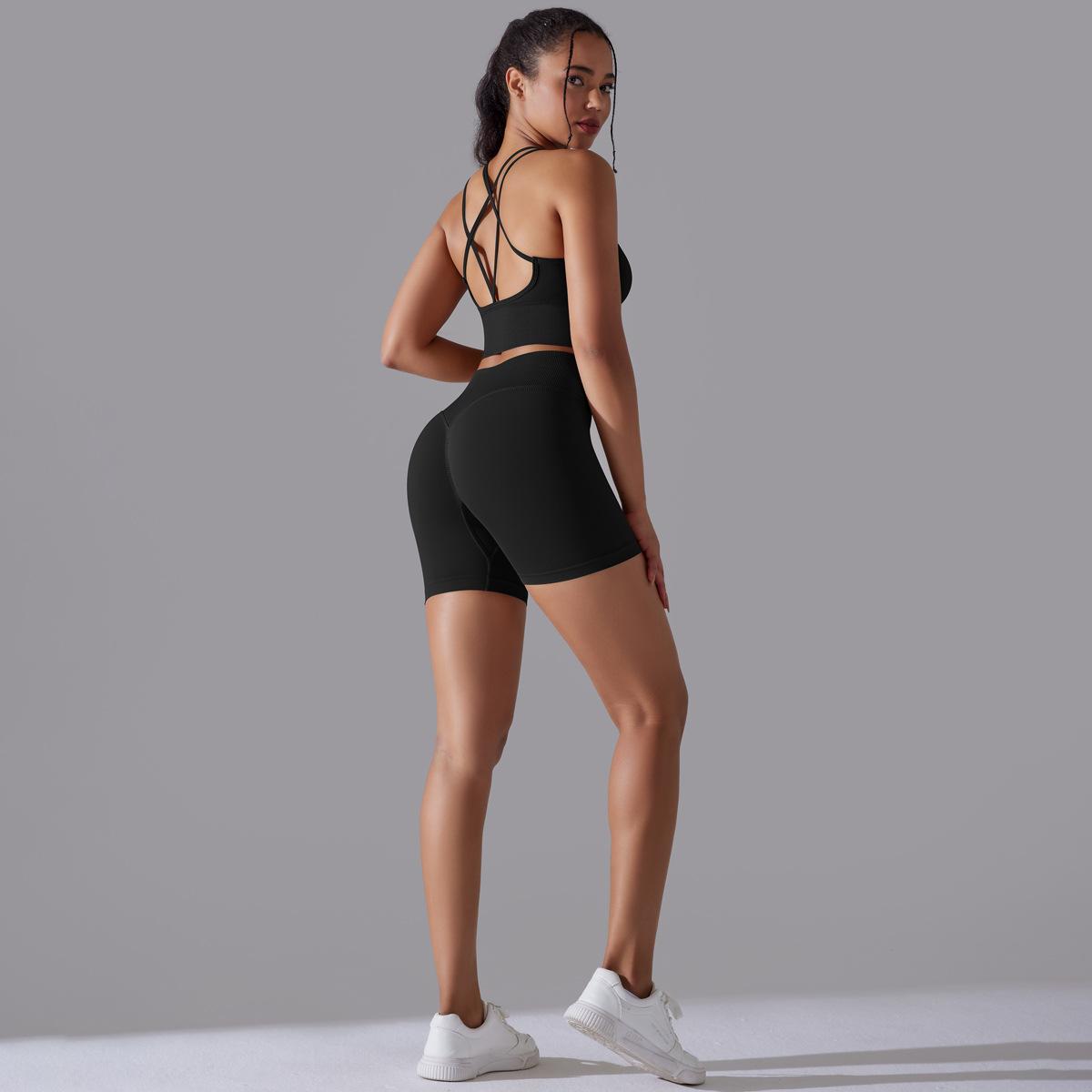 Traje de yoga ajustado deportivo de alta elasticidad con espalda descubierta de color sólido tejido sin costuras transfronterizo europeo y americano, traje de dos piezas para correr y fitness