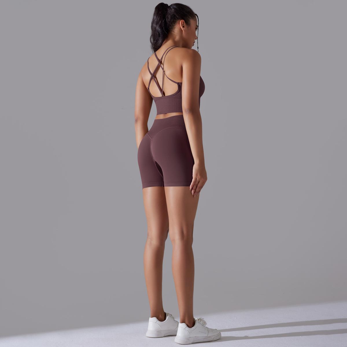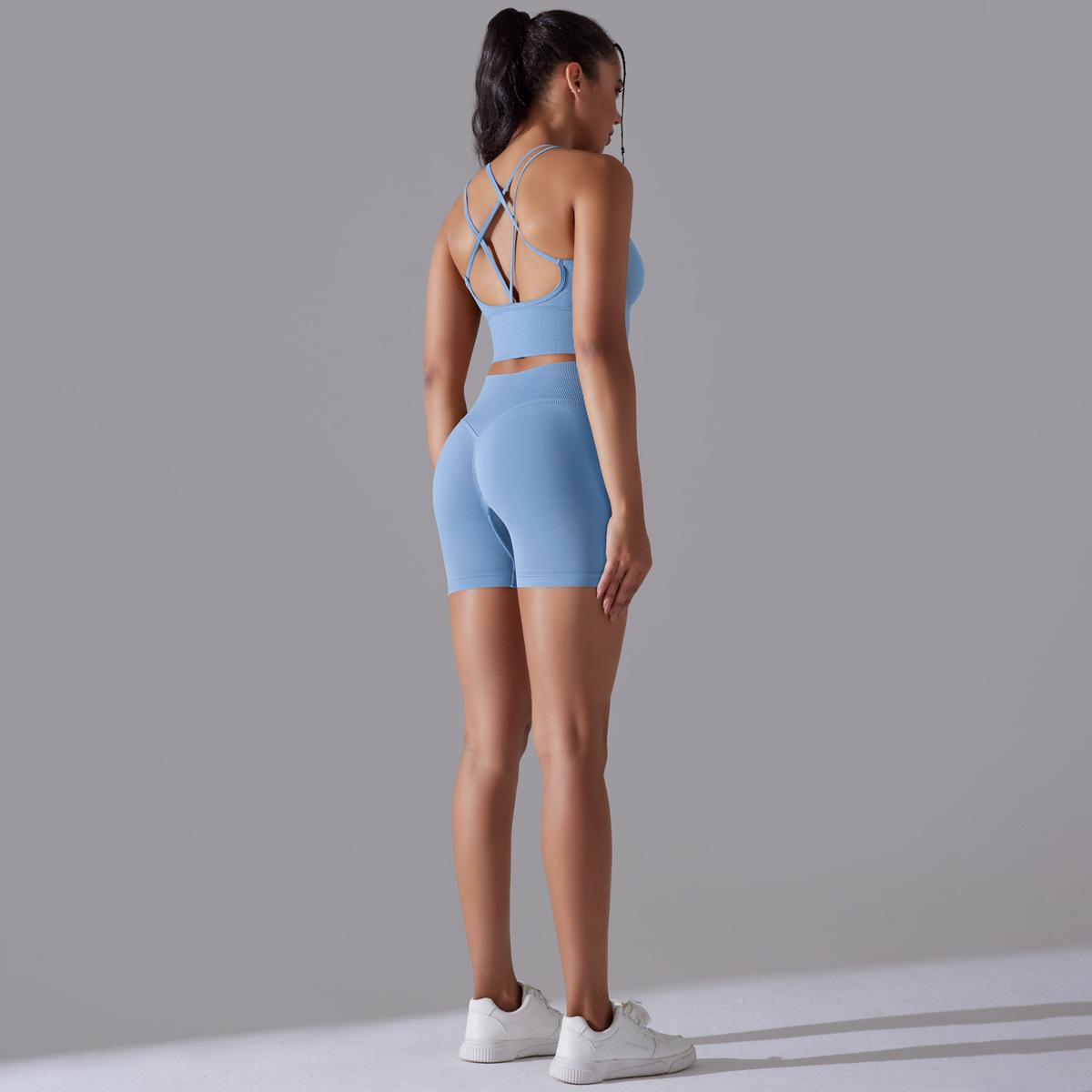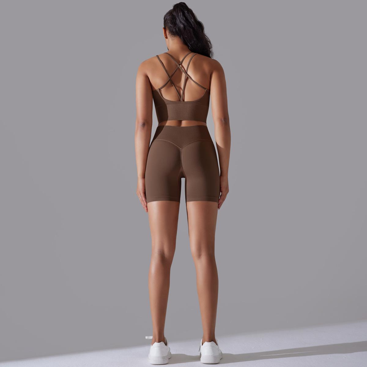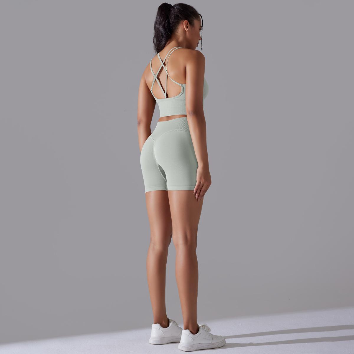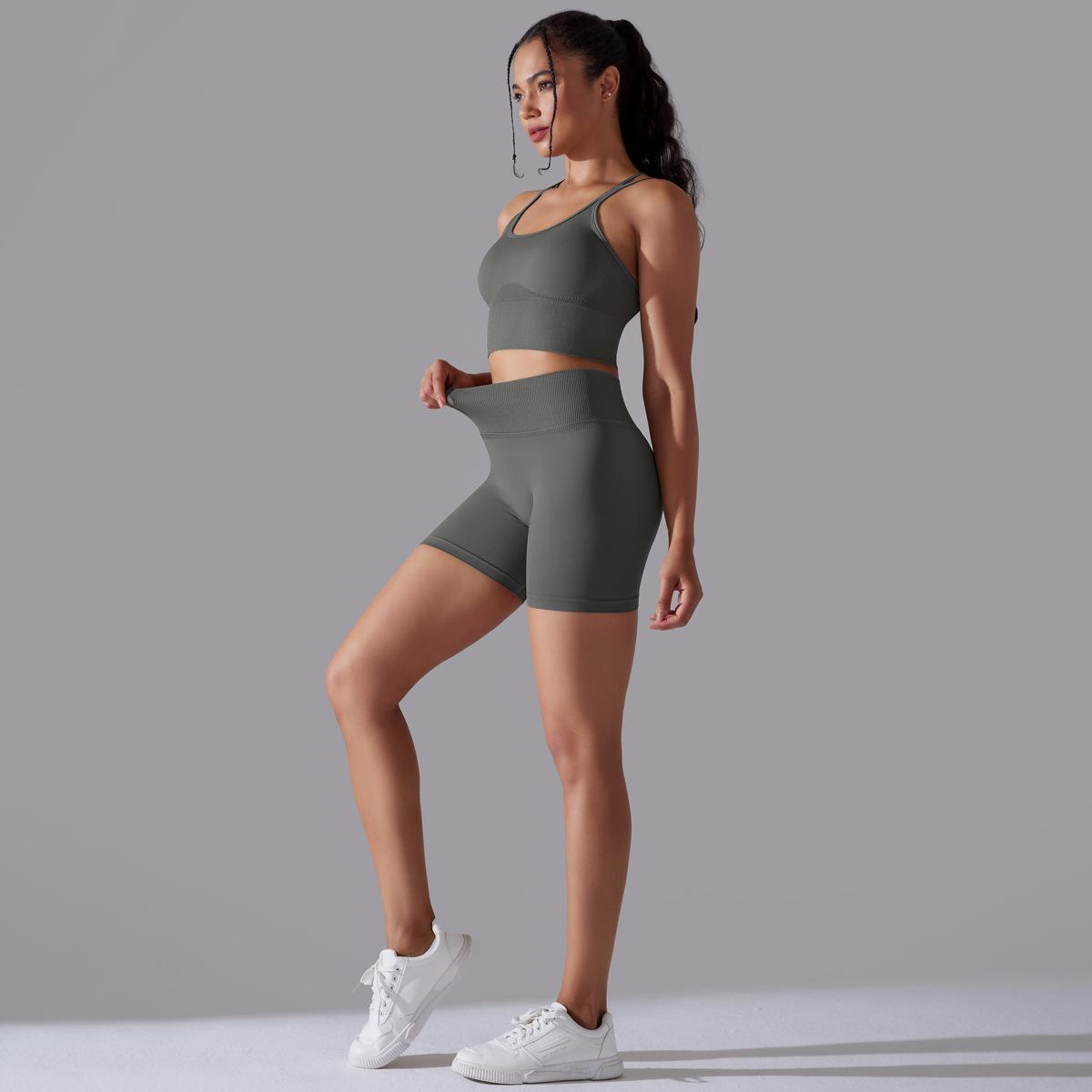 Traje de yoga ajustado deportivo de alta elasticidad con espalda descubierta de color sólido tejido sin costuras transfronterizo europeo y americano, traje de dos piezas para correr y fitness