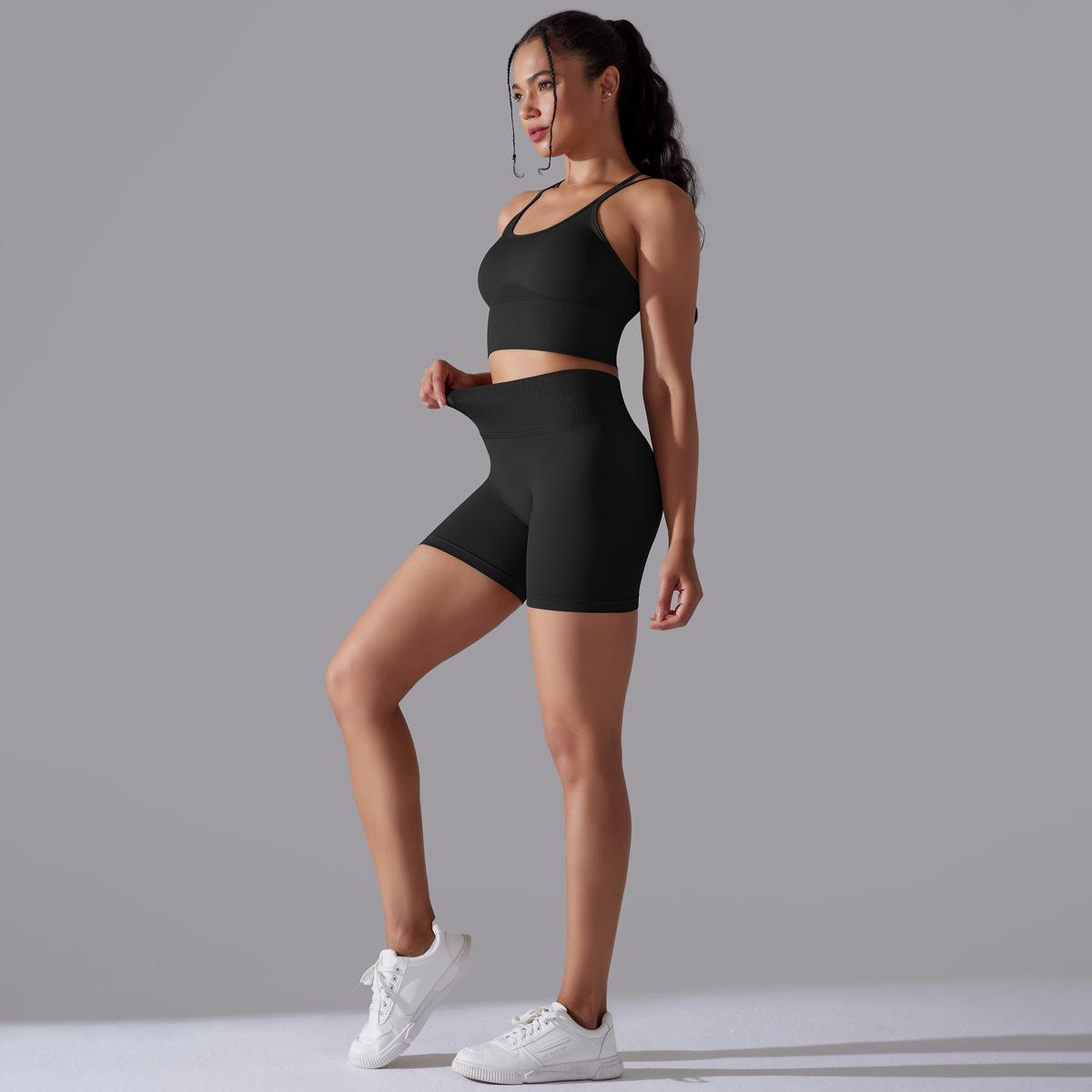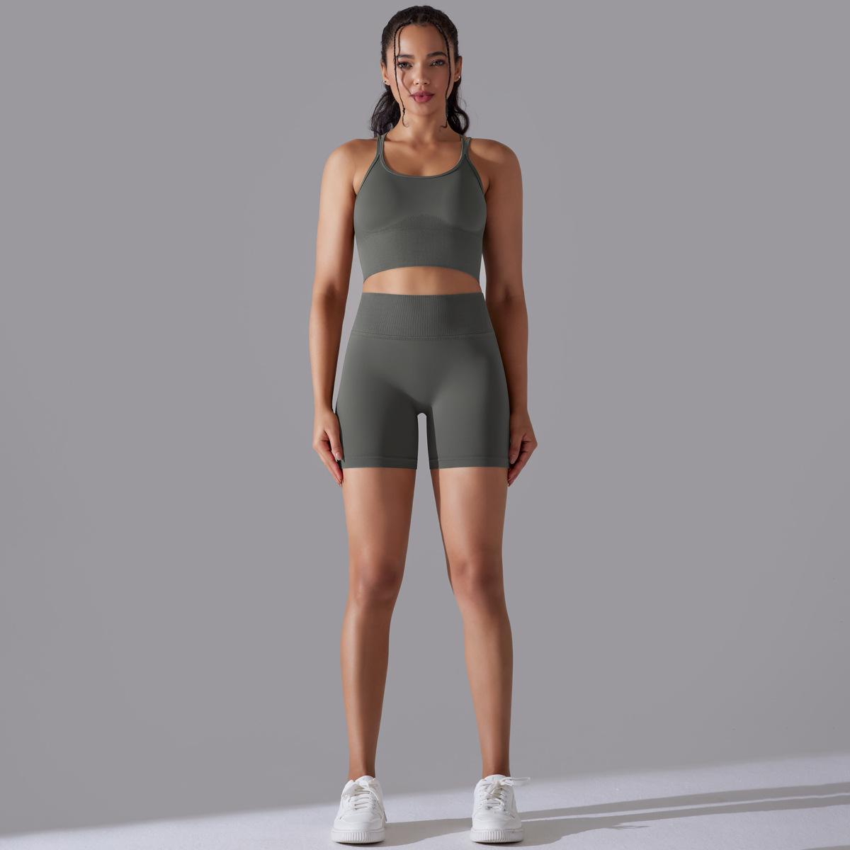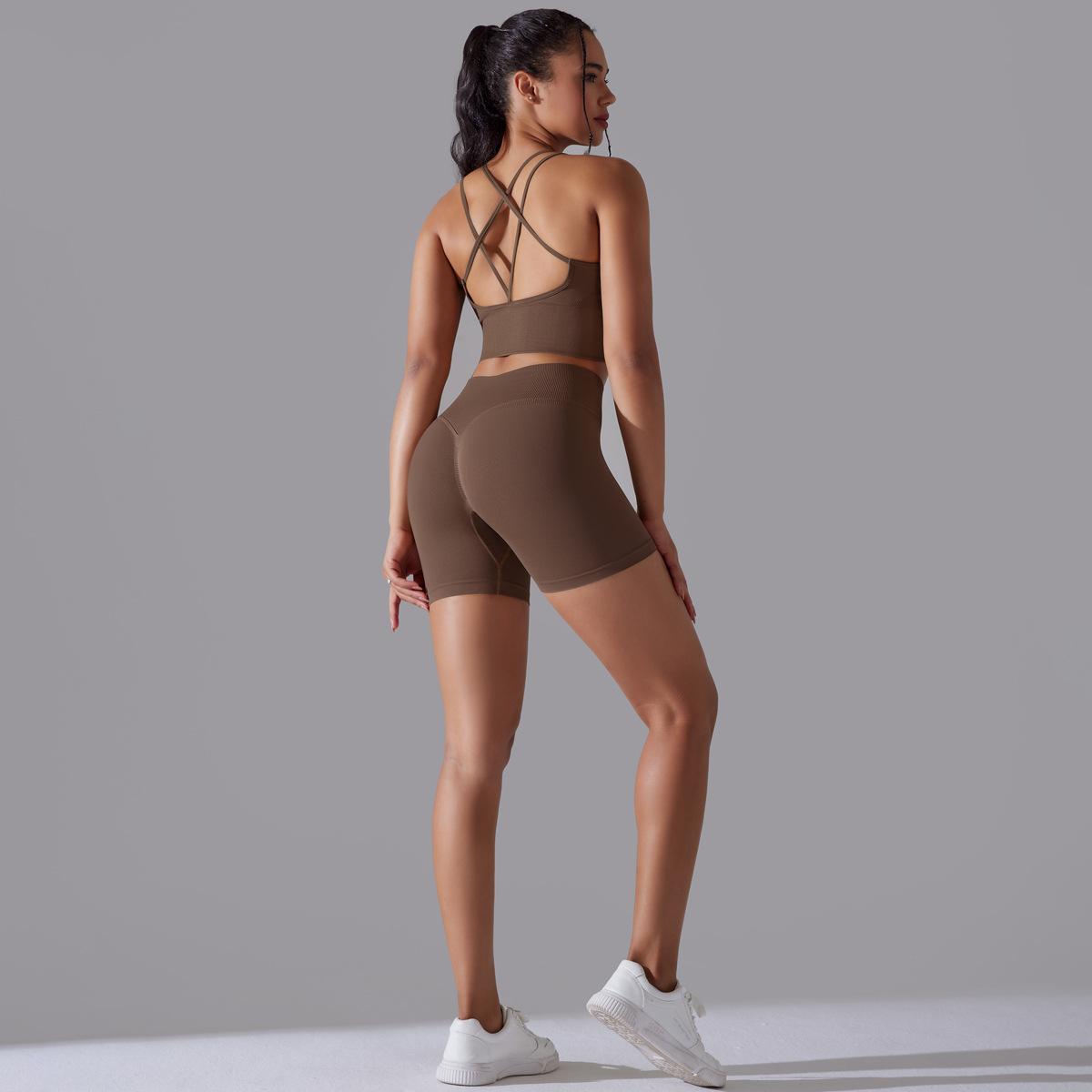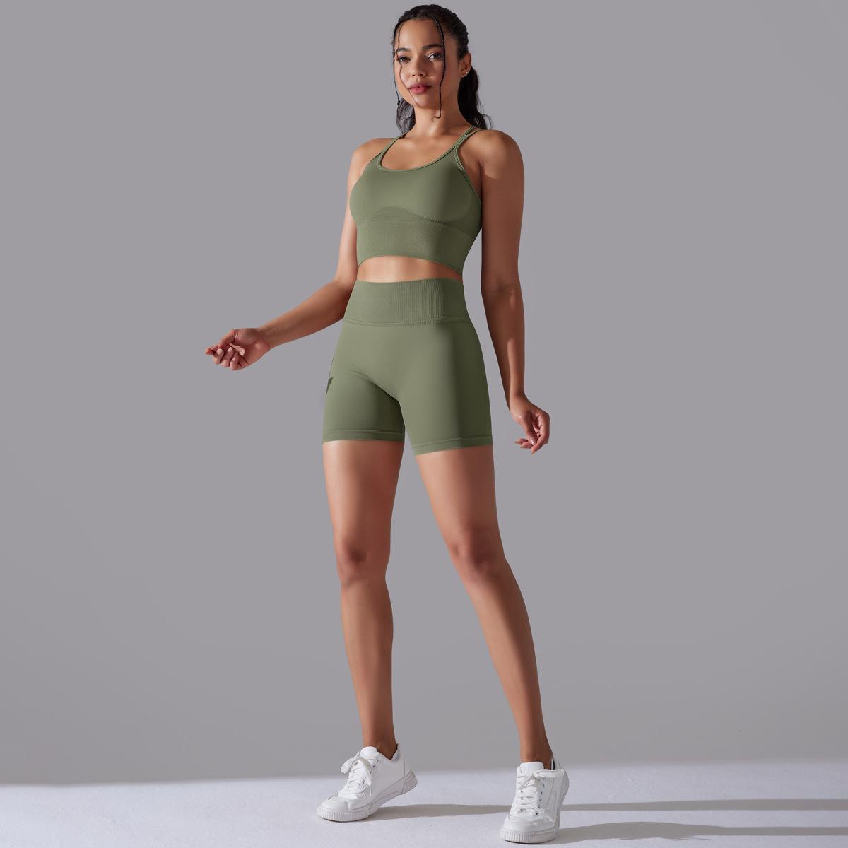 Traje de yoga ajustado deportivo de alta elasticidad con espalda descubierta de color sólido tejido sin costuras transfronterizo europeo y americano, traje de dos piezas para correr y fitness