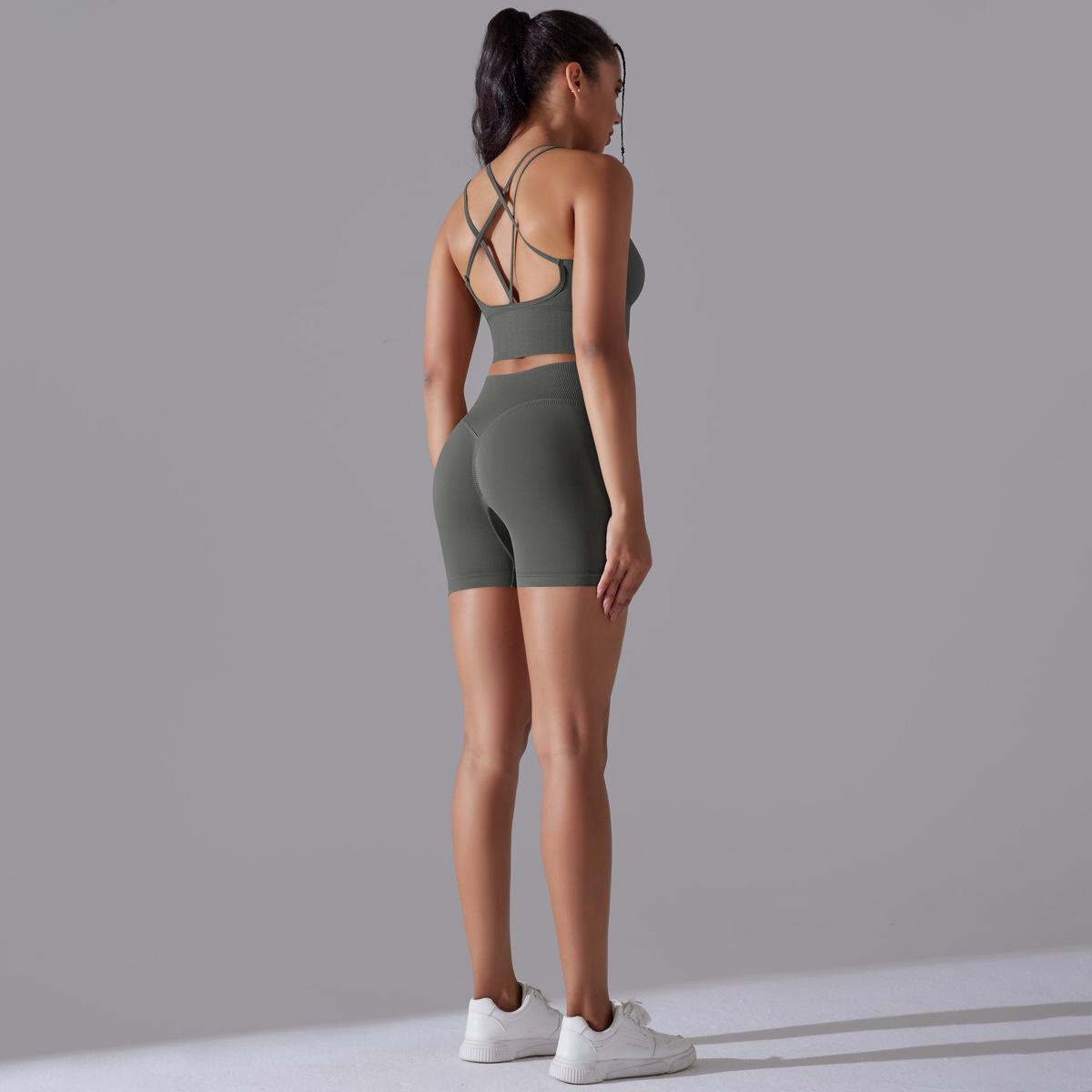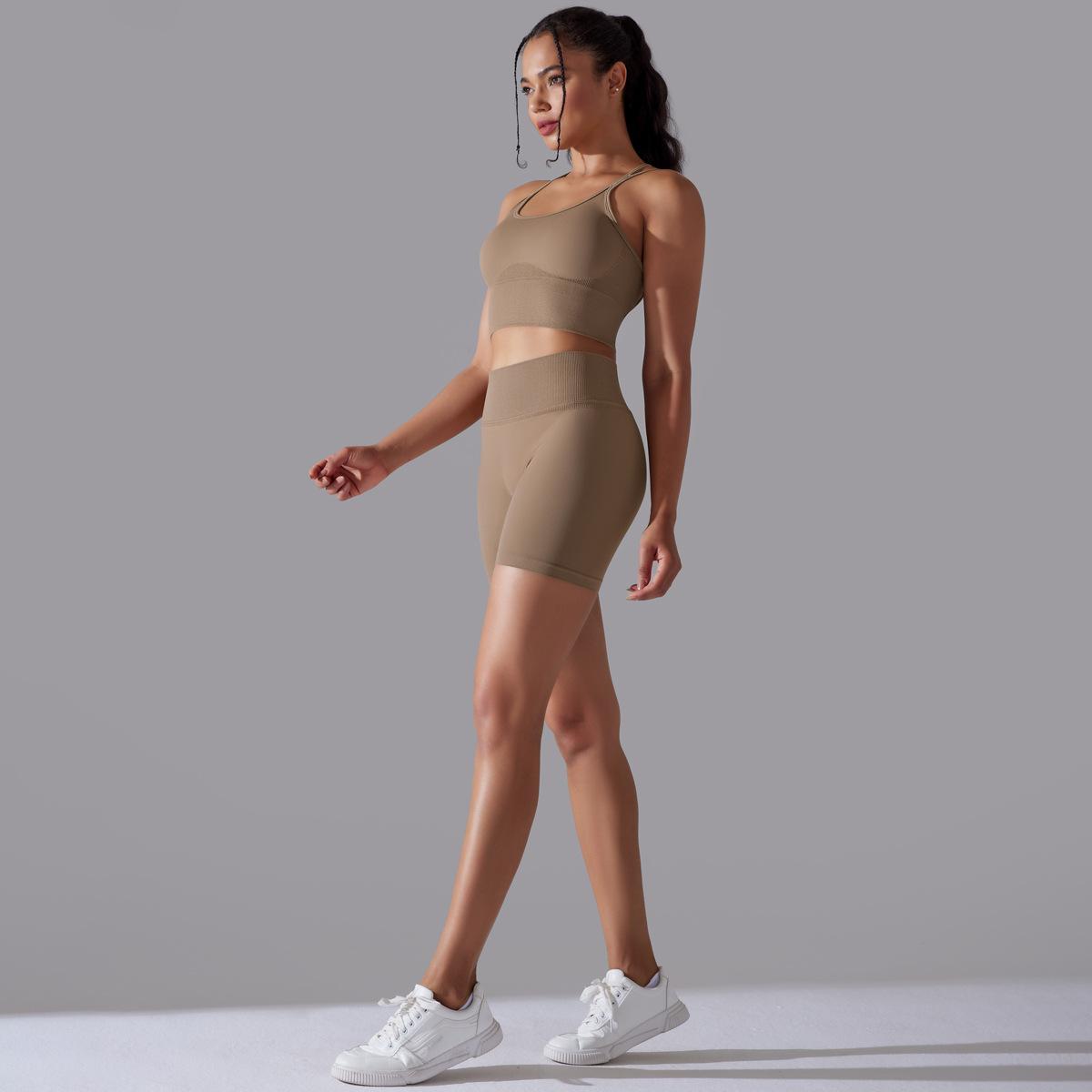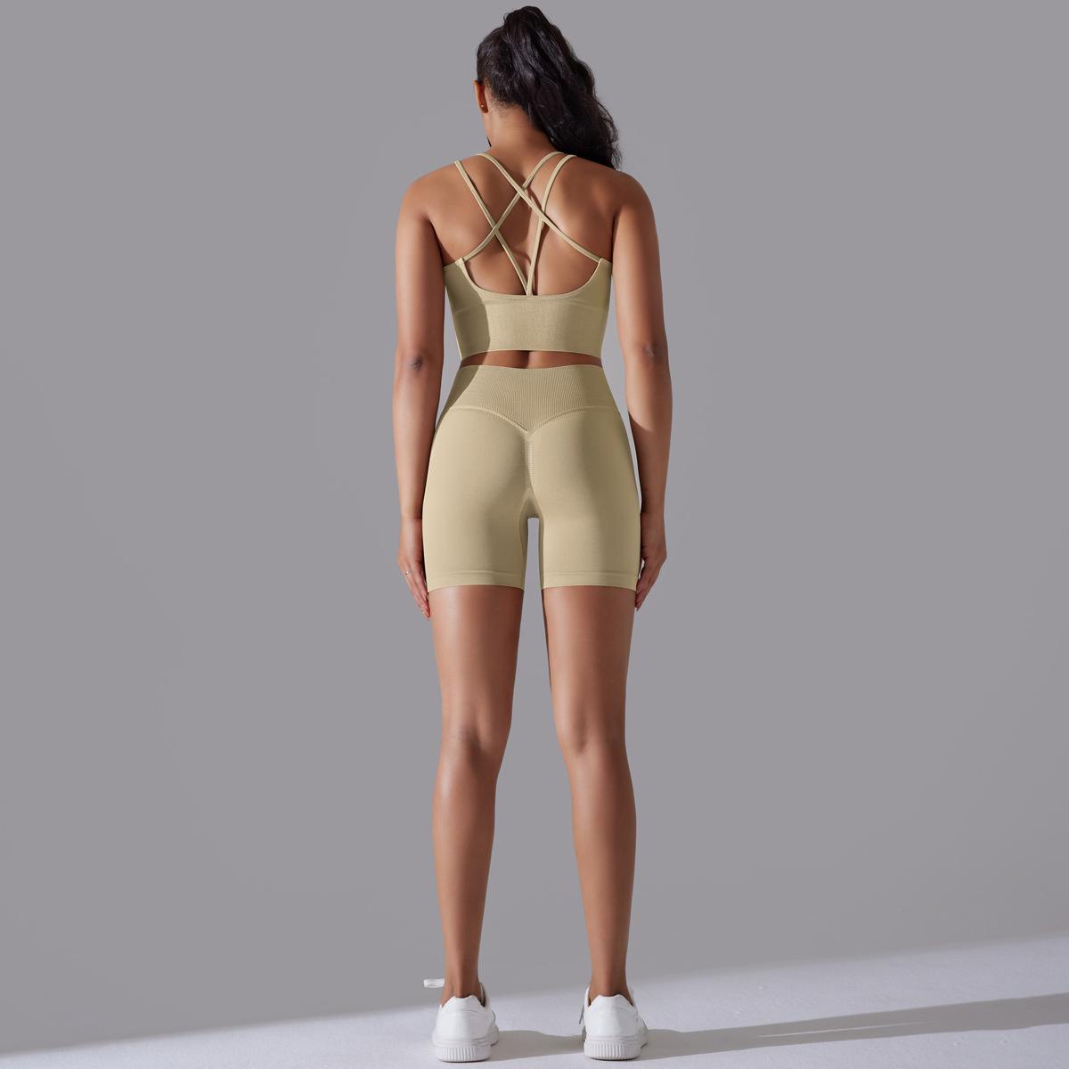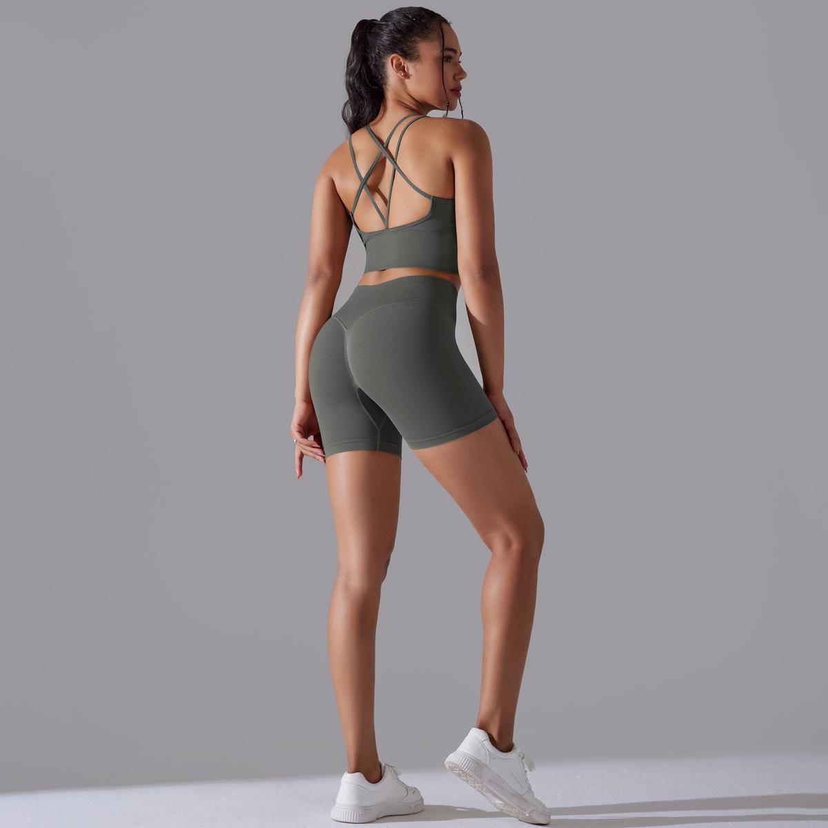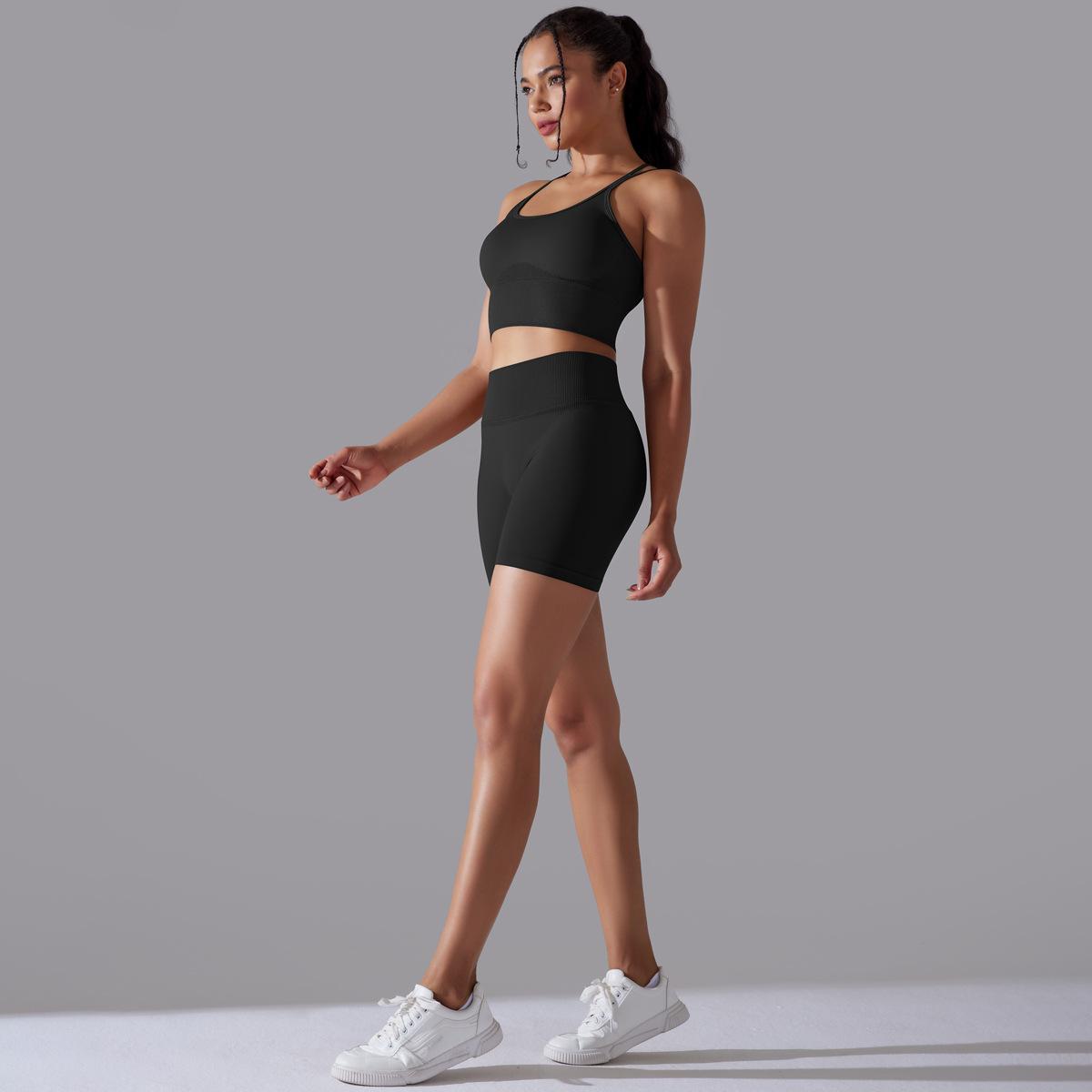 Traje de yoga ajustado deportivo de alta elasticidad con espalda descubierta de color sólido tejido sin costuras transfronterizo europeo y americano, traje de dos piezas para correr y fitness