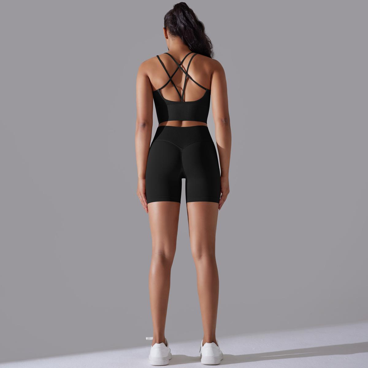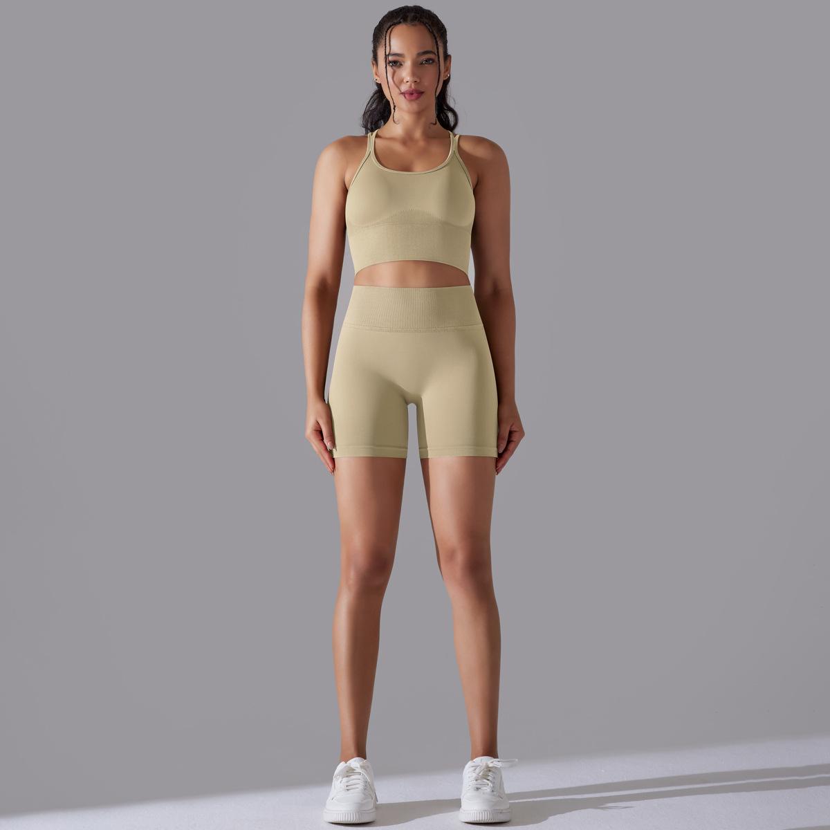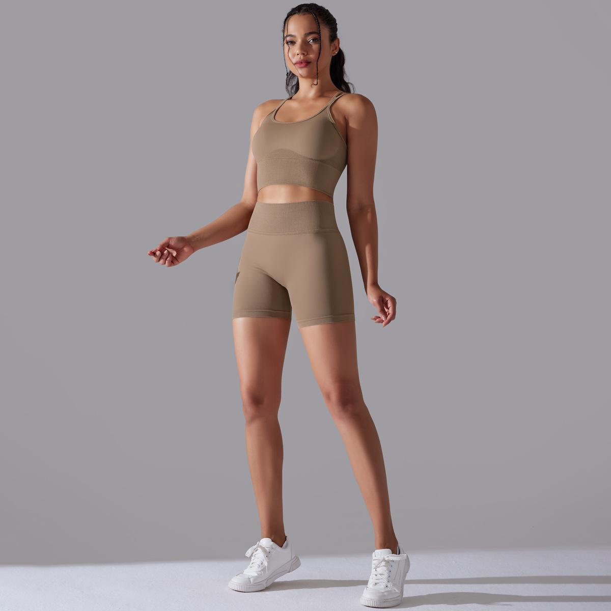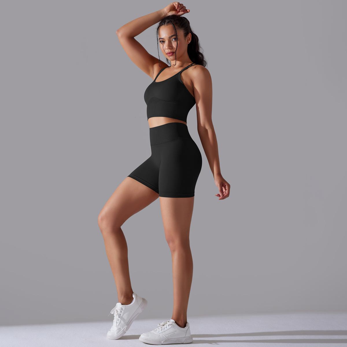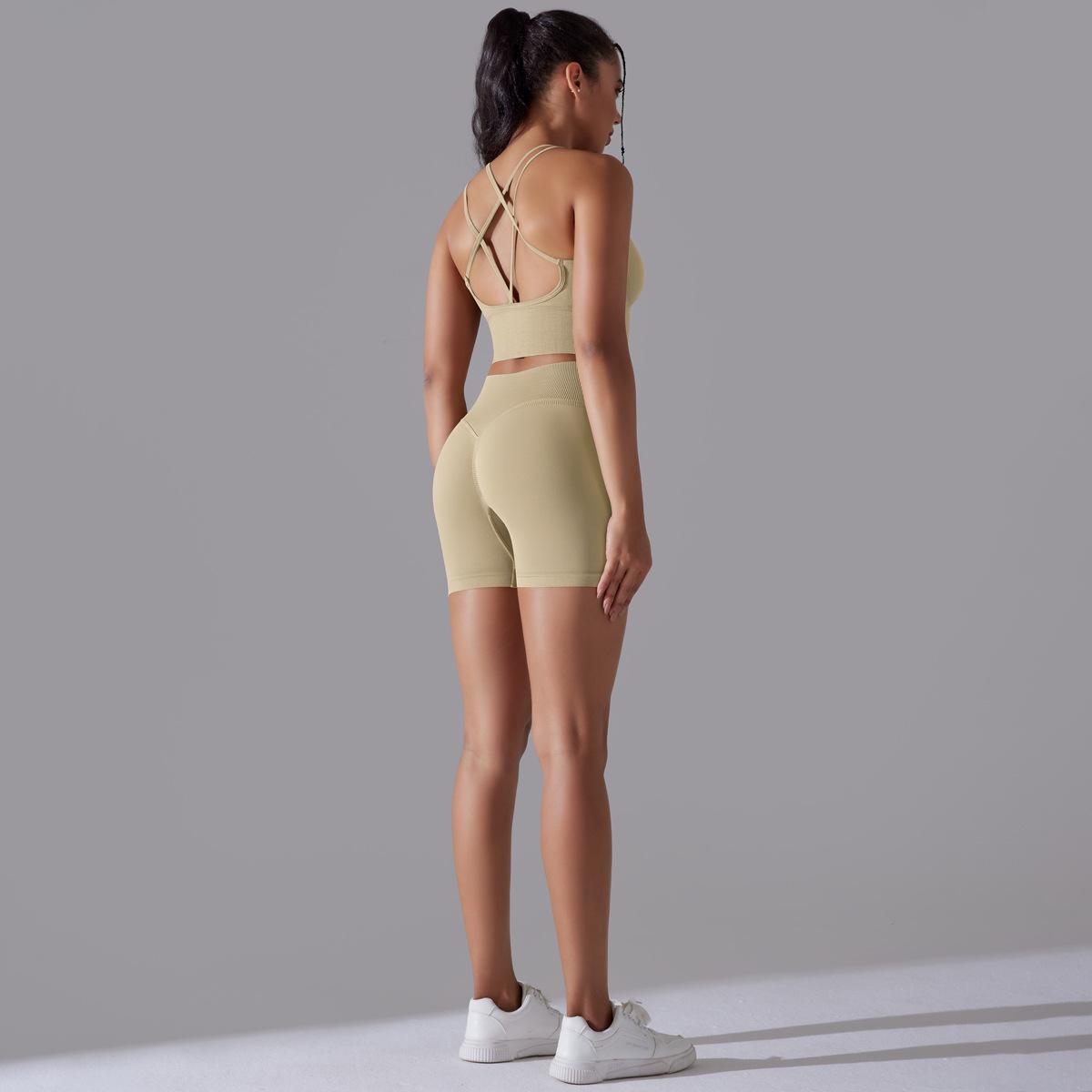 Traje de yoga ajustado deportivo de alta elasticidad con espalda descubierta de color sólido tejido sin costuras transfronterizo europeo y americano, traje de dos piezas para correr y fitness