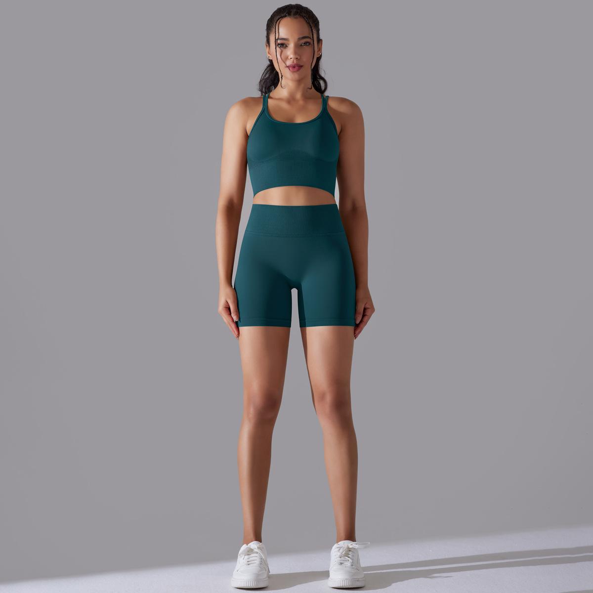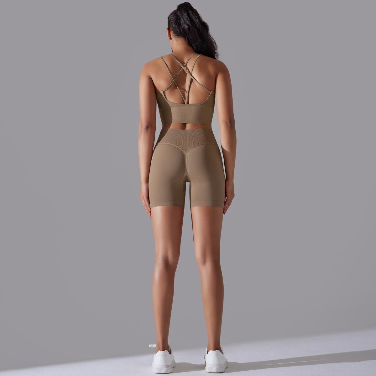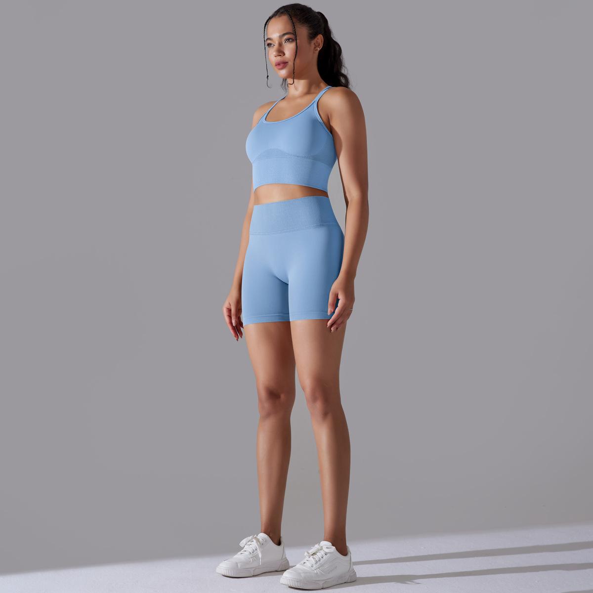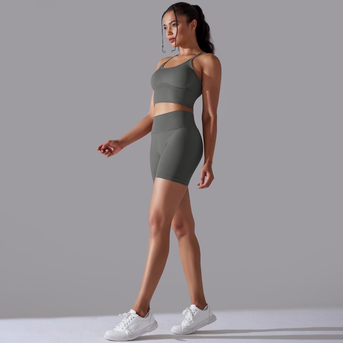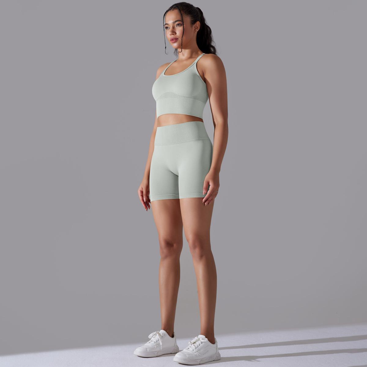 Traje de yoga ajustado deportivo de alta elasticidad con espalda descubierta de color sólido tejido sin costuras transfronterizo europeo y americano, traje de dos piezas para correr y fitness