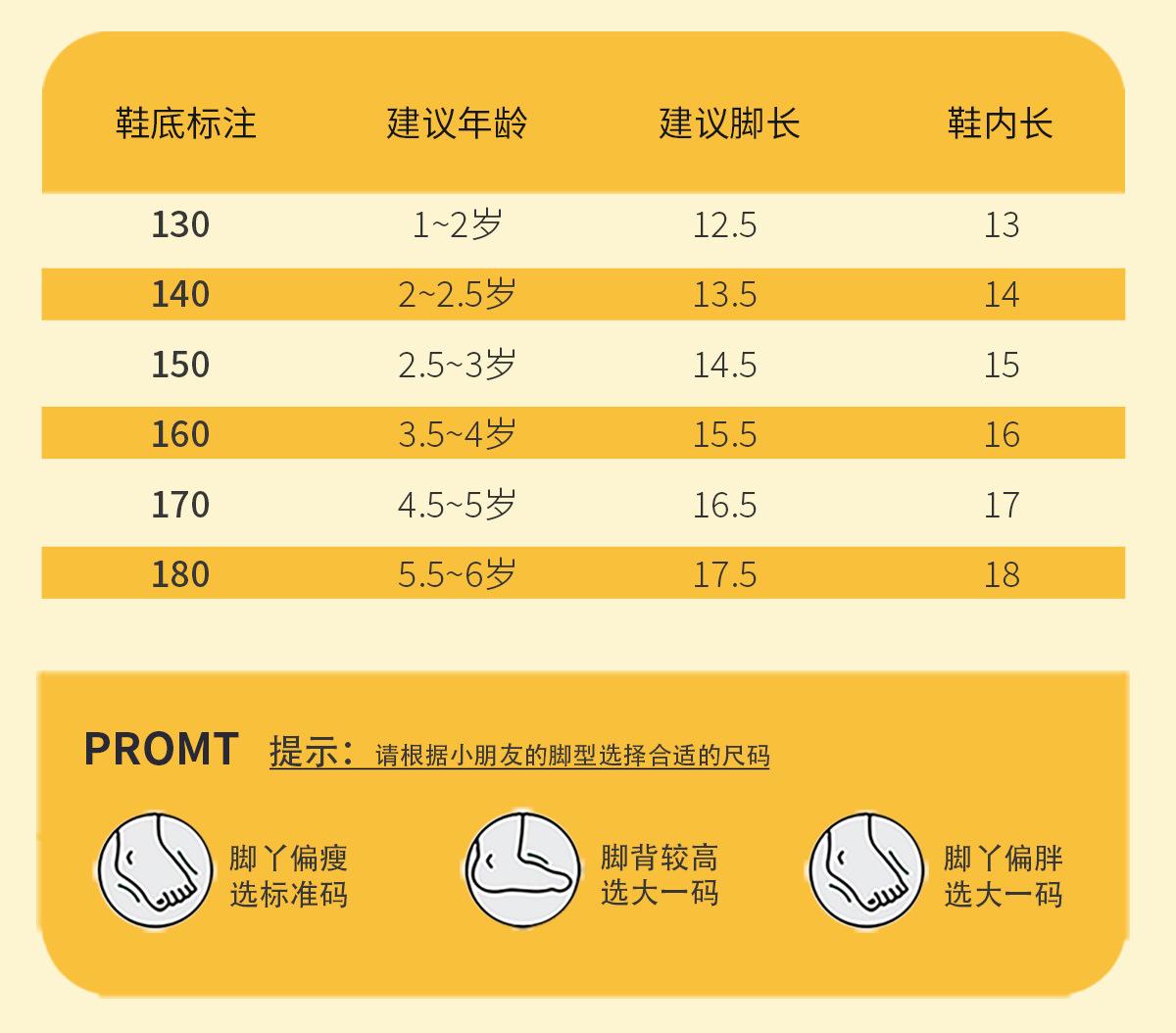 [130] Shoe length 13CM recommended foot length 12.5CM, [140] Shoe length 14CM recommended foot length 13.5CM, ...