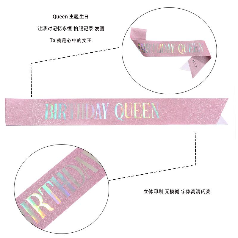 Lista de correas de hombro y cinturones ceremoniales de tela con brillo de REINA DE CUMPLEAÑOS a juego