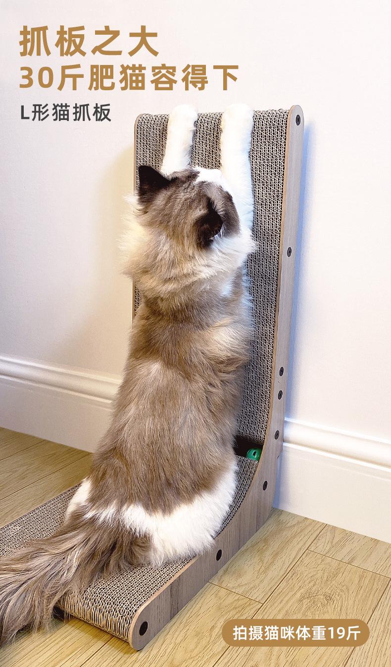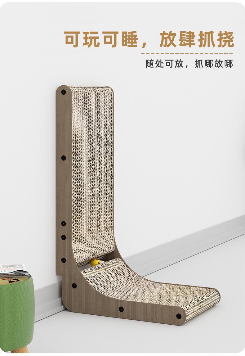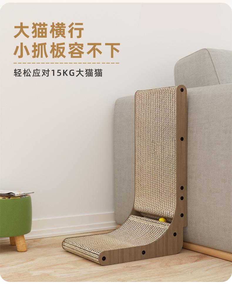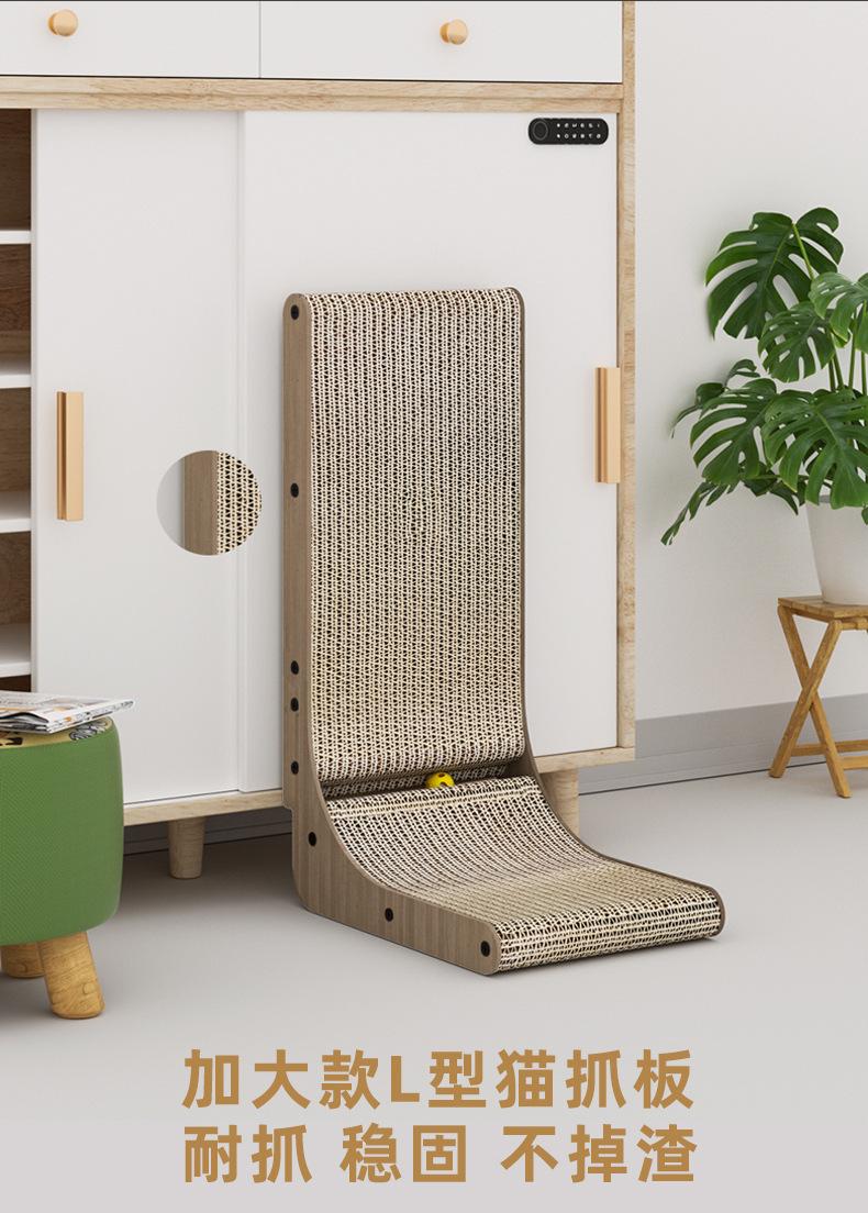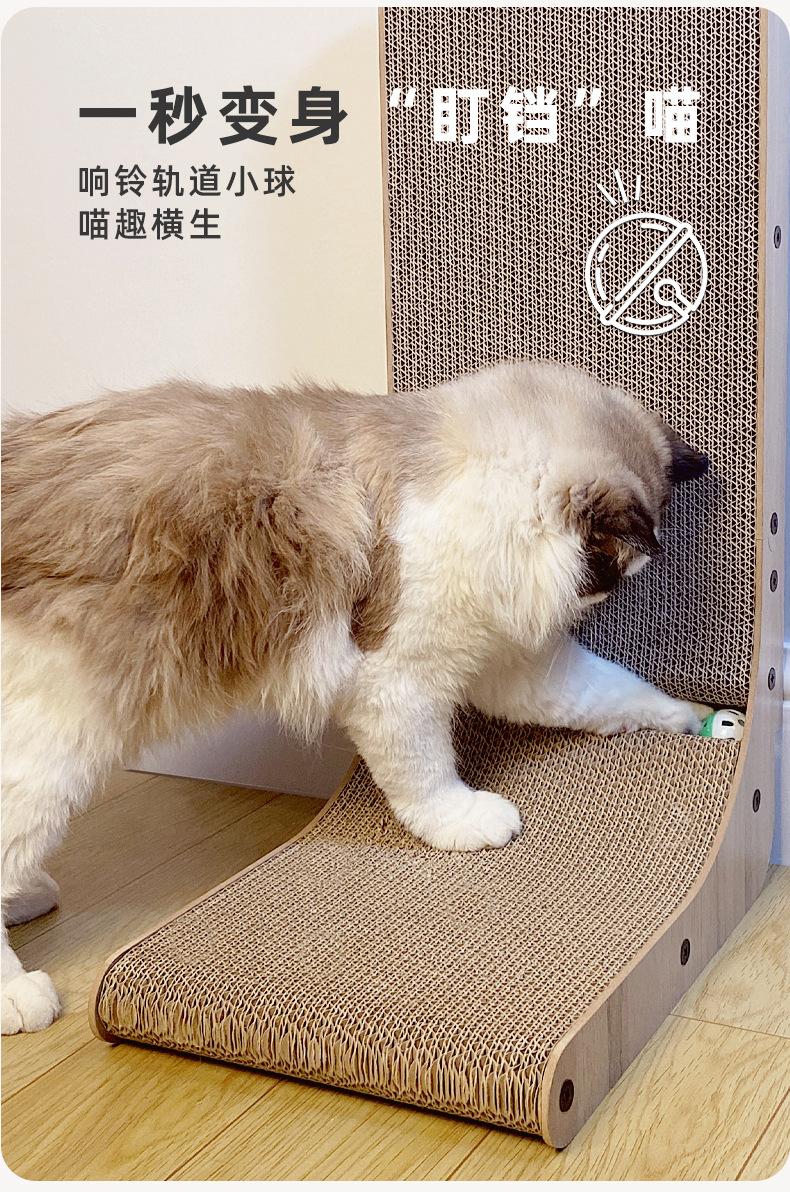 Rascador vertical para gatos de cartón corrugado personalizado con juguete para gatos de bola con campana en forma de L