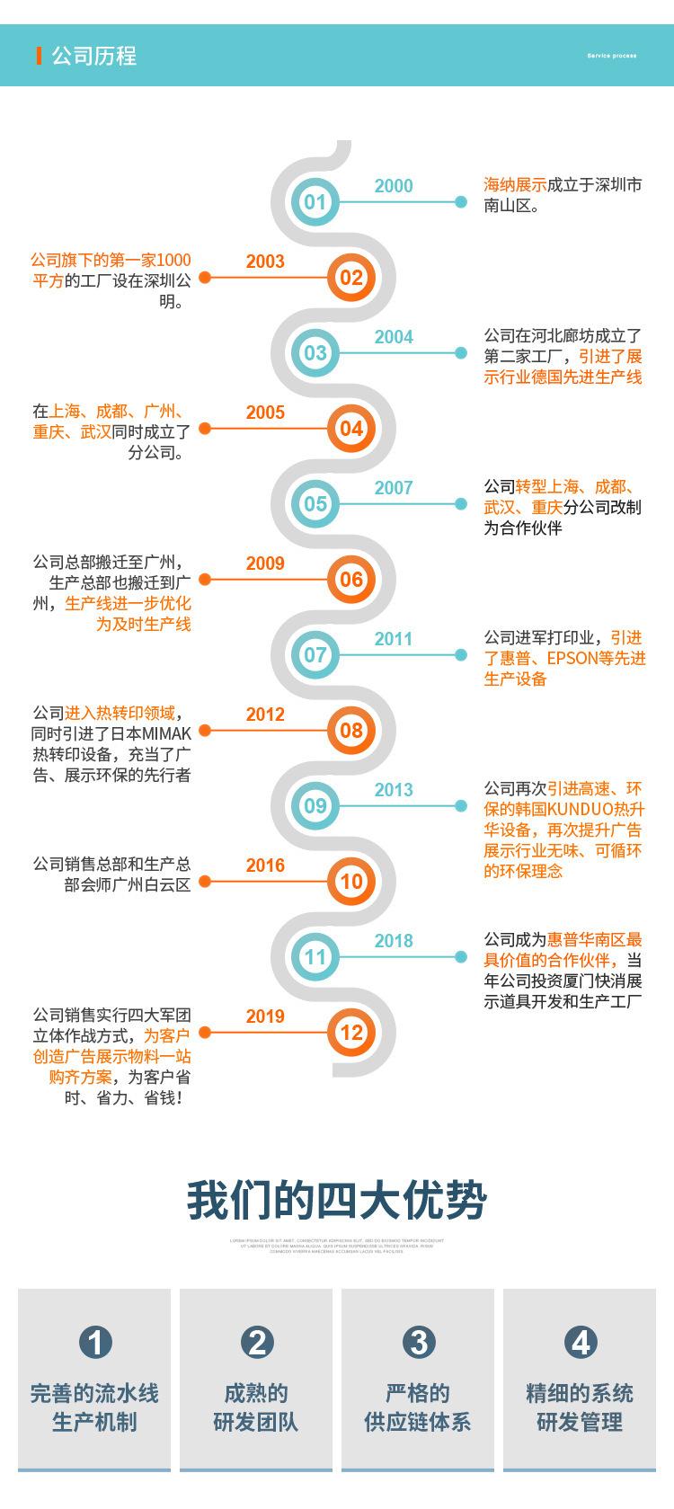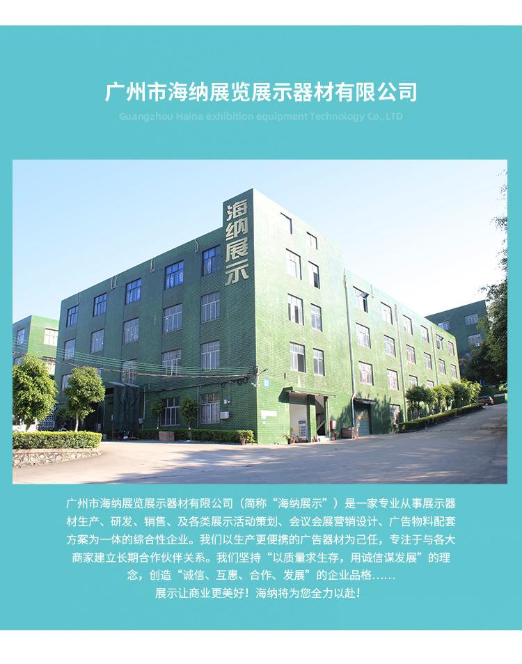 Guangzhou Haina Exhibition Display Equipment Co., Ltd. (en adelante, "Haina Display") es un fabricante de diversos tipos de stands promocionales, exhibiciones de cortina rápida, exhibiciones rápidas, roll-ups y proveedor de equipos publicitarios y displays para terminales. La empresa se fundó en Shenzhen en 2003 y trasladó su sede a Guangzhou en 2009. Actualmente, la sede de Guangzhou Haina está compuesta por la fábrica de equipos de exhibición Hebei Bazhou Haina, la fábrica de exhibiciones de cortina rápida de Guangzhou y la fábrica de producción de terminales de Guangzhou Haina.