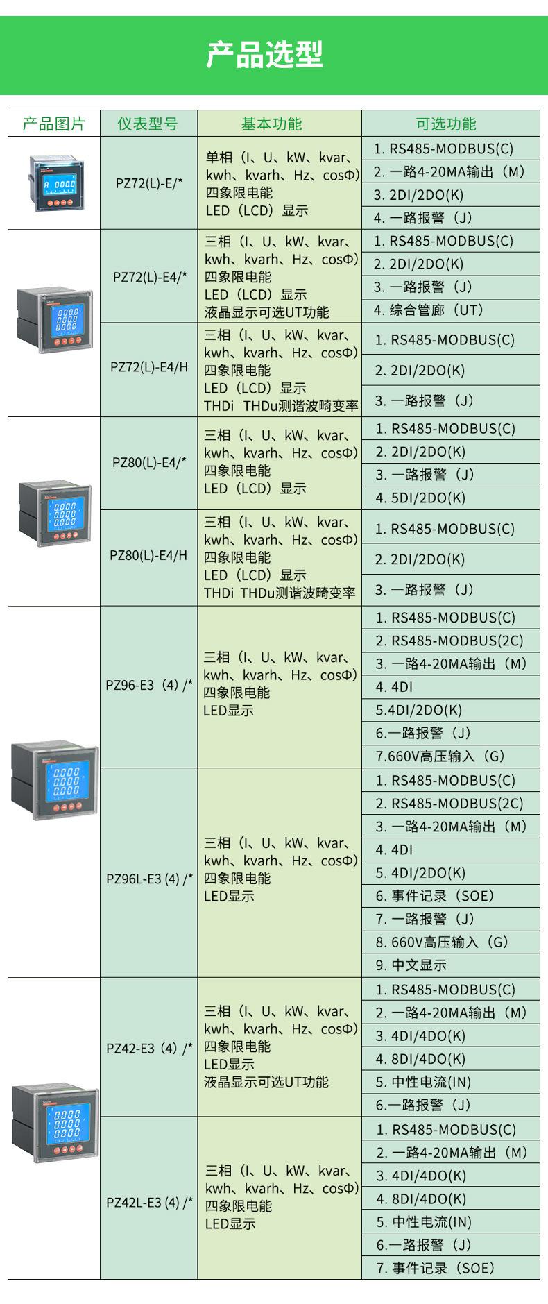 PZ72-E basic model, PZ72-E/C with RS485 communication, PZ72-E/M with a 4-20mA output, PZ72-E/KC with switch qu...
