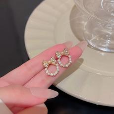Pendientes de Plata S925 Exquisitos Micro-Incrustados de Lazo Zirconia Pendientes de Perlas de Temperamento Versátiles de Moda Ins para Mujer Joyería