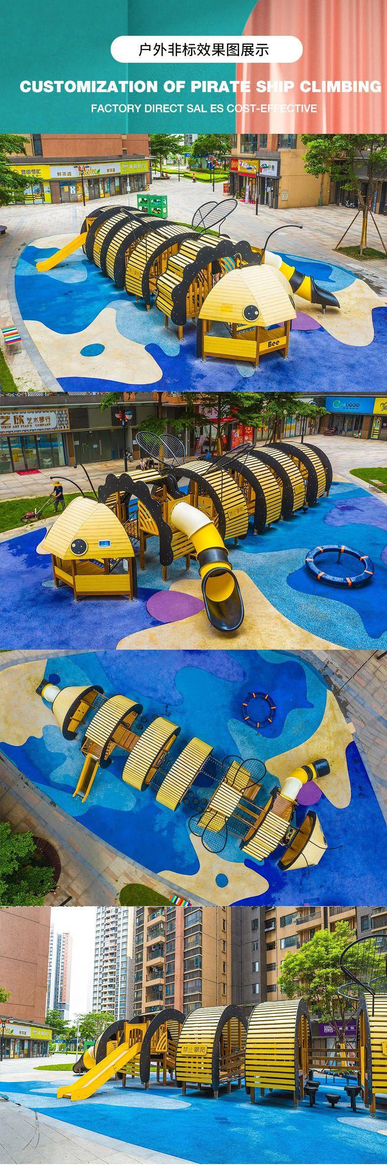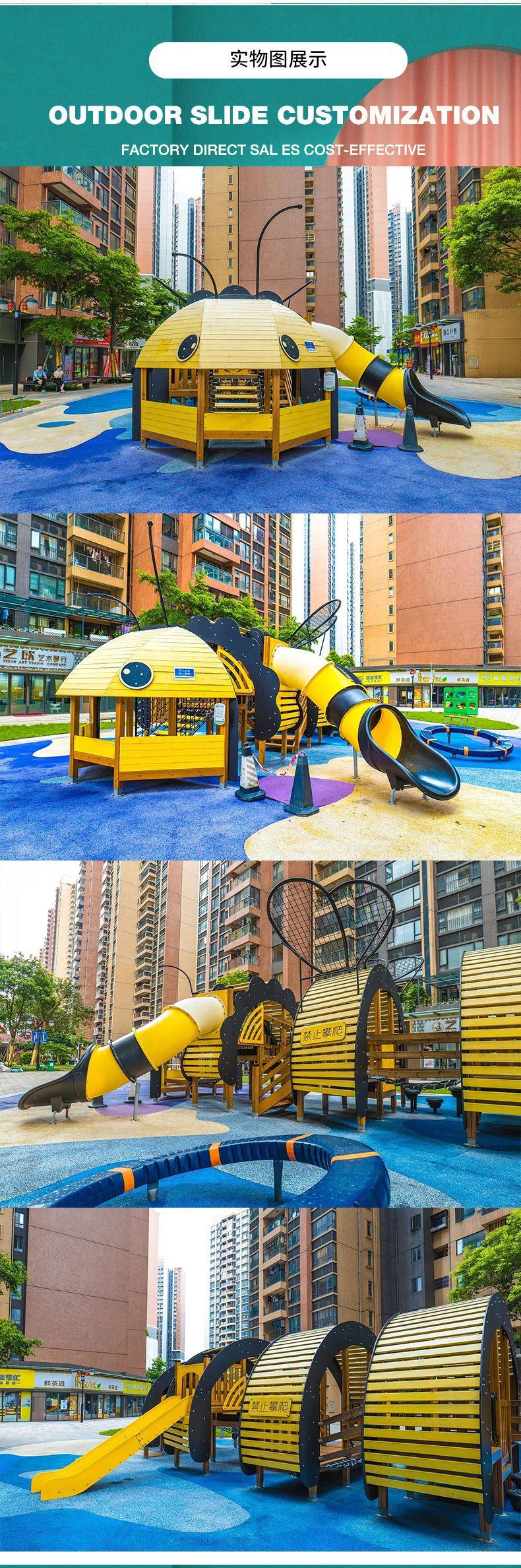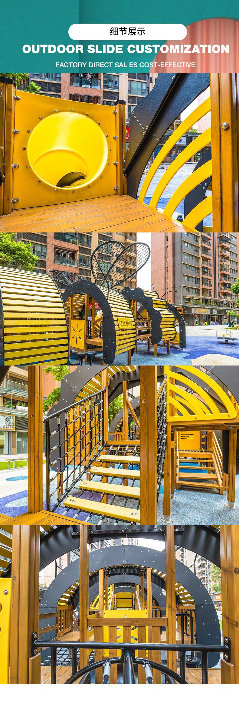 Tobogán de madera y plástico de acero inoxidable para niños, grande, para exteriores, con estructura de escalada, para instalaciones de entretenimiento comunitarias. Bienes raíces.