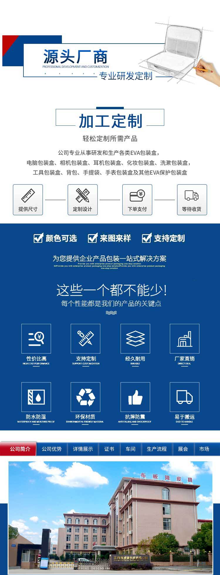 Jiangxi Buweilong Technology Co., Ltd. se estableció enEn 2001, la sede se ubicó en la ciudad de Dongguan. Es un fabricante especializado en diseño de productos de cajas de embalaje de EVA, producción y desarrollo de cajas de embalaje. La fábrica ha pasado la certificación del sistema de calidad ISO9001-2000, tiene 18 años de experiencia profesional en producción, cuenta con diversos equipos de producción avanzados, personal profesional de diseño de I+D y más de 150 trabajadores técnicos.