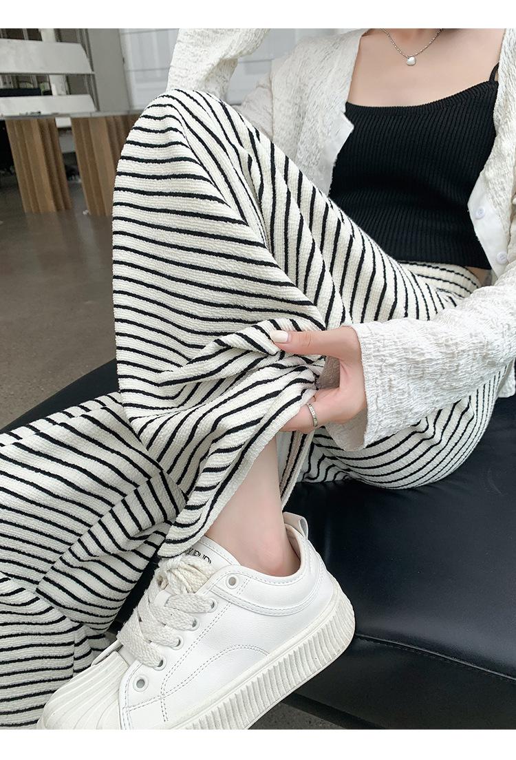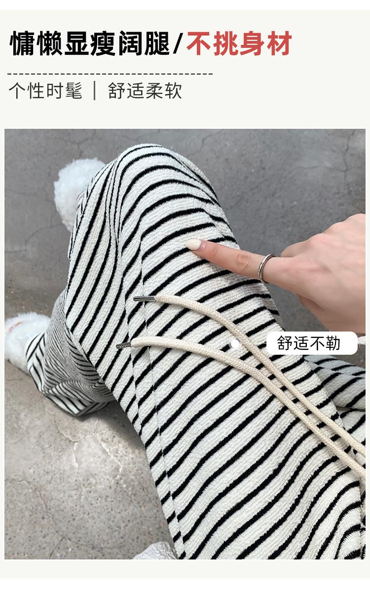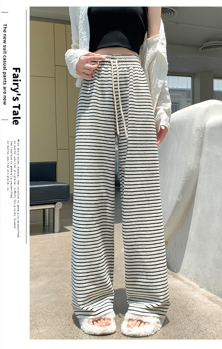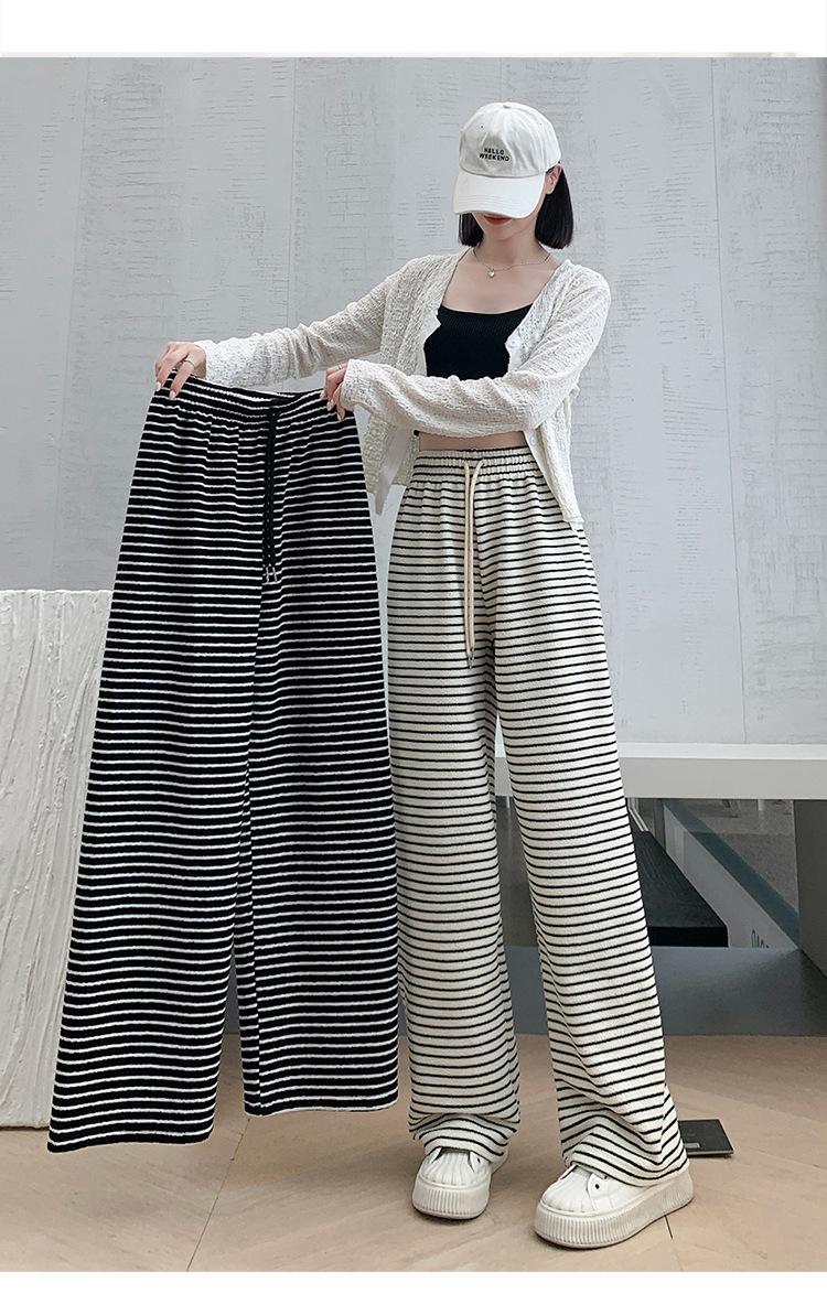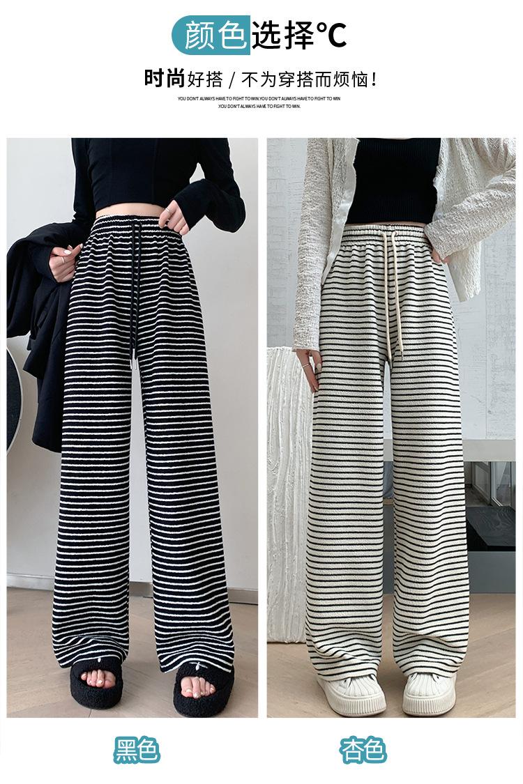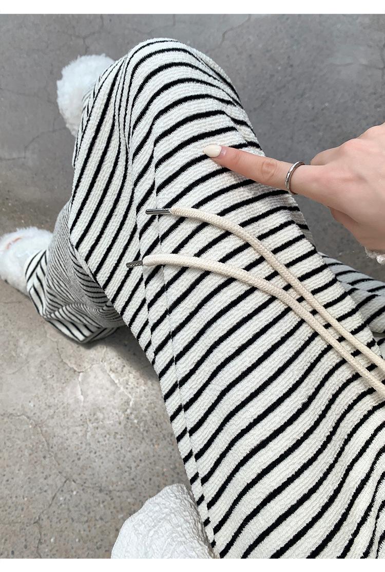 Pantalones de Terciopelo Terry a Rayas Blancas y Negras de Pierna Ancha para Mujer Otoño e Invierno Nuevo Cintura Alta Sueltos con Cordón Deportivo Drapeado Crema Pantalones Casuales
