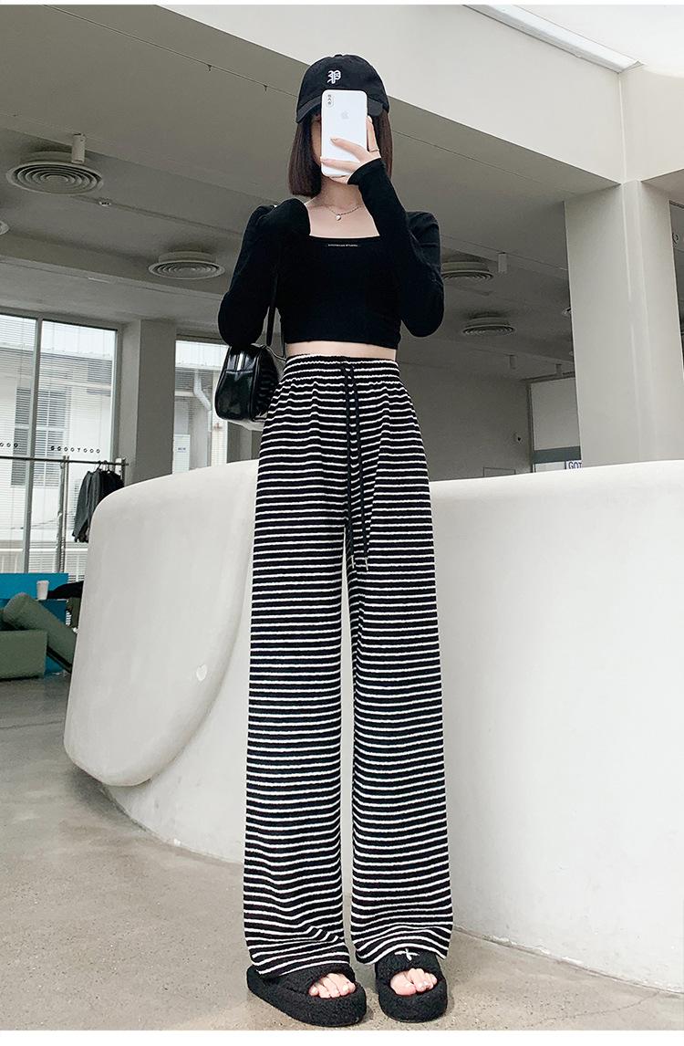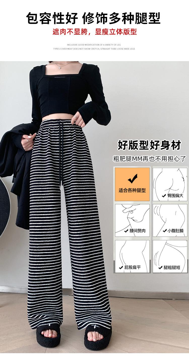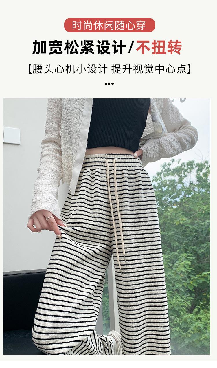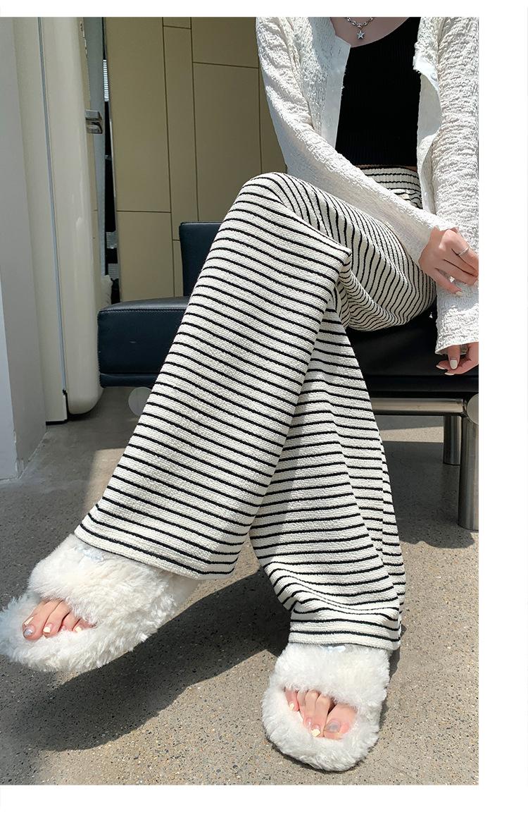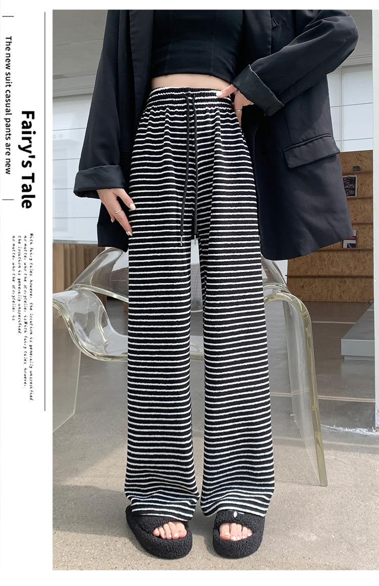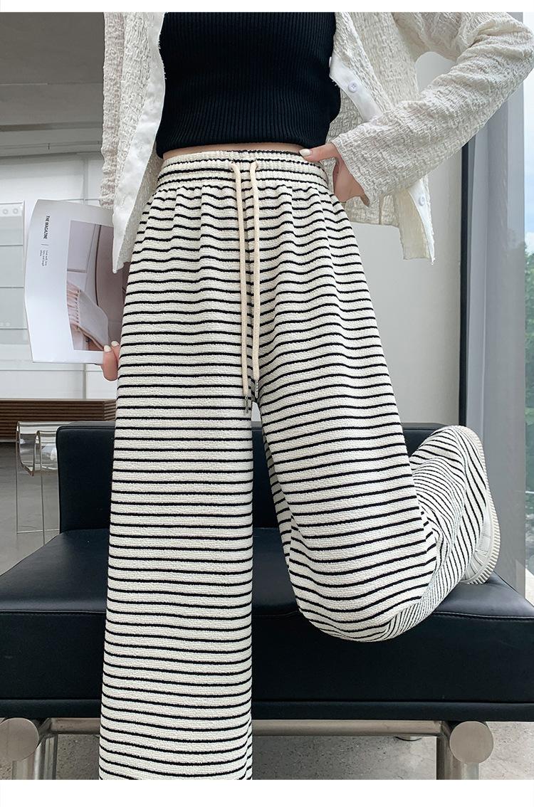 Pantalones de Terciopelo Terry a Rayas Blancas y Negras de Pierna Ancha para Mujer Otoño e Invierno Nuevo Cintura Alta Sueltos con Cordón Deportivo Drapeado Crema Pantalones Casuales
