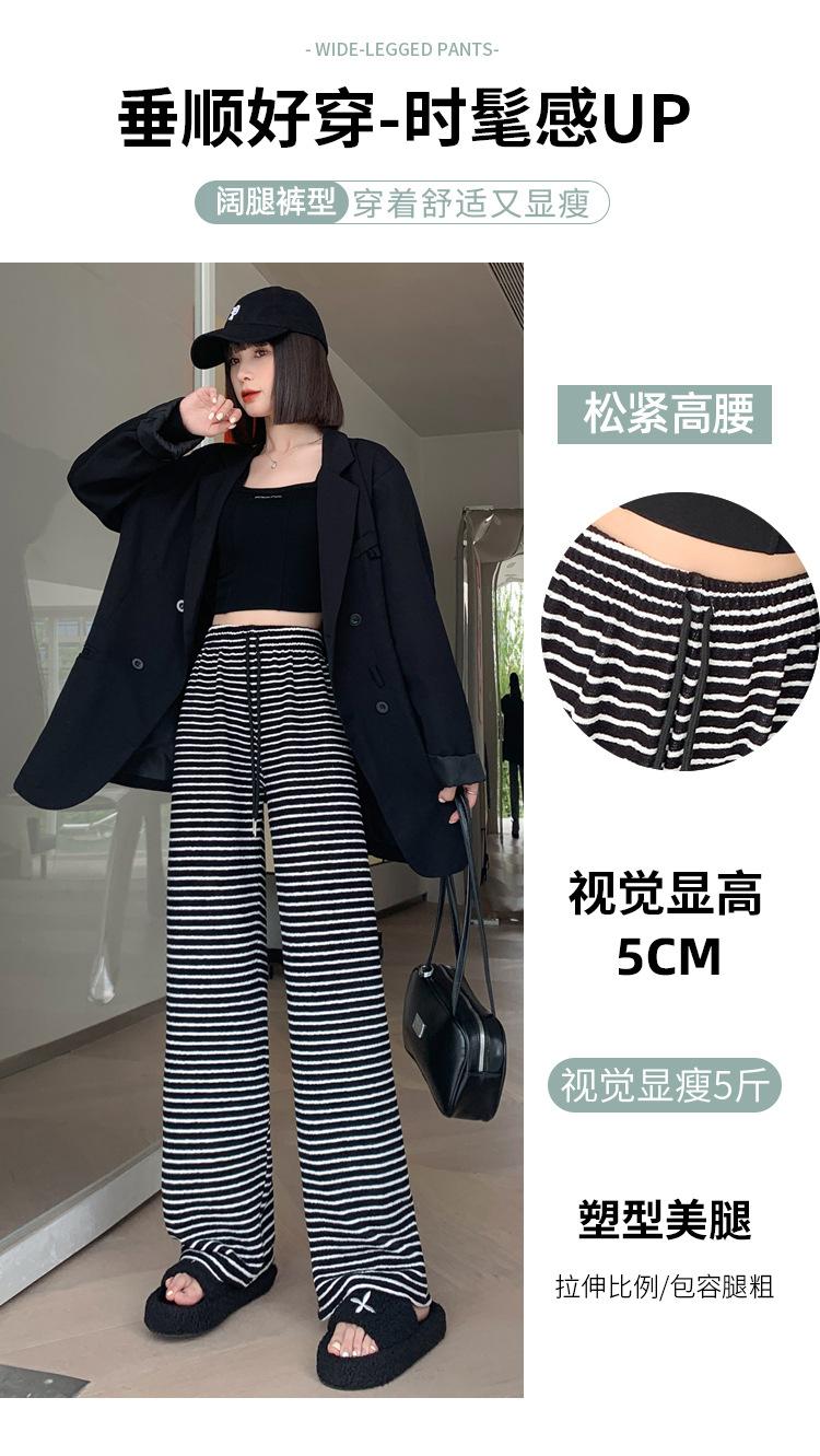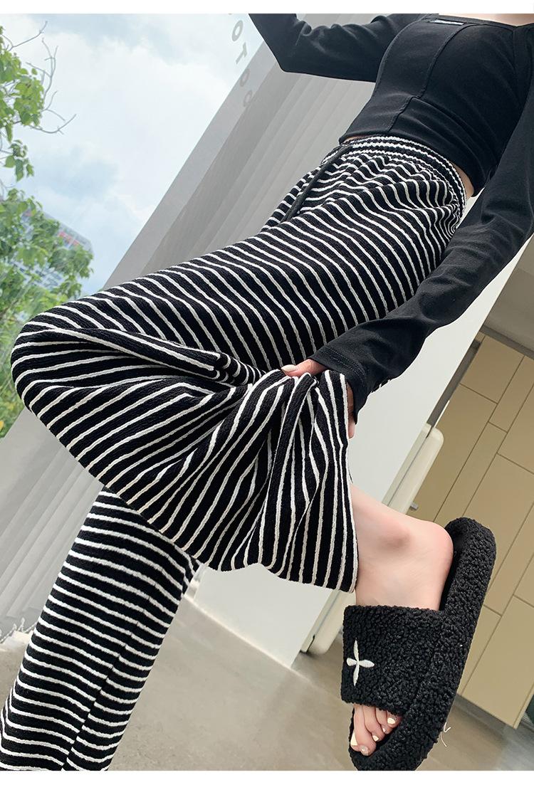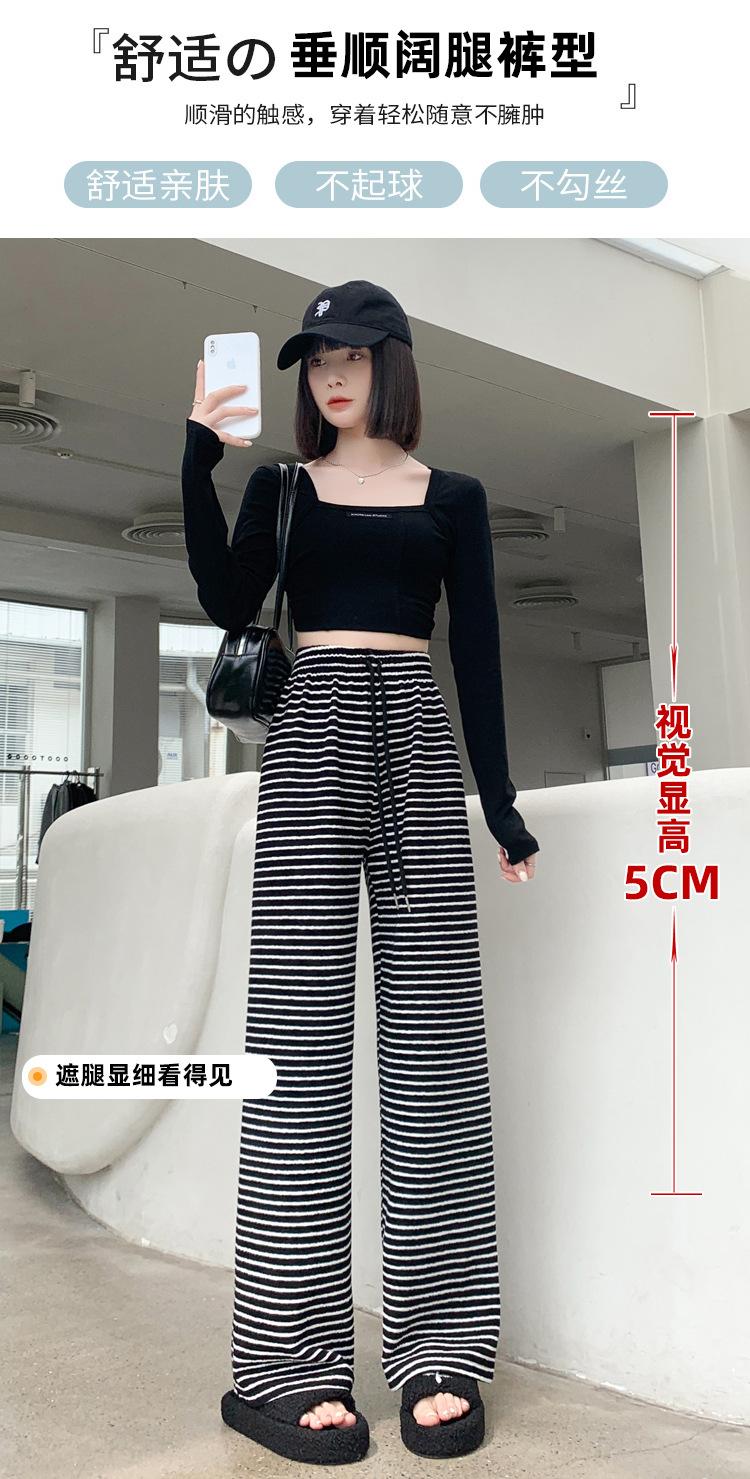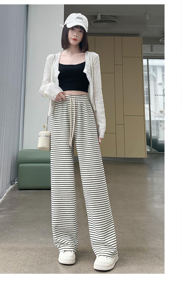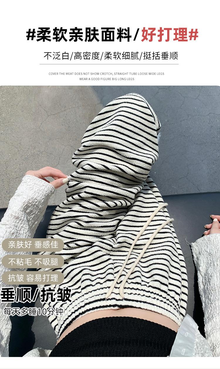 Pantalones de Terciopelo Terry a Rayas Blancas y Negras de Pierna Ancha para Mujer Otoño e Invierno Nuevo Cintura Alta Sueltos con Cordón Deportivo Drapeado Crema Pantalones Casuales