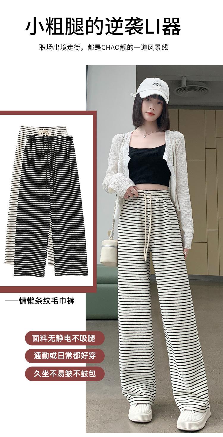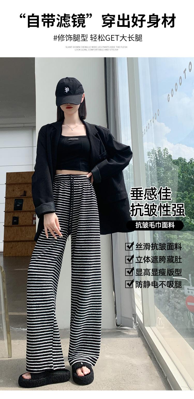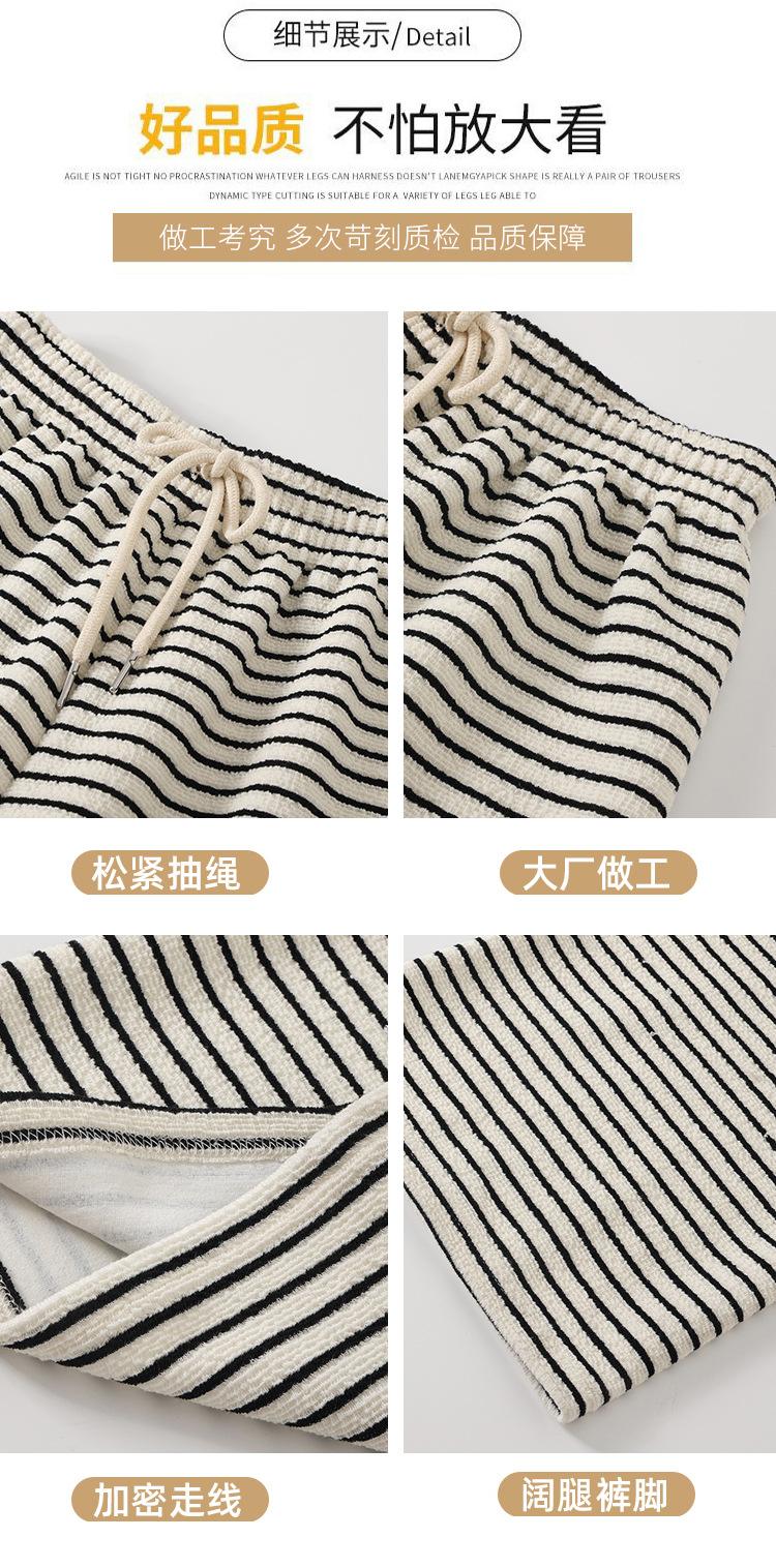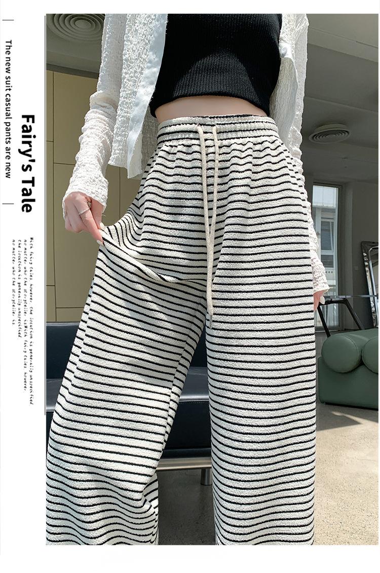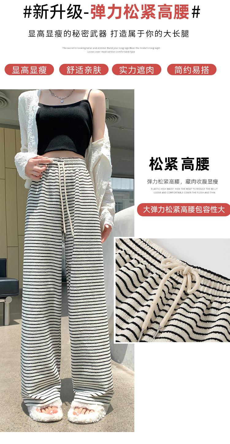 Pantalones de Terciopelo Terry a Rayas Blancas y Negras de Pierna Ancha para Mujer Otoño e Invierno Nuevo Cintura Alta Sueltos con Cordón Deportivo Drapeado Crema Pantalones Casuales