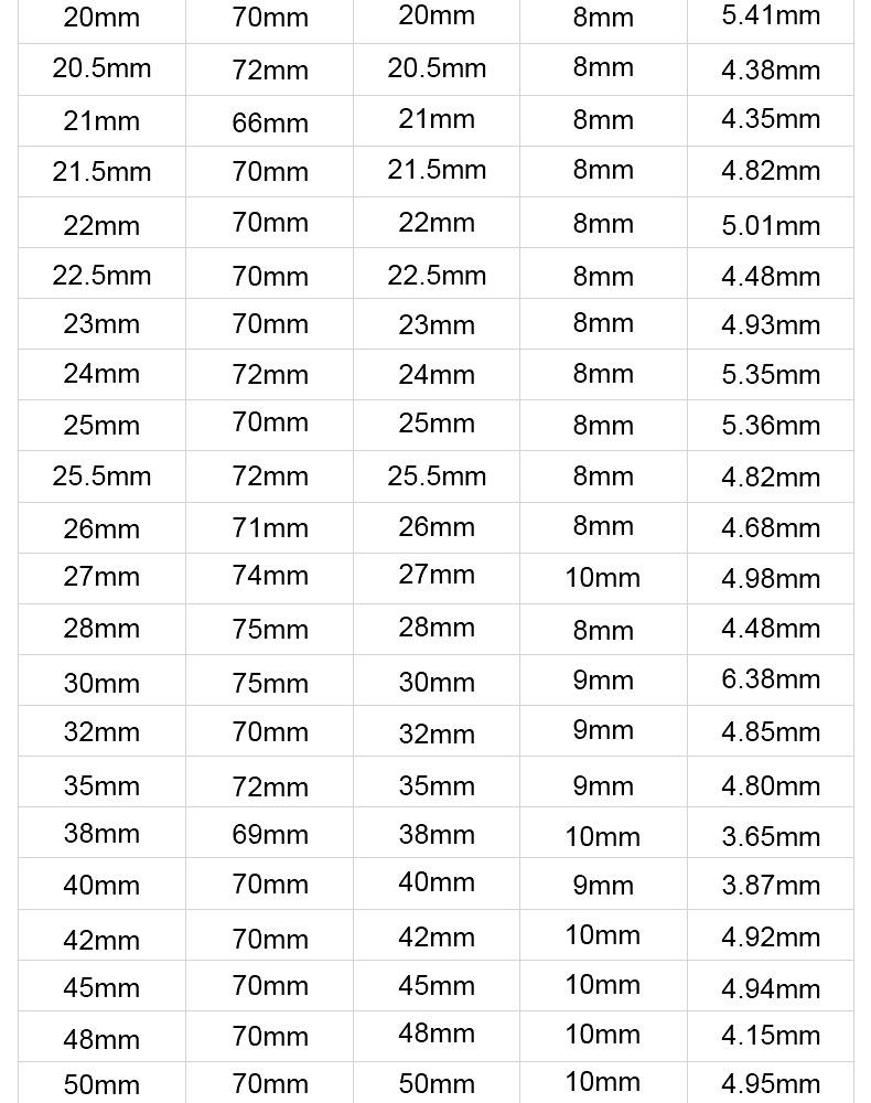 12mm, 13mm, 14mm, 15mm, 16mm, 17mm, 17.5mm, 18mm, 18.5mm, 19mm, 19.5mm, 20mm, 20.5mm, 21mm, 21.5mm, 22mm, 22.5...