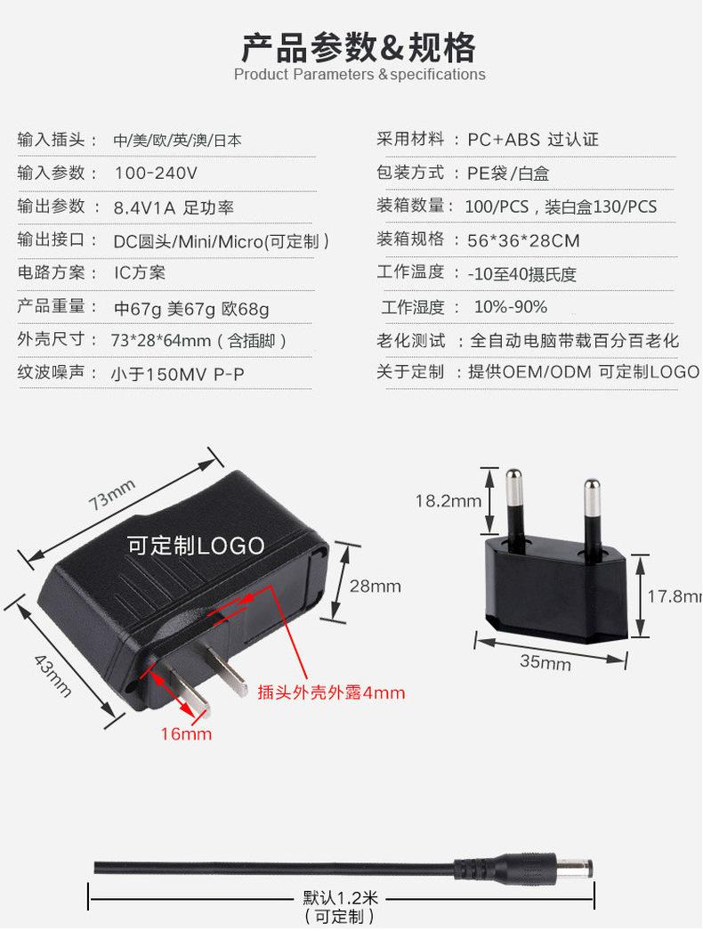 Cargador de Batería de Litio Estándar de EE. UU. y UE 8.4V 1.2A Adecuado para Acondicionadores de Aire de Cochecito y Baterías Recargables