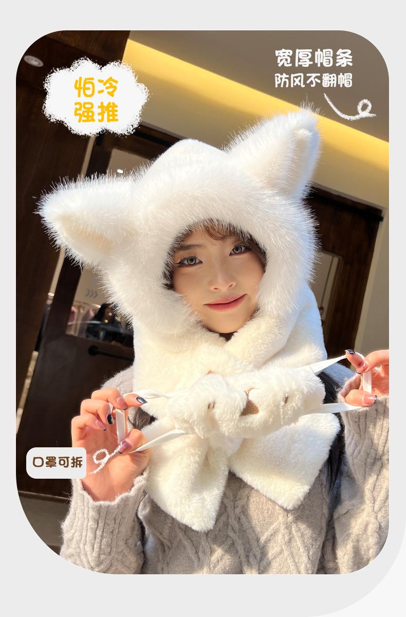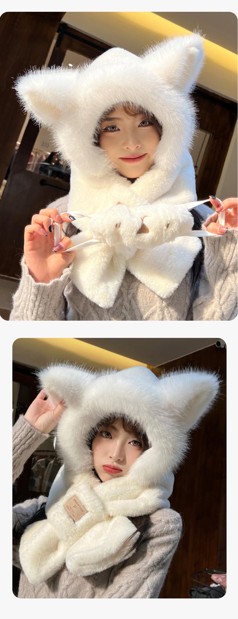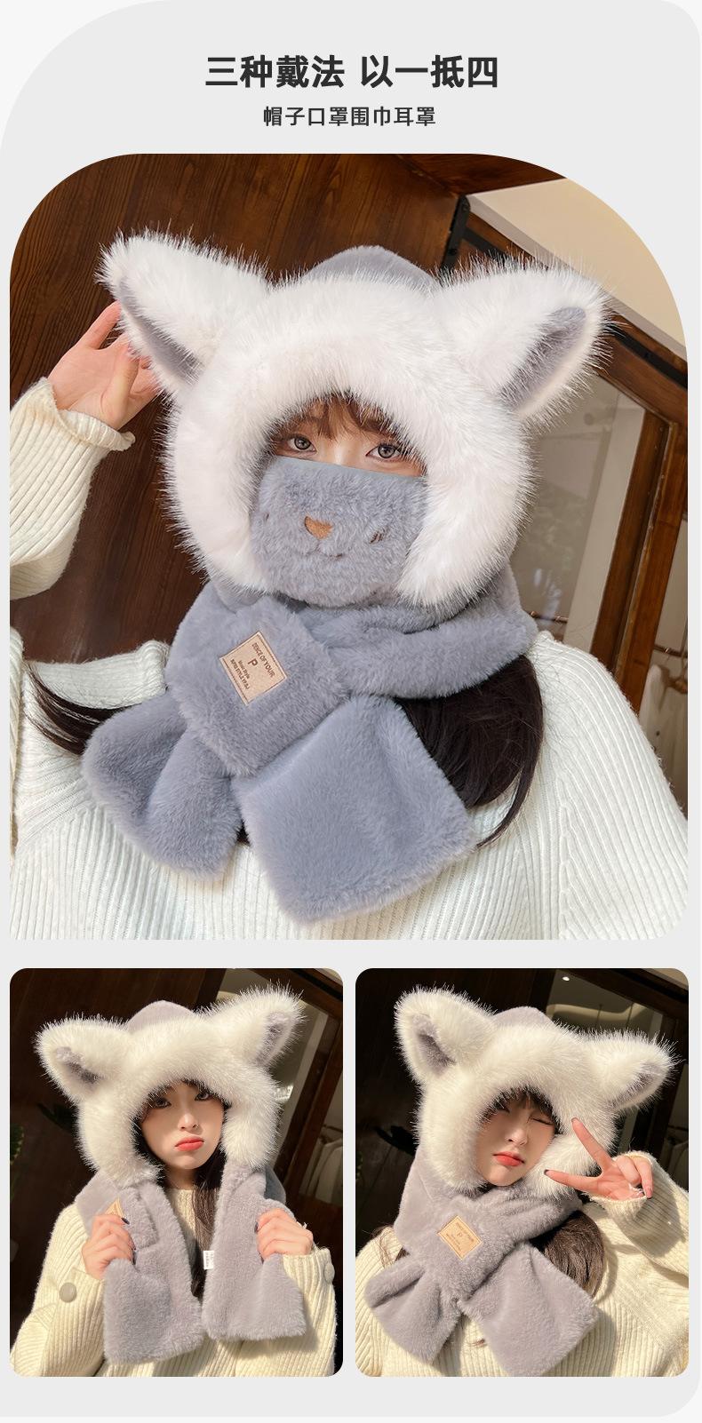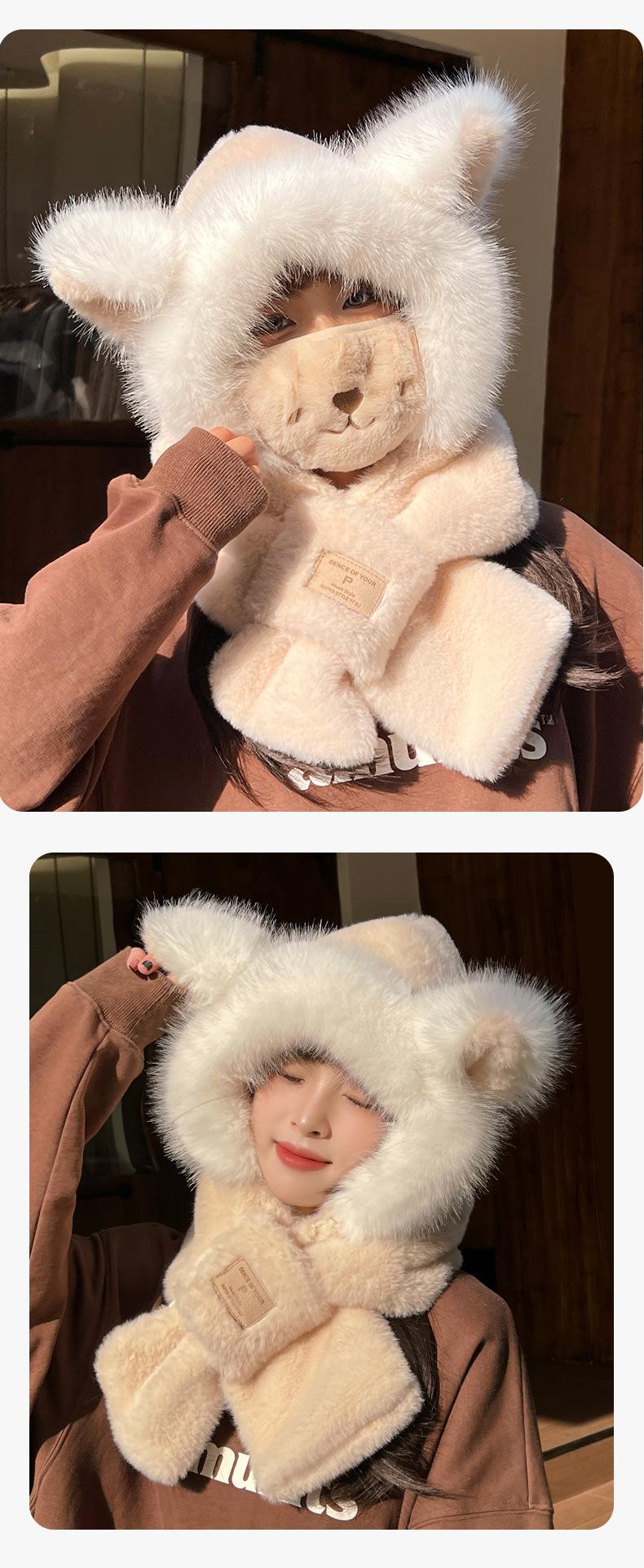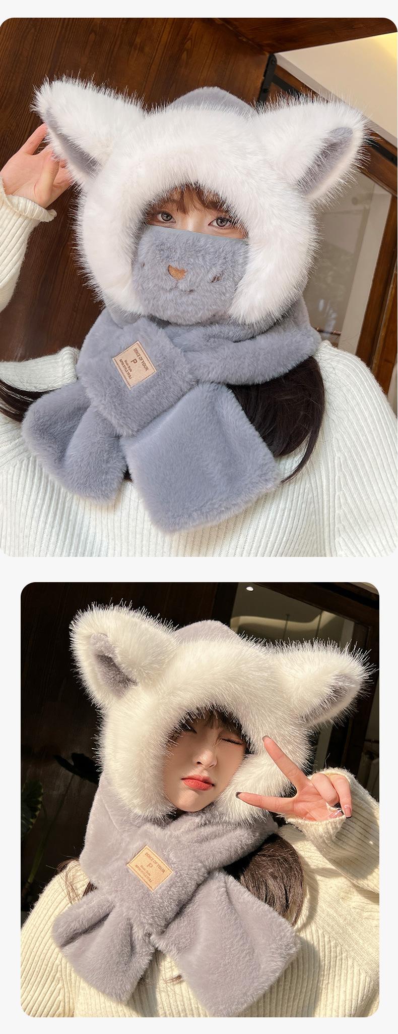 Gorro de felpa cálido para mujer, bonito gorro de invierno con orejeras gruesas de zorro, bufanda integrada para ciclismo, gorro a prueba de frío