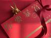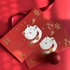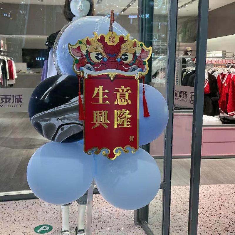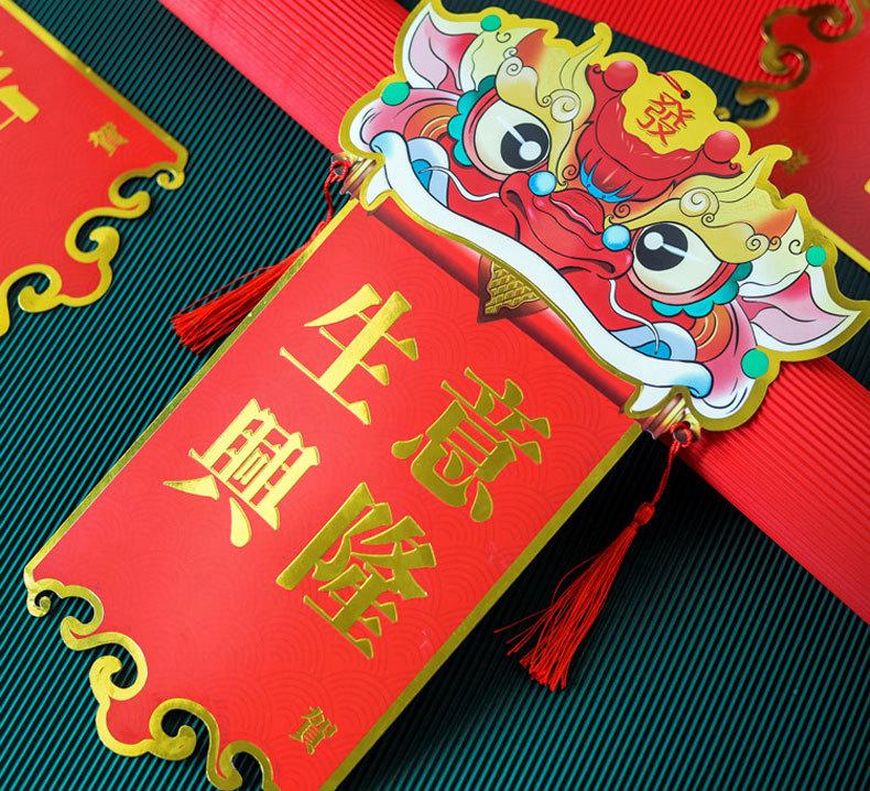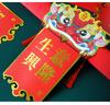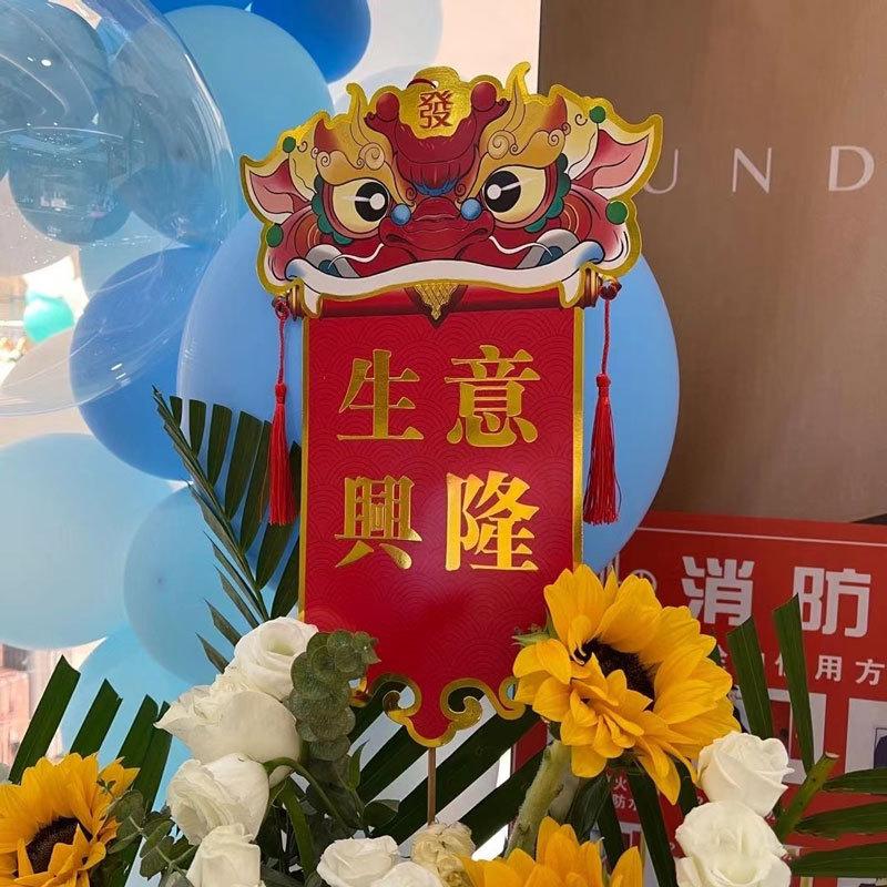 Tarjeta de apertura de nueva tienda, tarjeta de bendición de inauguración de la casa, ramo de flores, cesta de materiales de embalaje, tarjeta de felicitación festiva de danza del león dorada