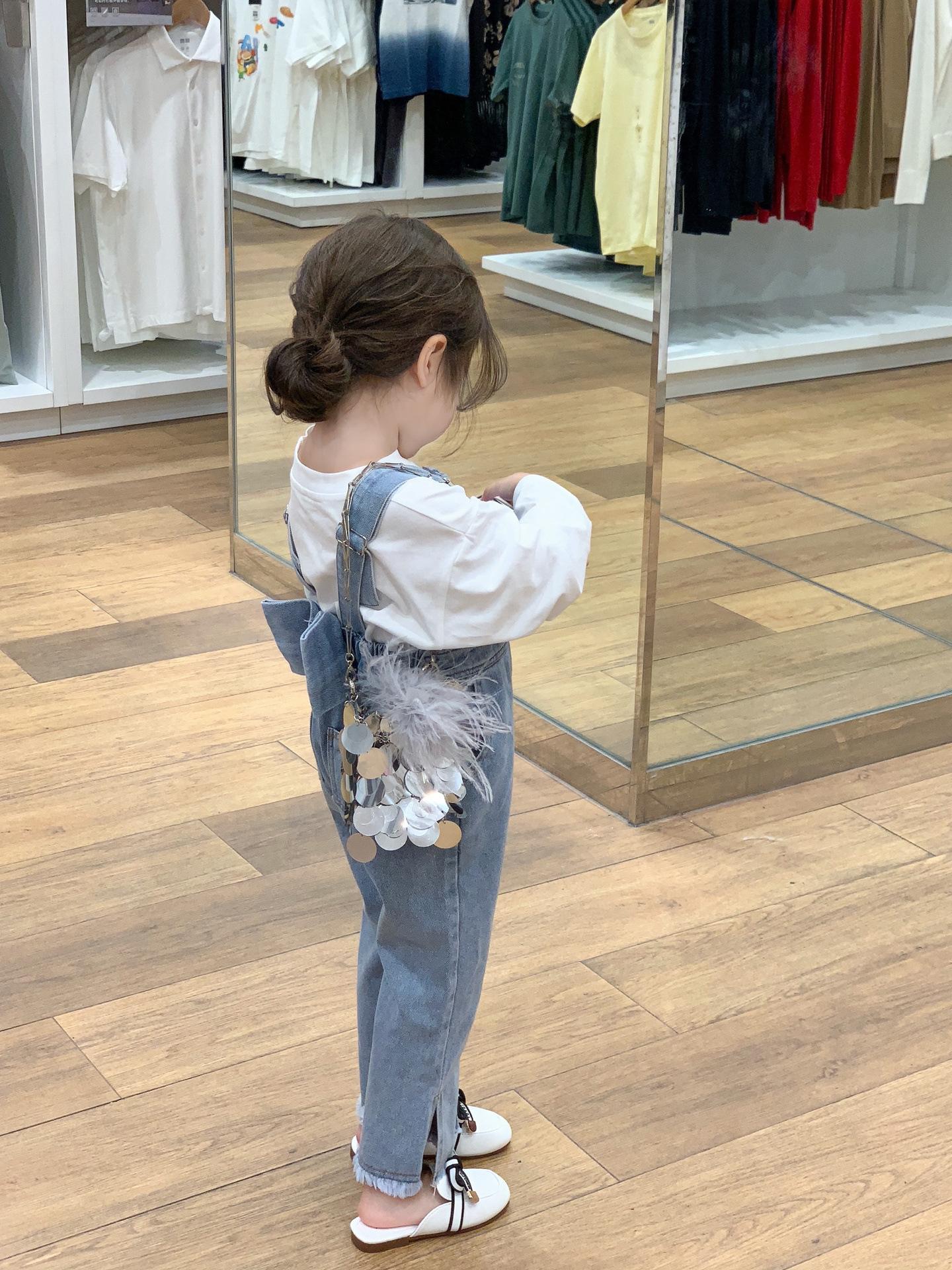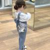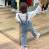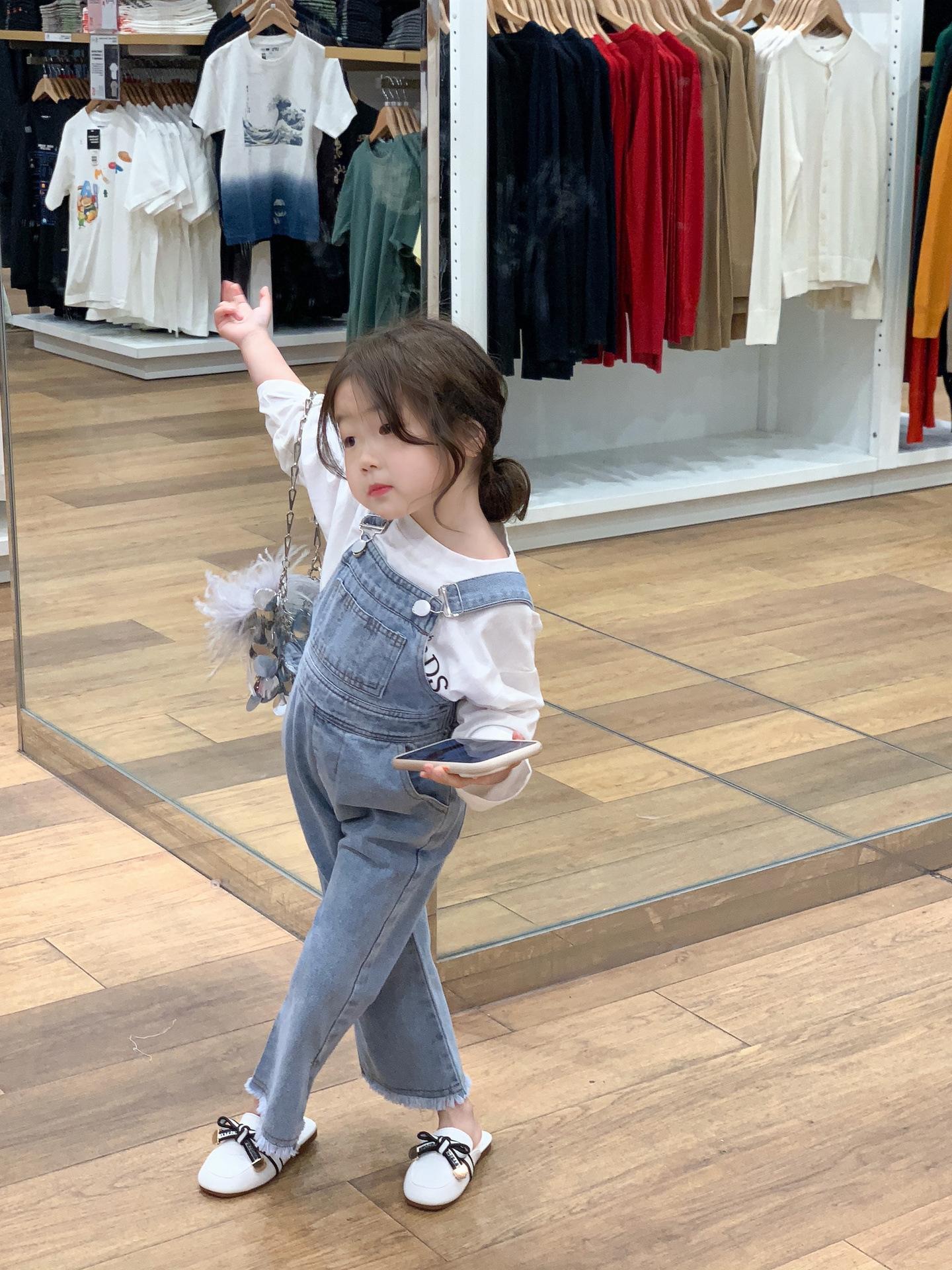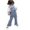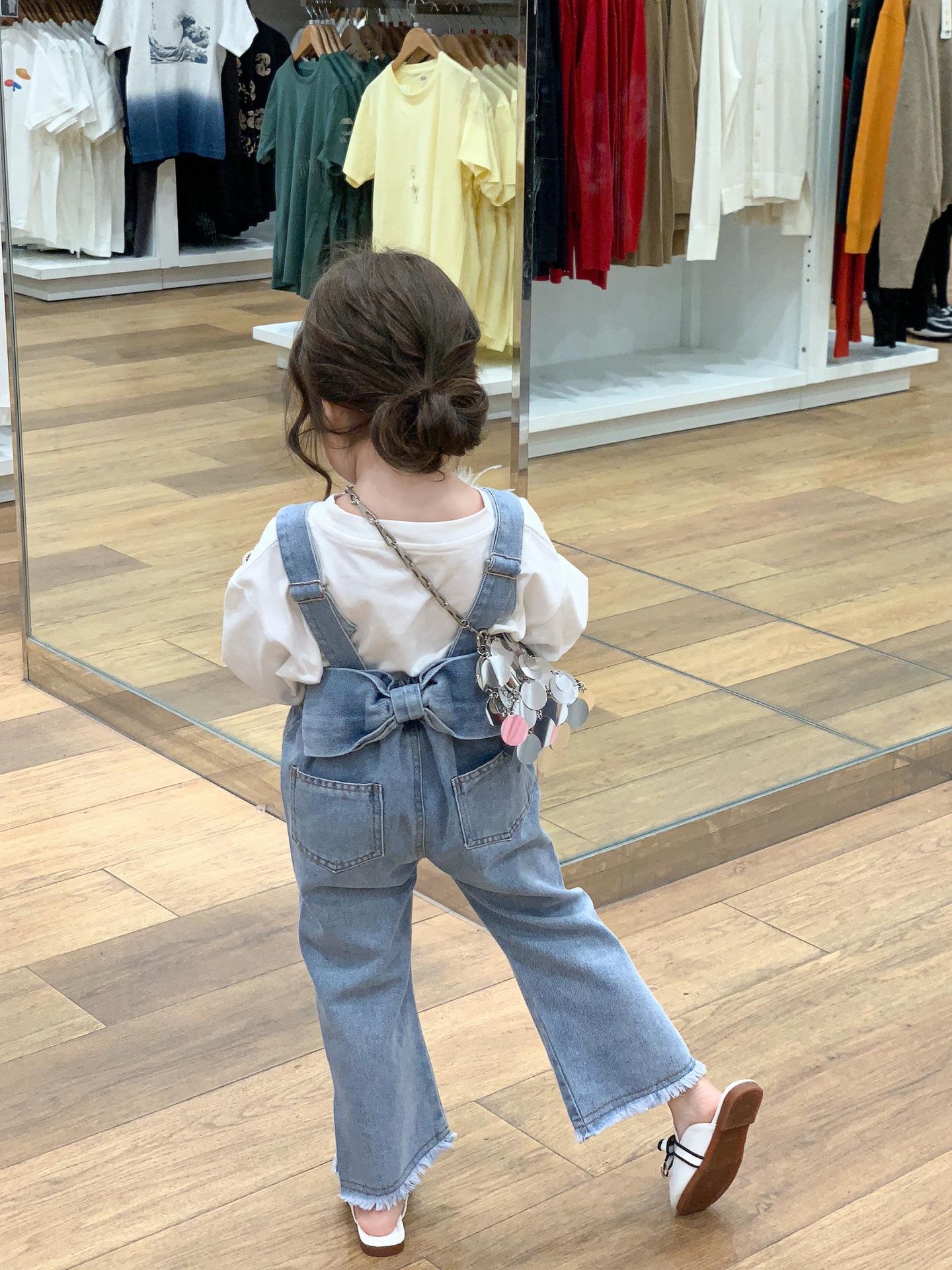 [Ordenar Racionalmente] Ropa de Primavera para Niñas Camiseta Básica de Color Puro + Pantalones de Mezclilla con Tirantes y Lazo para Niños Pequeños y Medianos