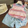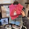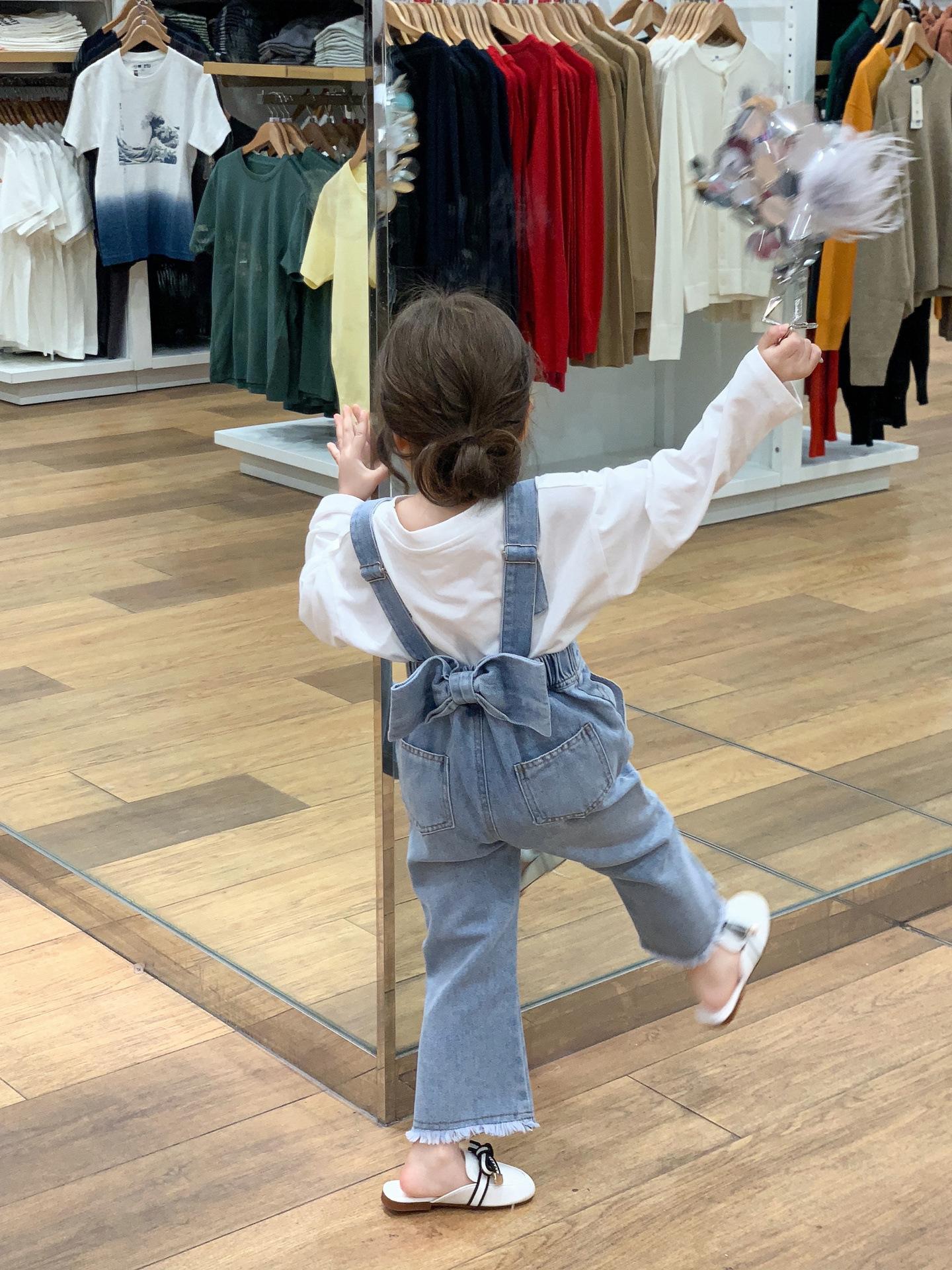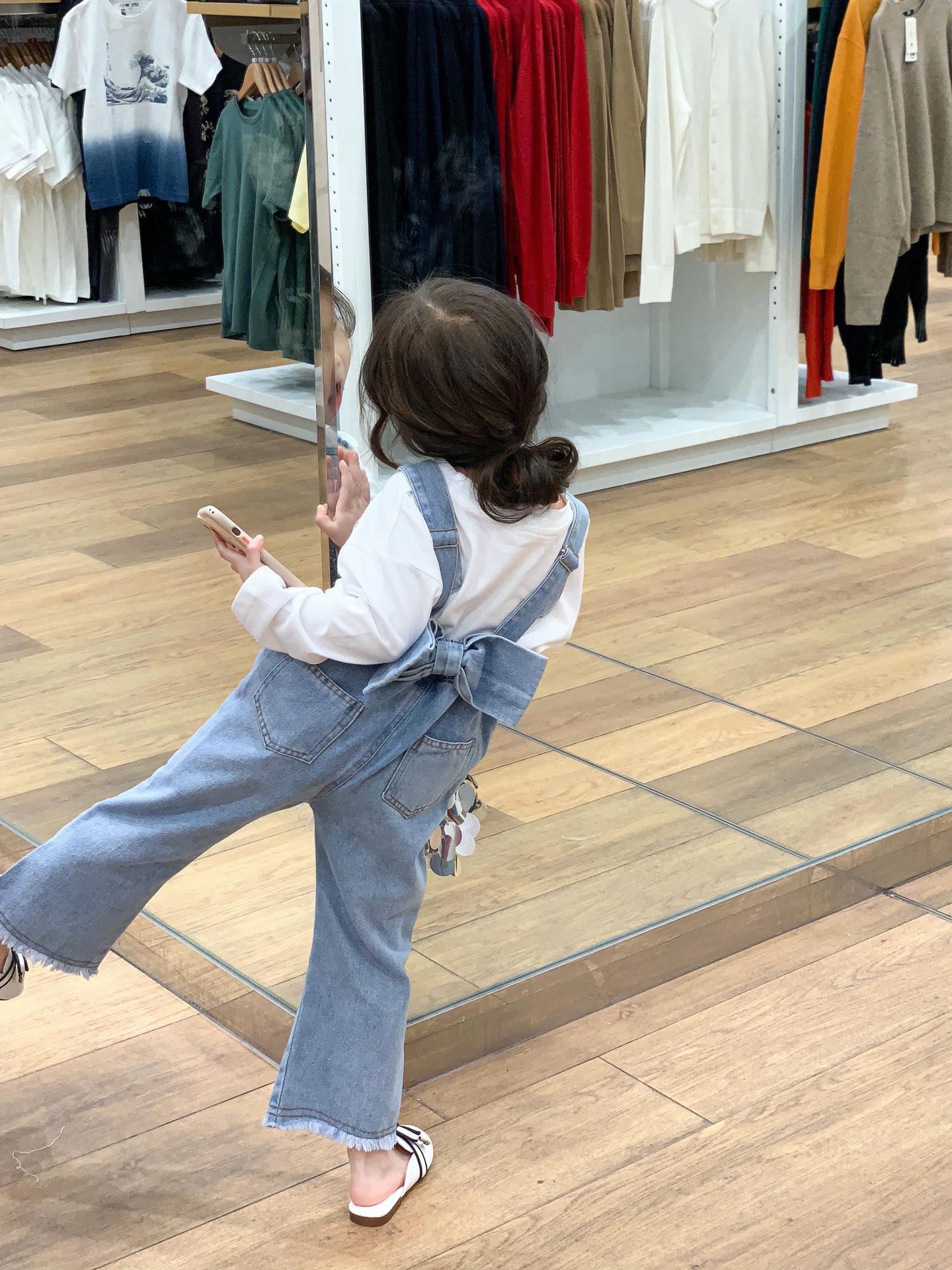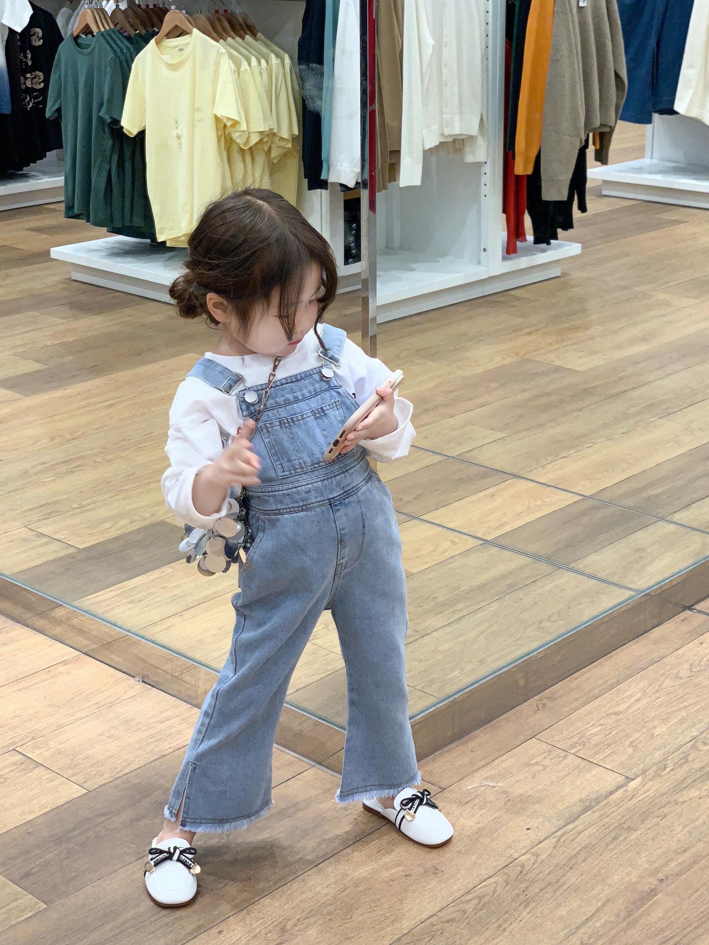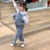 [Ordenar Racionalmente] Ropa de Primavera para Niñas Camiseta Básica de Color Puro + Pantalones de Mezclilla con Tirantes y Lazo para Niños Pequeños y Medianos