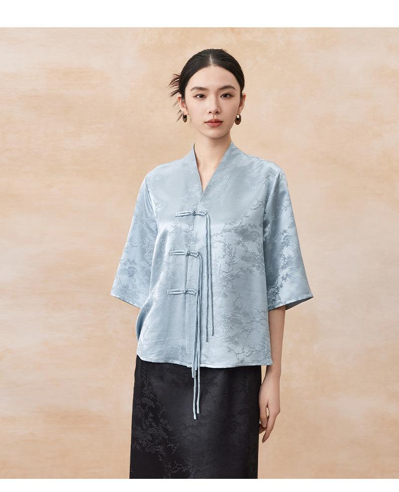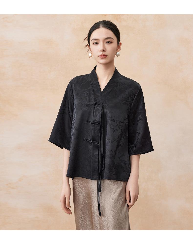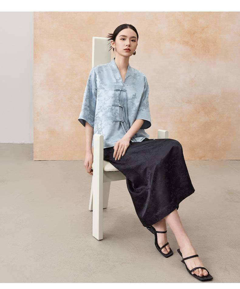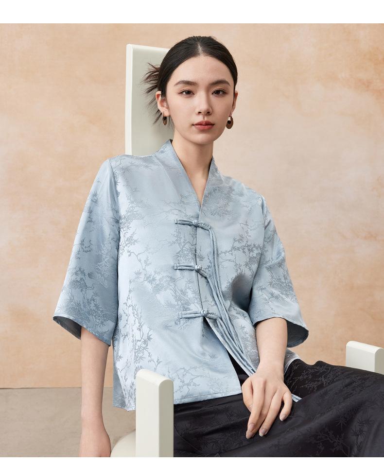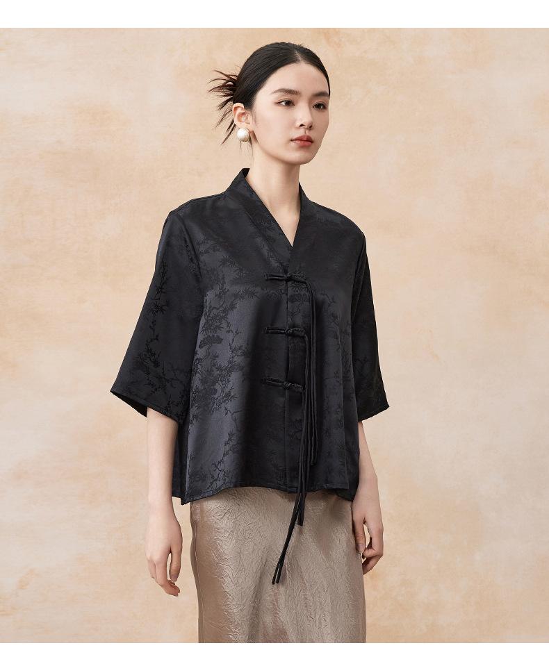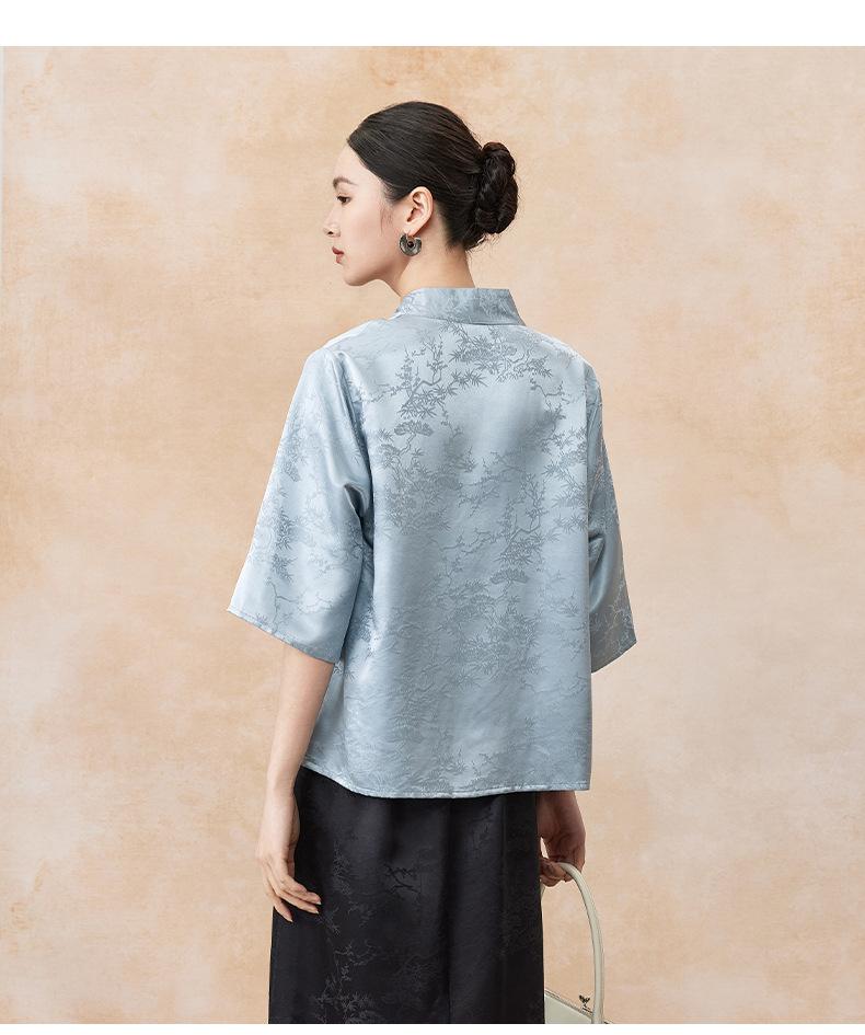 Blusas Chinoiserie Nuevas para Mujer Verano Estilo Nacional Abotonada Manga Tres Cuartos Camisa Top de Seda de 28 mm Camisa de Seda de Morera