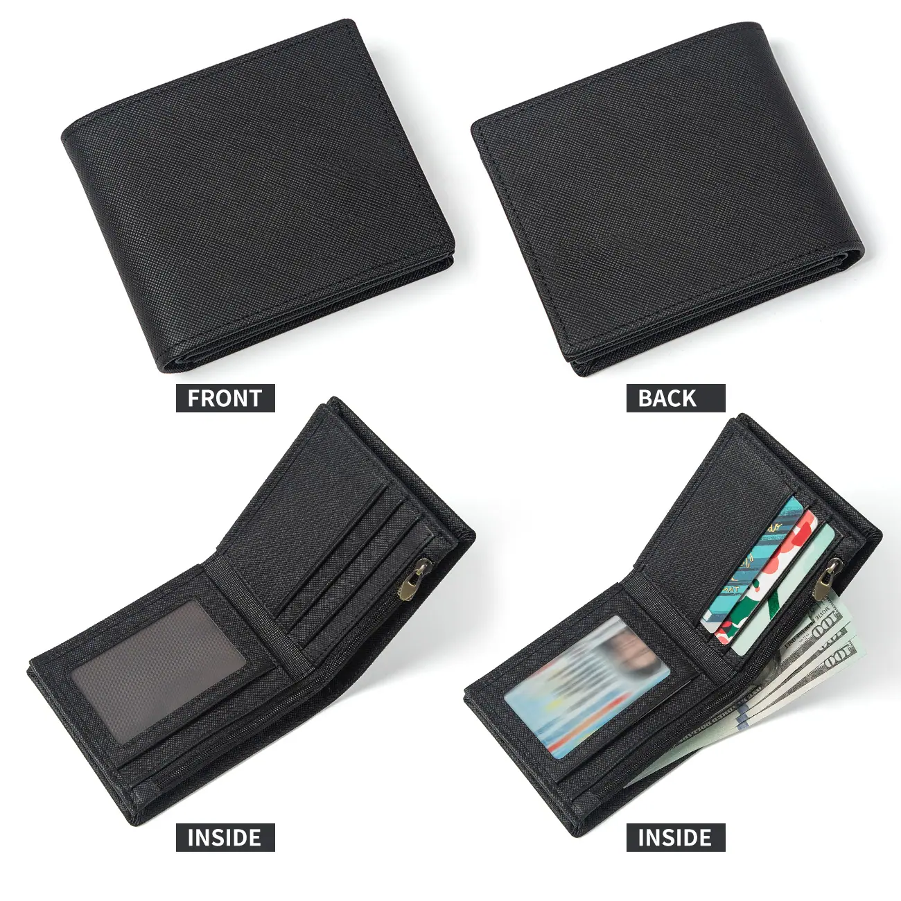 [Estructura]: ranura para tarjetas x3, ranura grande para billetes x1, ranura pequeña para billetes x1, compartimento con cremallera x1, compartimento oculto x2, ventana para fotos x1