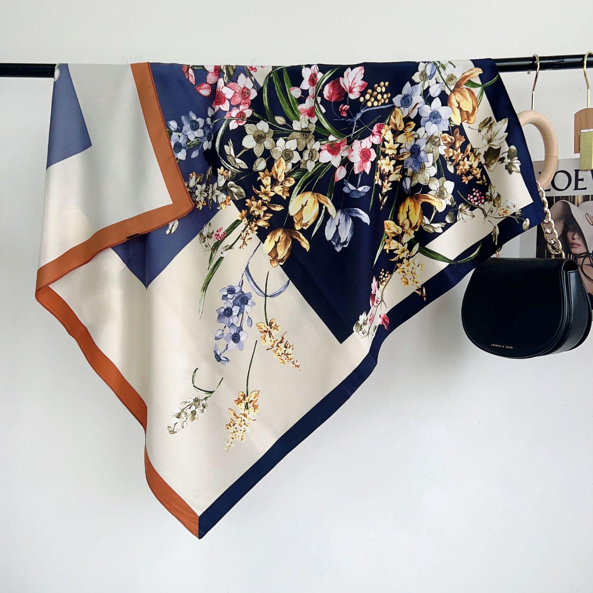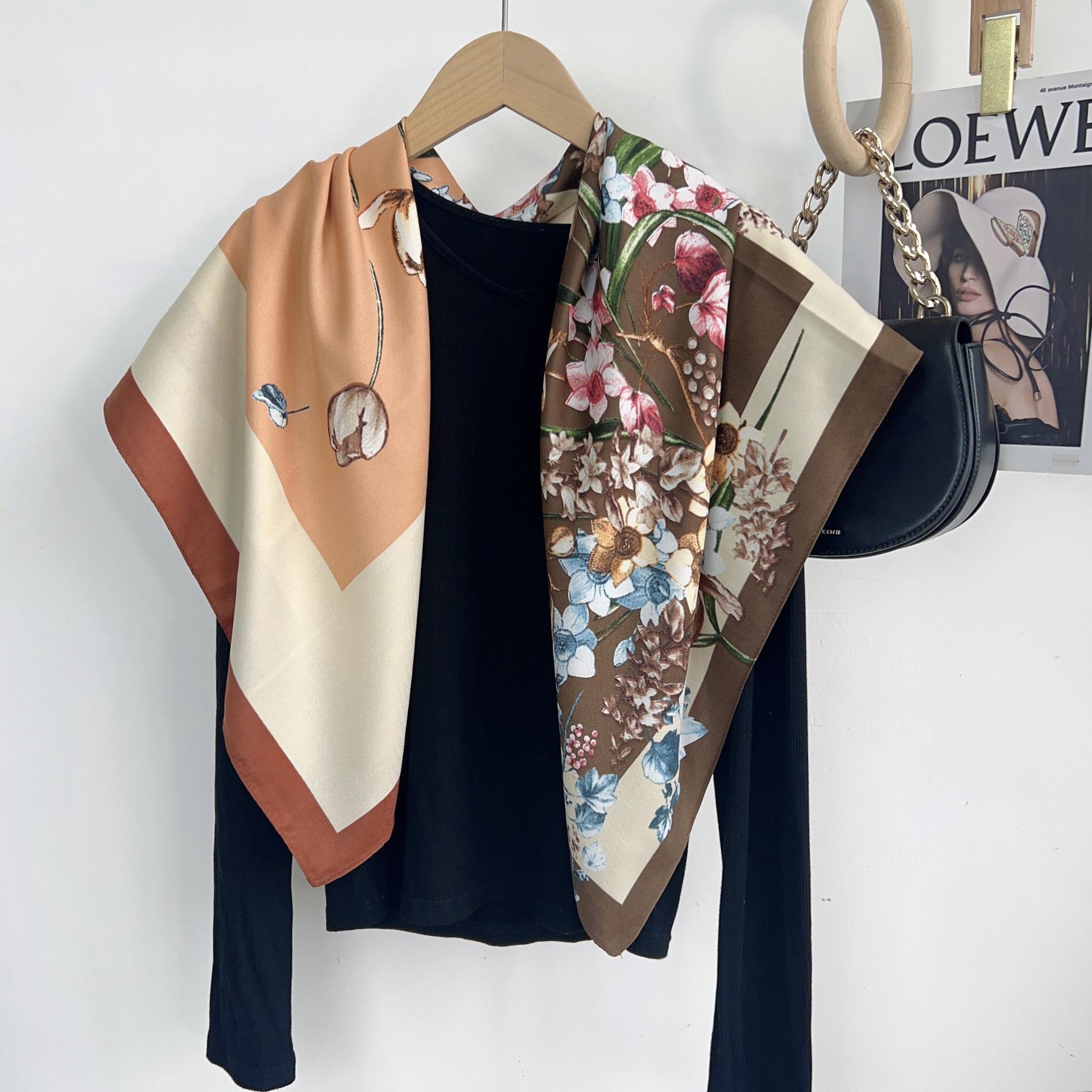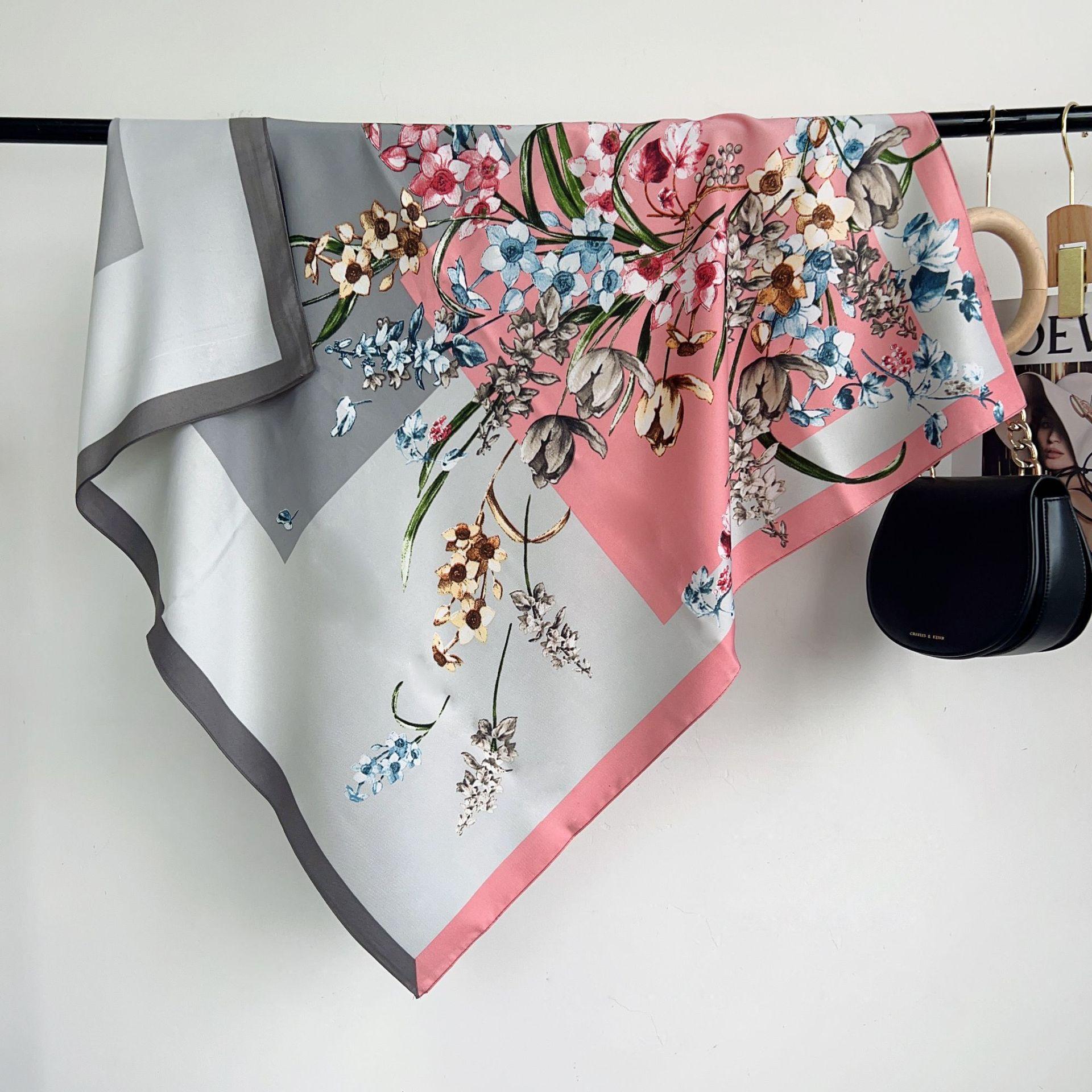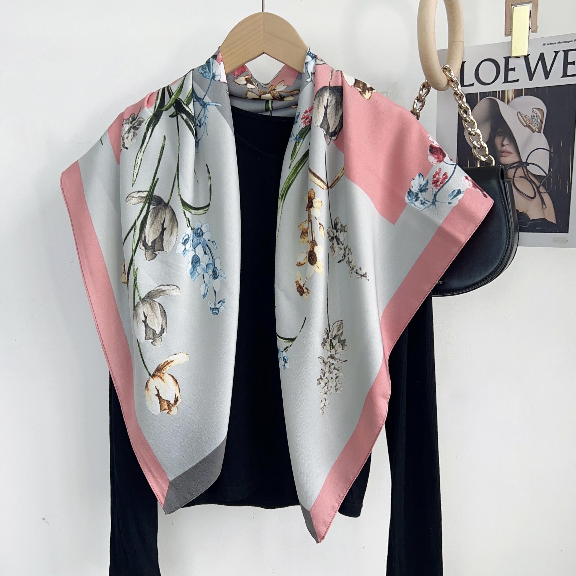Bufanda de Seda Floral de Moda Estilo Coreano para Mujer 2025 Nuevo Estilo Lazo para el Cabello Pañuelo para la Cabeza Verano Viaje Playa Protección Solar Bufanda Cuadrada Grande