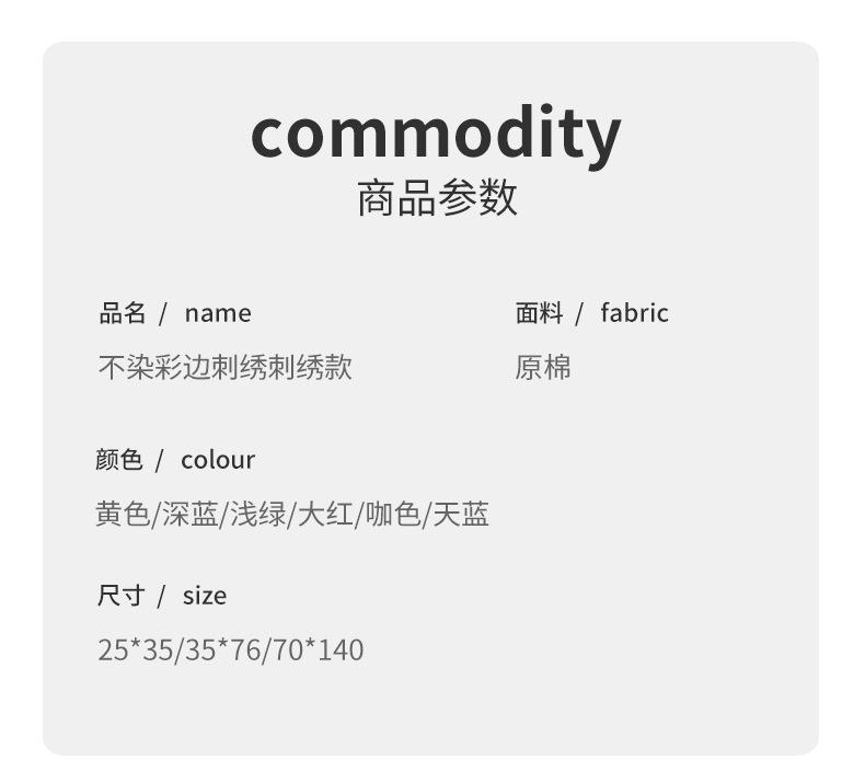 Square towel 25*35 60g, Face towel 35*76 150g, Bath towel 70*140 620g